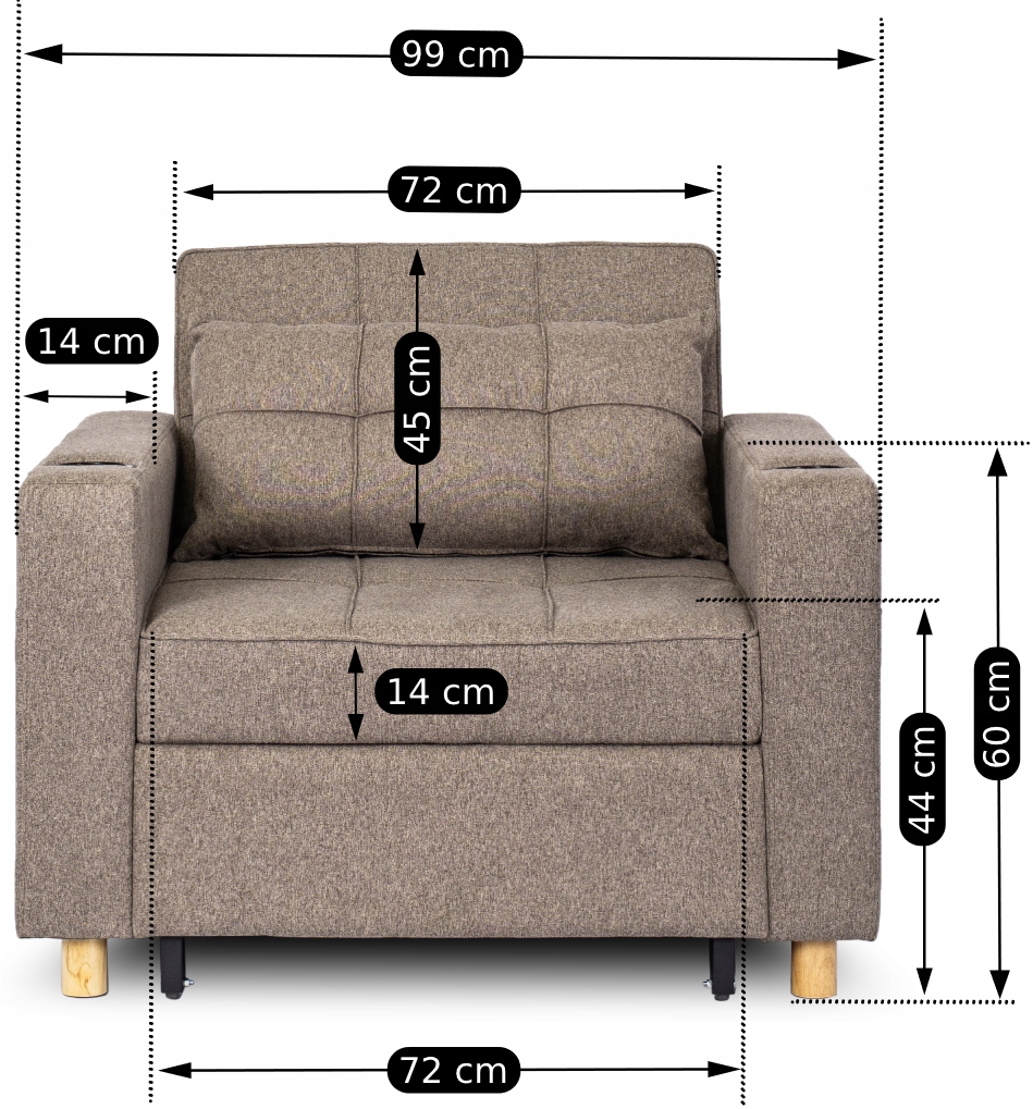 ✅ Funkcja spania - rozkładana sofa z funkcją spania zapewni miejsce o wymiarach 72x186 cm, na którym swobodnie wyśpi się jedna osoba.