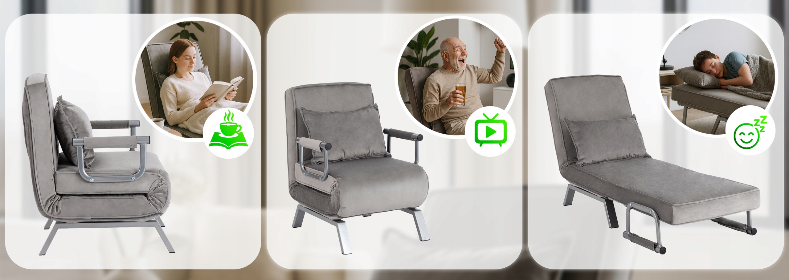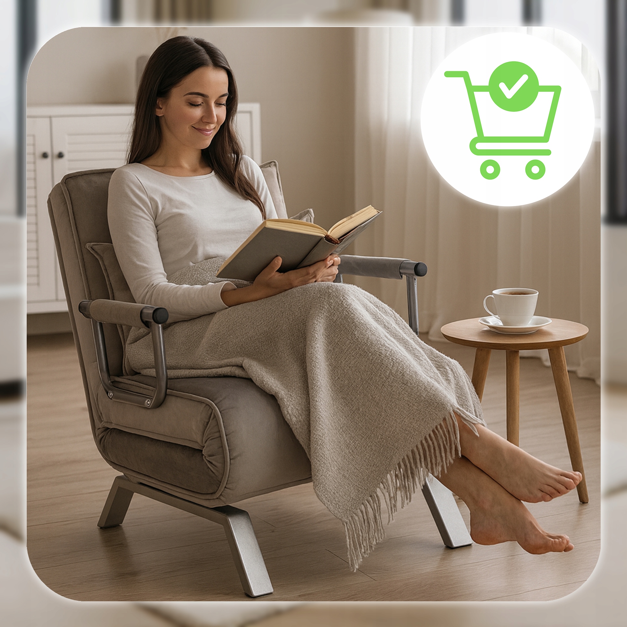 - Wszechstronność 3w1 – fotel, leżanka i łóżko w jednym.