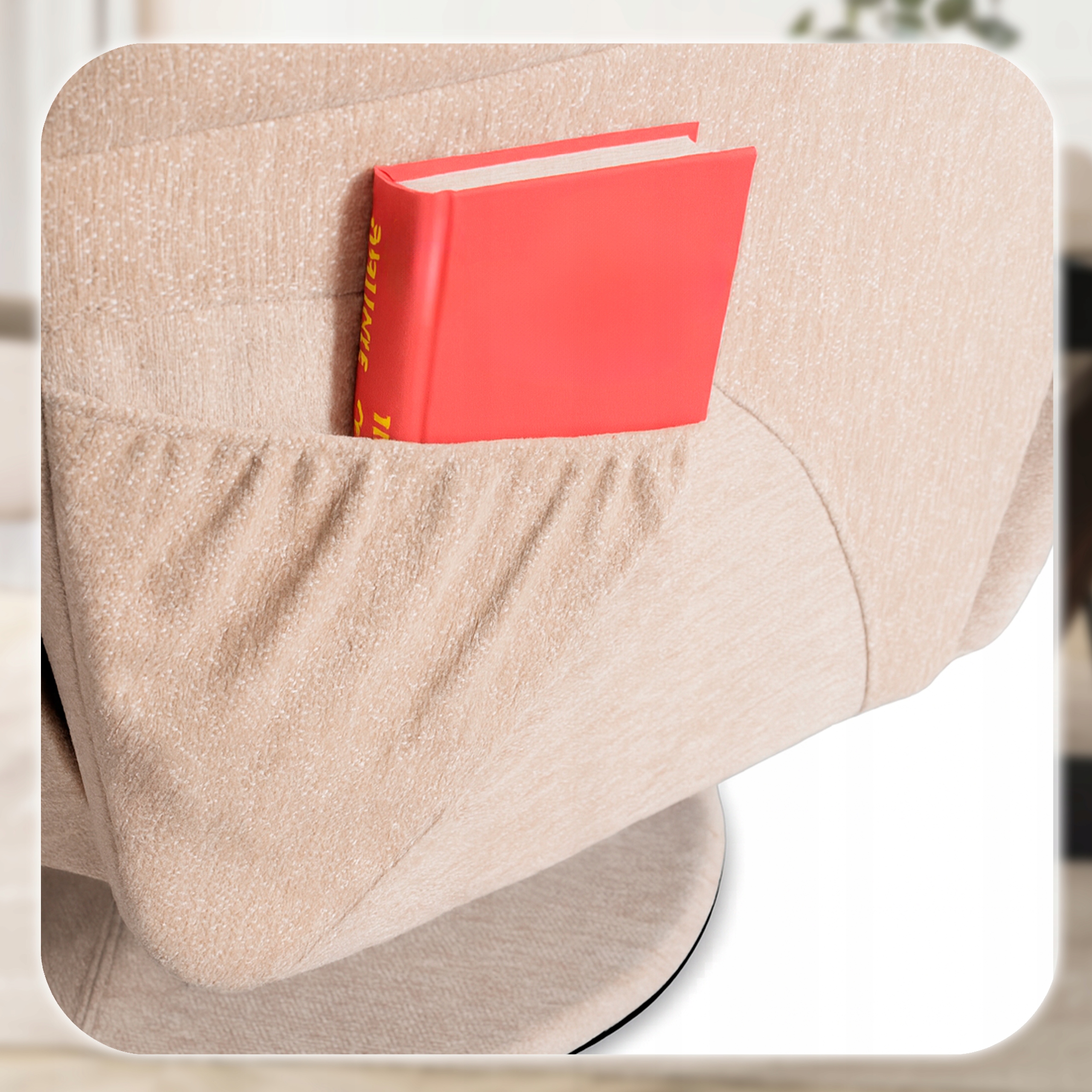 Fotel został zaprojektowany z myślą o codziennym komforcie i wygodzie użytkowania. Duża kieszeń to idealny schowek na najpotrzebniejsze drobiazgi – pilot do telewizora, ulubioną książkę, okulary, ładowarkę.