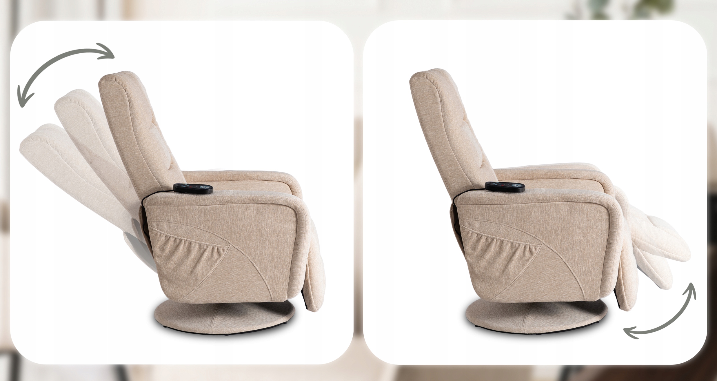 - Rozkładane oparcie i wysuwany podnóżek – wygodny wypoczynek w pozycji siedzącej, półleżącej lub leżącej.