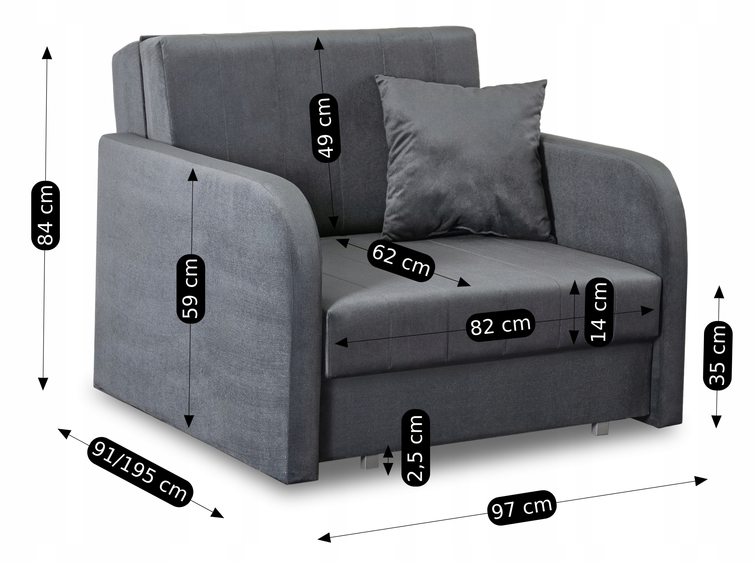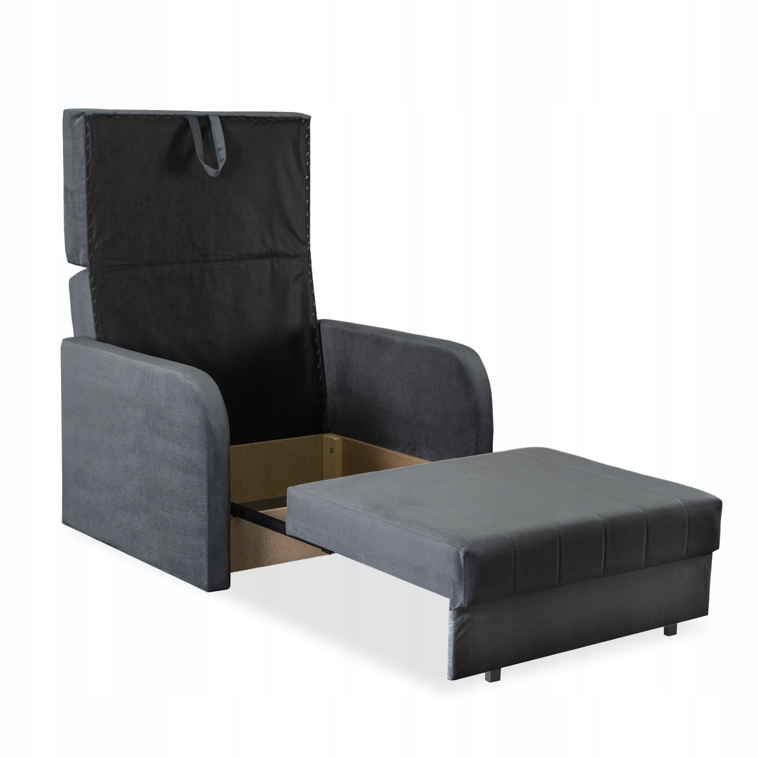Jedną z głównych zalet tego fotela jest funkcja spania, która pozwala na szybkie przekształcenie go w małe łóżko o wymiarach 195x82 cm.