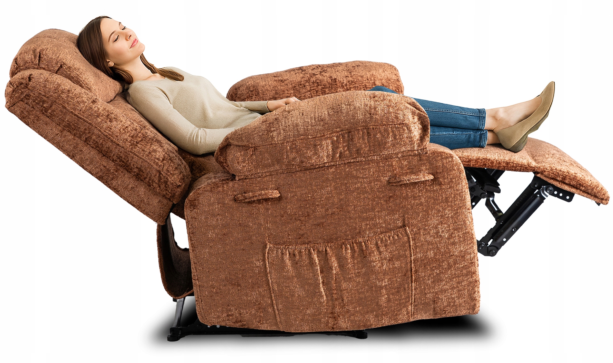Pozycja półsiedząca z uniesionym podnóżkiem – perfekcyjna do czytania, oglądania TV czy popołudniowej drzemki. Miękkie wypełnienie fotela otula ciało, a solidny, metalowy stelaż i cichy mechanizm zapewniają stabilność i wygodę użytkowania.