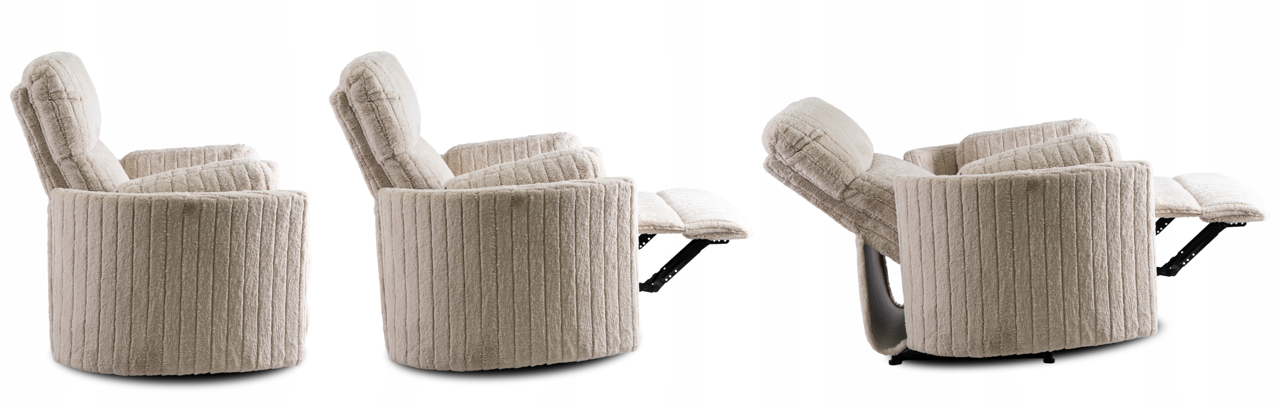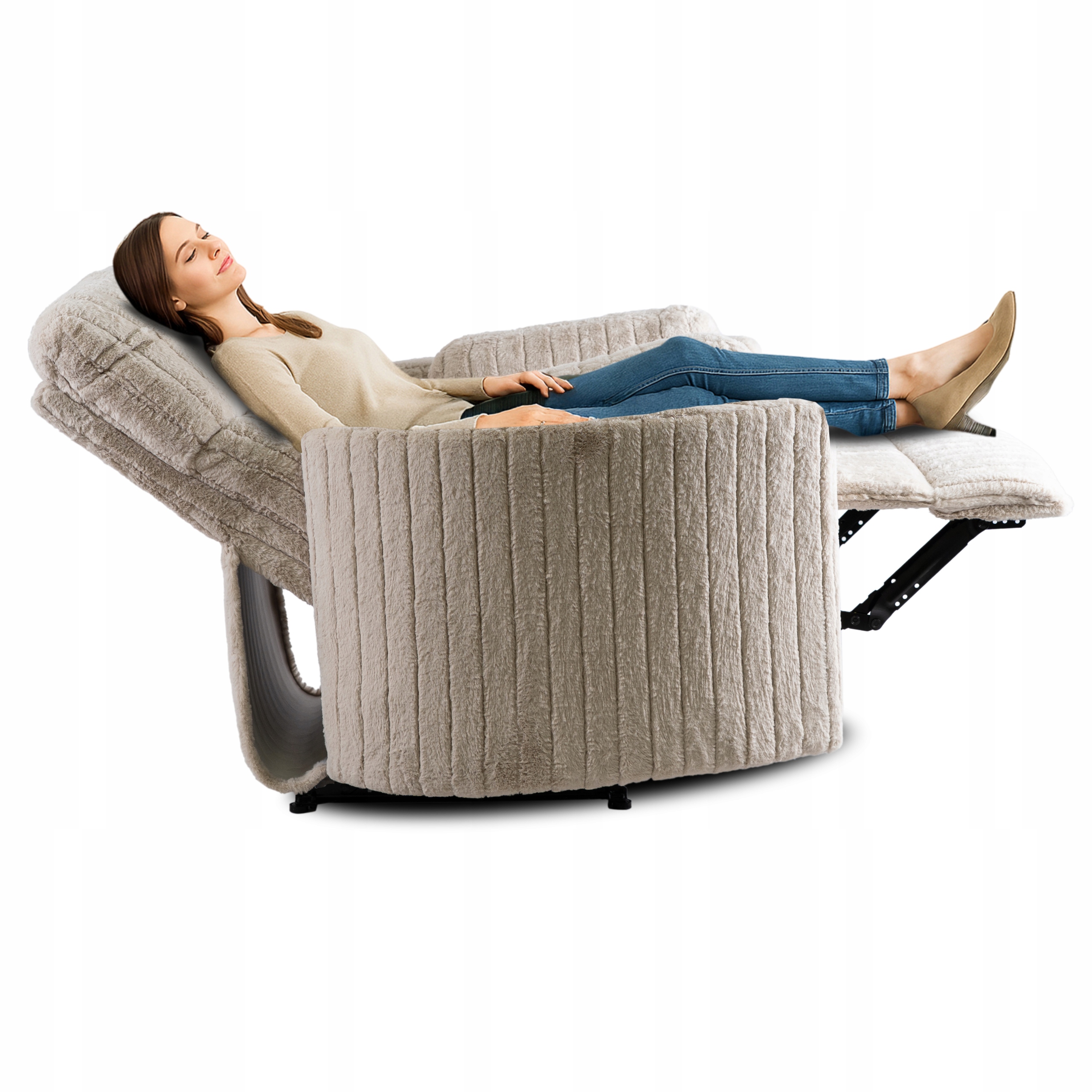 Pozycja półsiedząca z uniesionym podnóżkiem – perfekcyjna do czytania, oglądania TV czy popołudniowej drzemki. Miękkie wypełnienie fotela otula ciało, a solidny, metalowy stelaż i cichy mechanizm zapewniają stabilność i wygodę użytkowania.