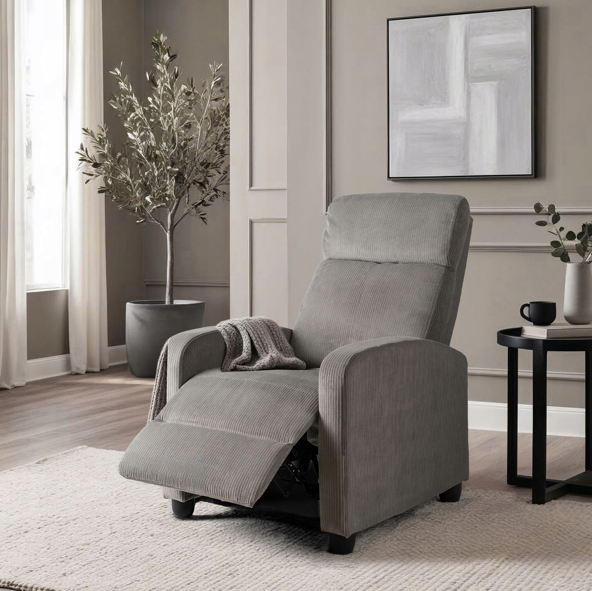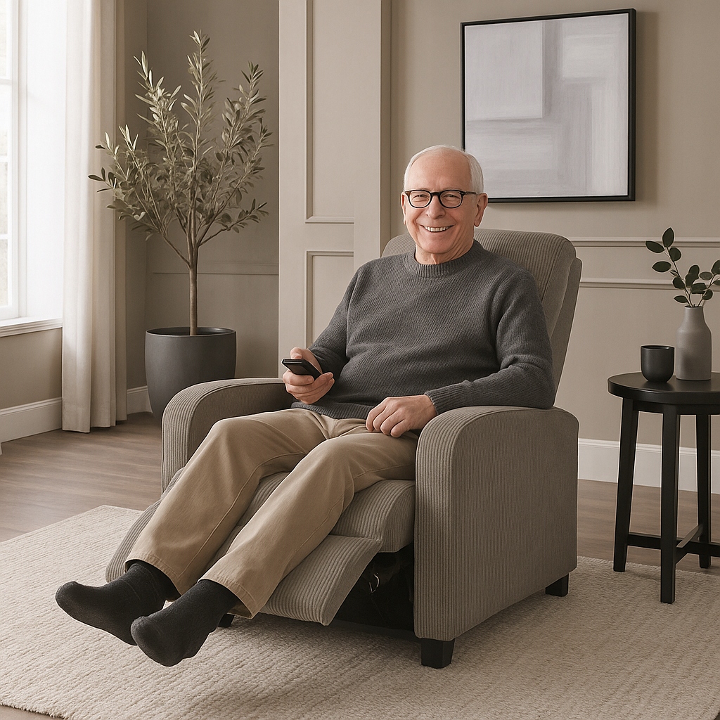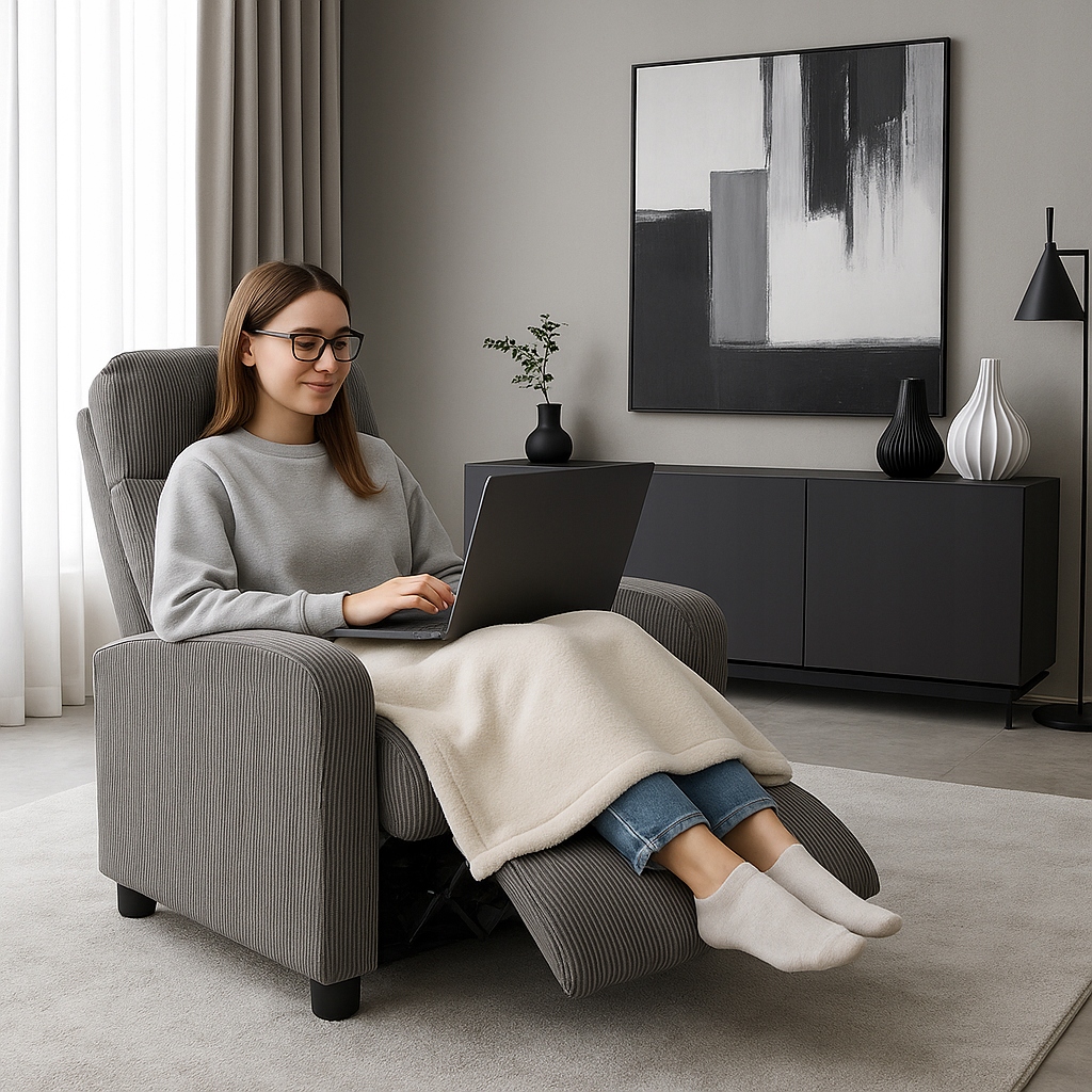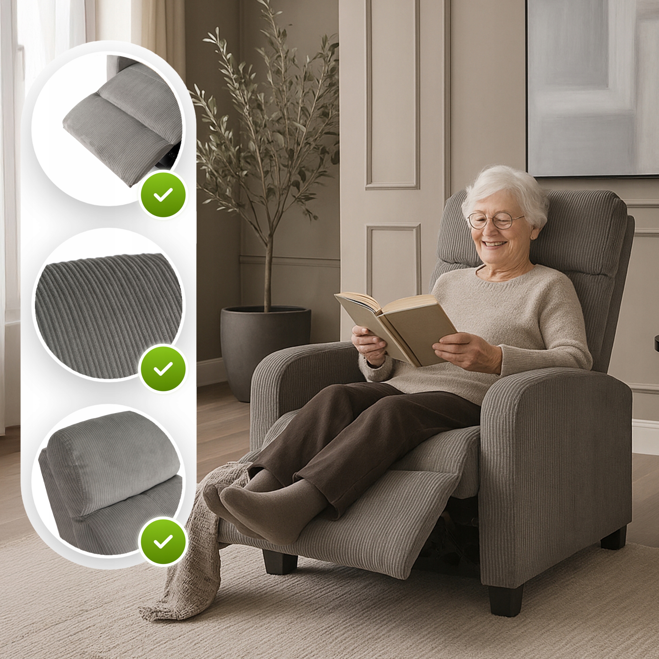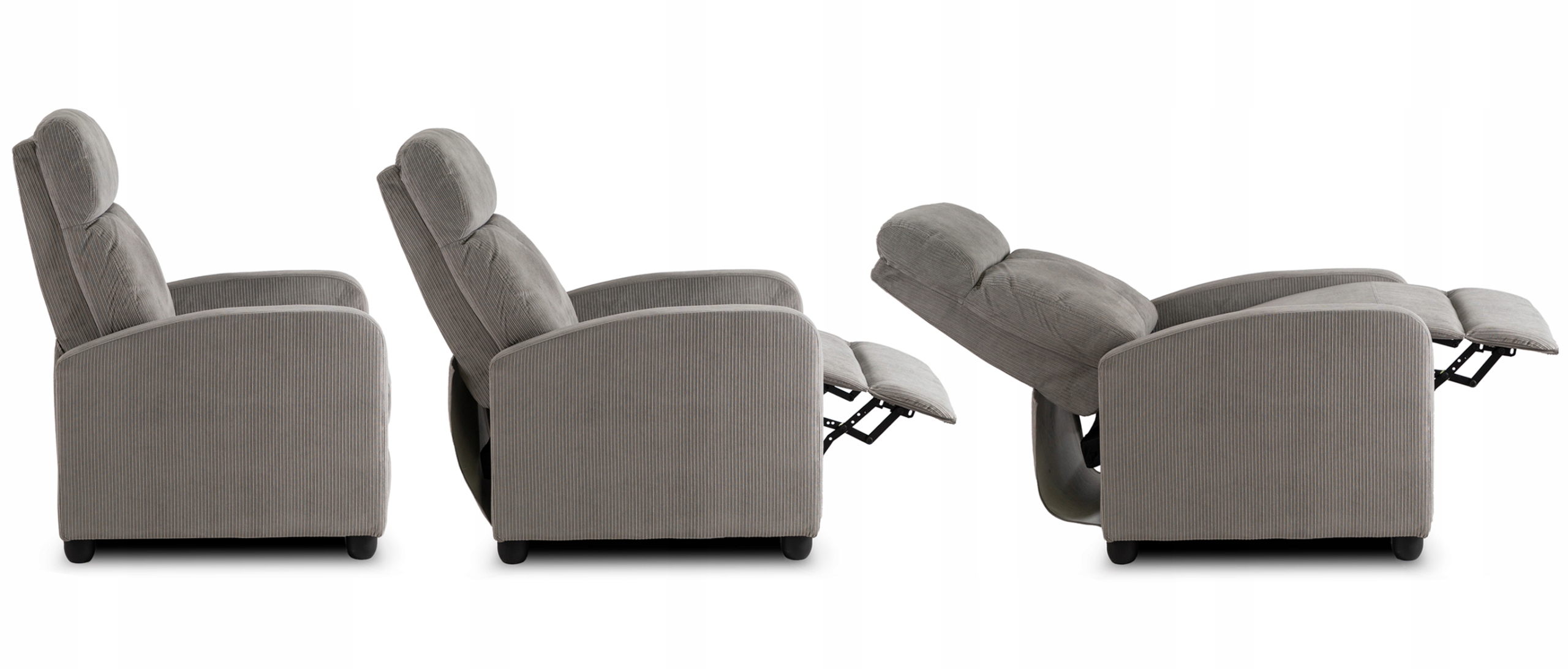 Nie musisz szarpać ani używać siły – wystarczy delikatny ruch ciała, by rozłożyć podnóżek i odchylić oparcie. To idealne rozwiązanie na chwilę relaksu, popołudniową drzemkę czy wieczorne oglądanie ulubionych filmów.