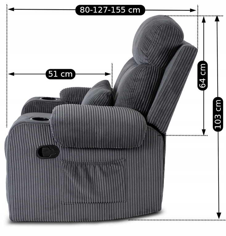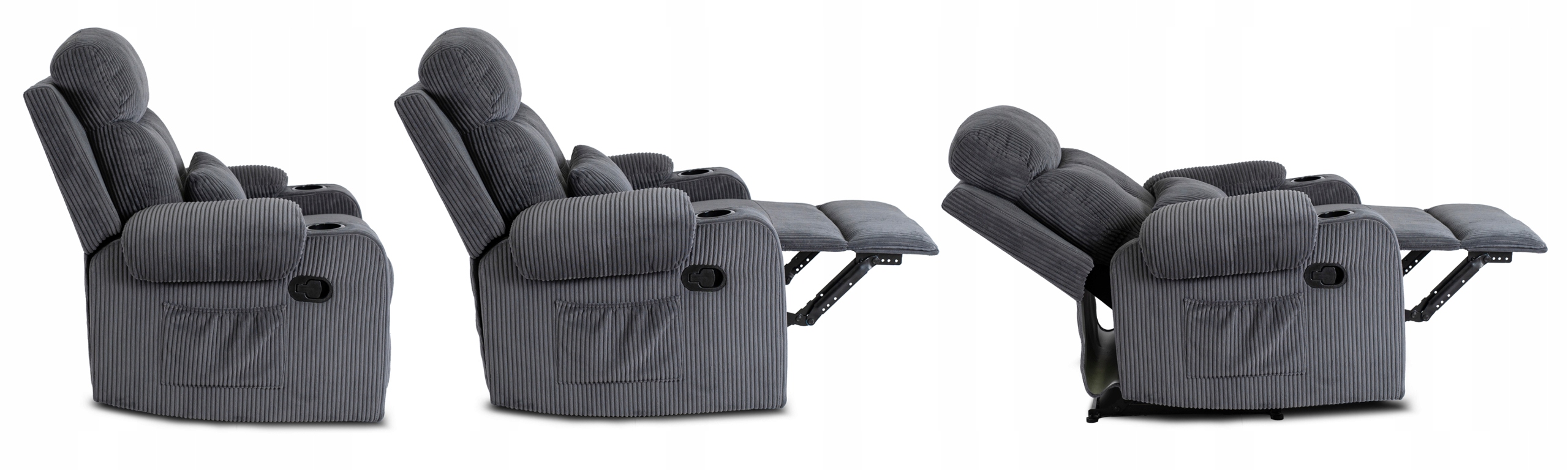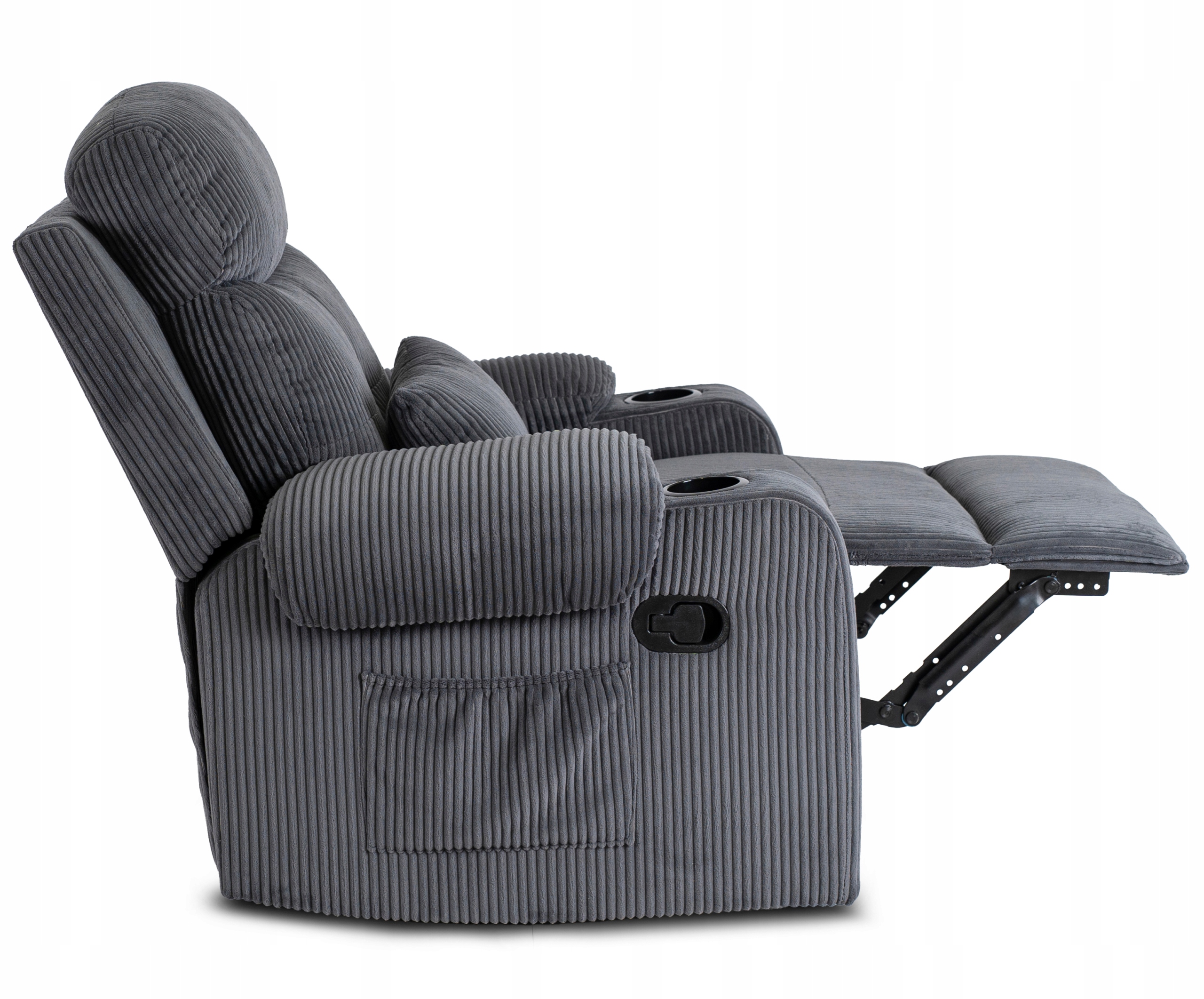 ✨ Z boku fotela znajduje się pojemna kieszeń na pilota, książkę lub inne drobiazgi, a na podłokietnikach umieszczono dwa uchwyty na napoje.
