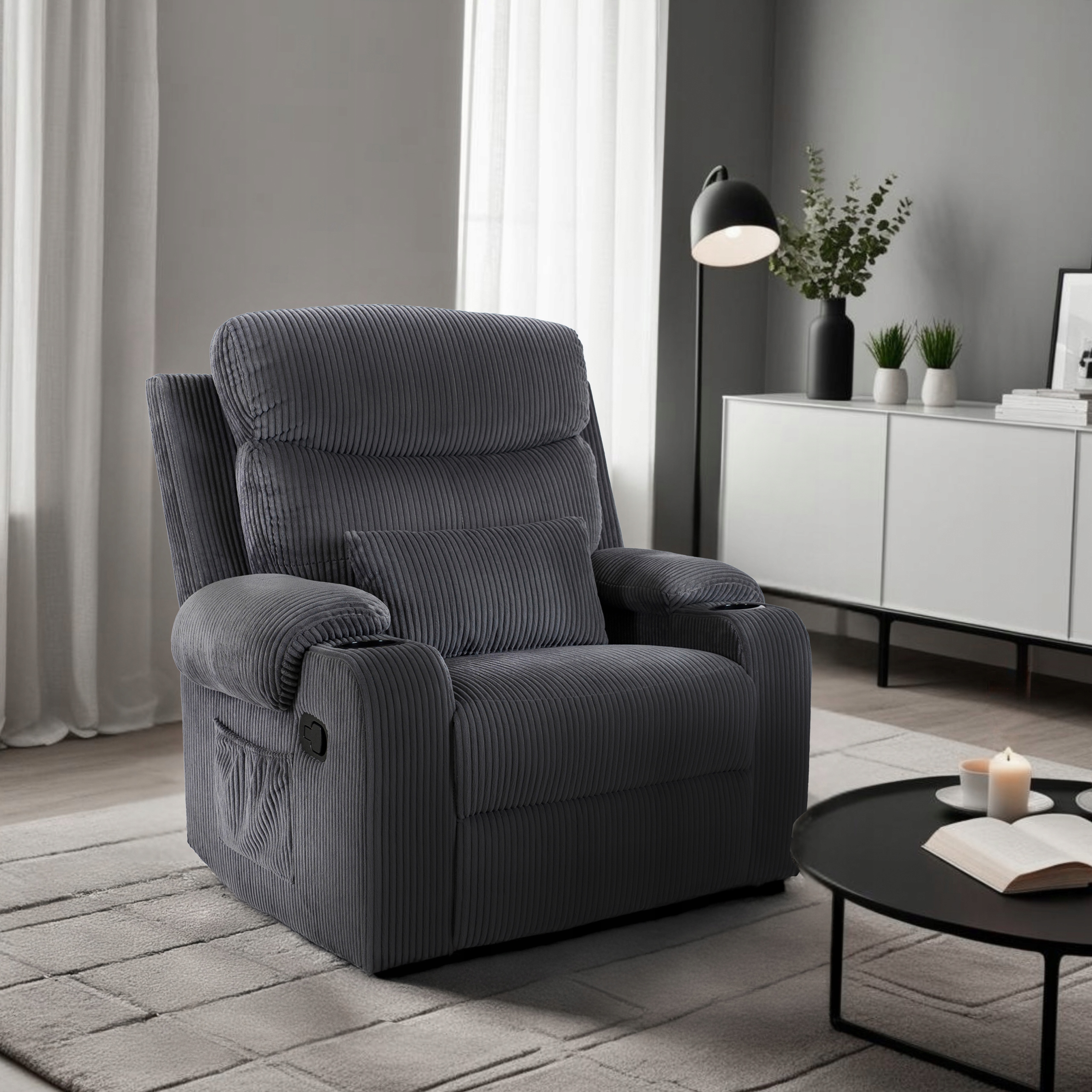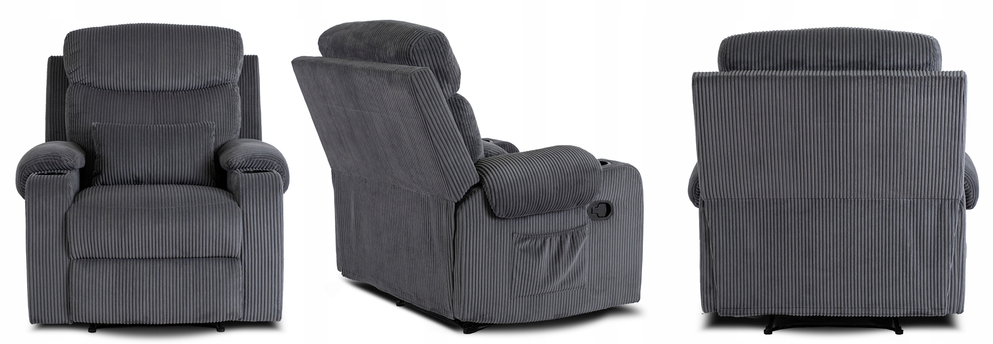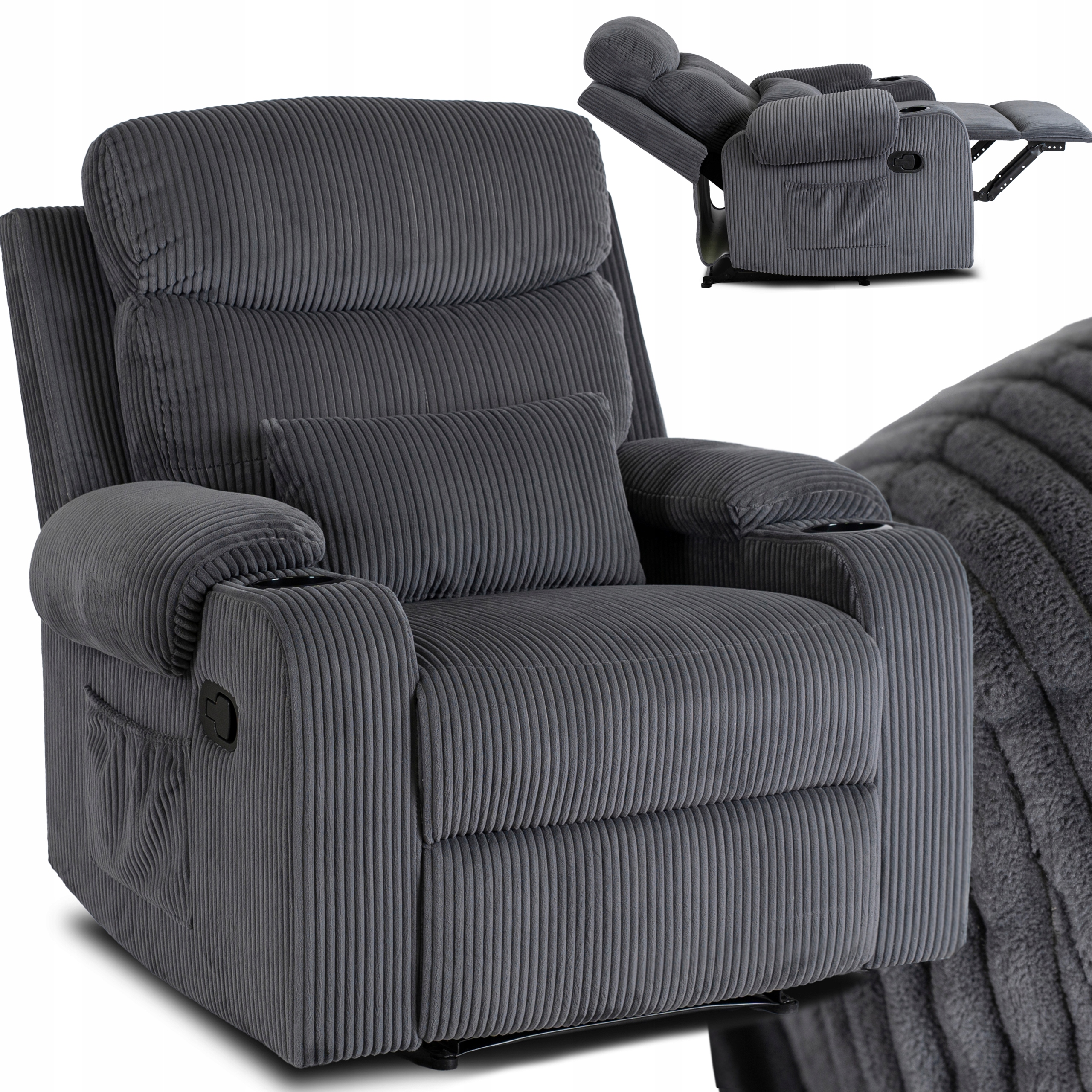 ✨ Z boku fotela znajduje się pojemna kieszeń na pilota, książkę lub inne drobiazgi, a na podłokietnikach umieszczono dwa uchwyty na napoje.