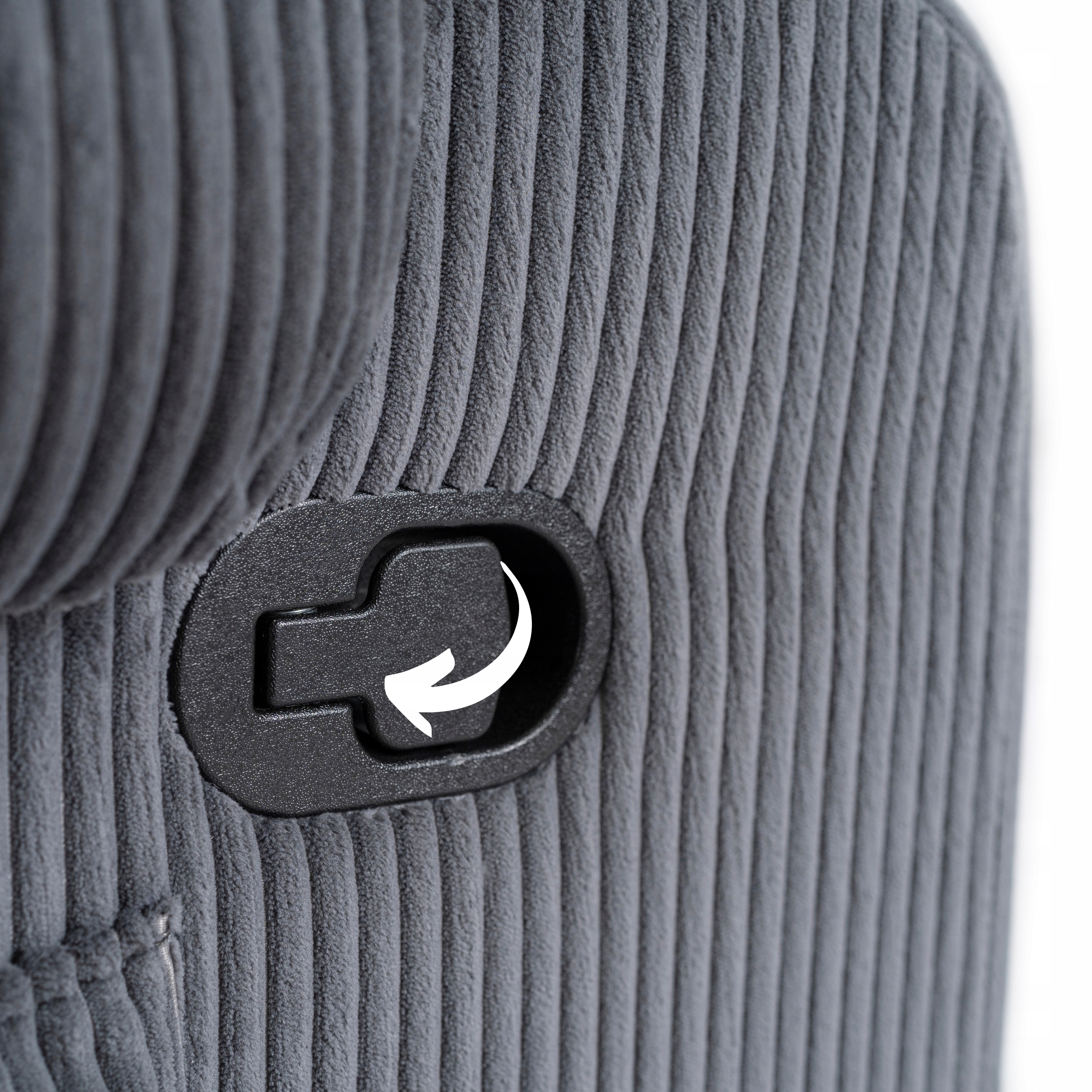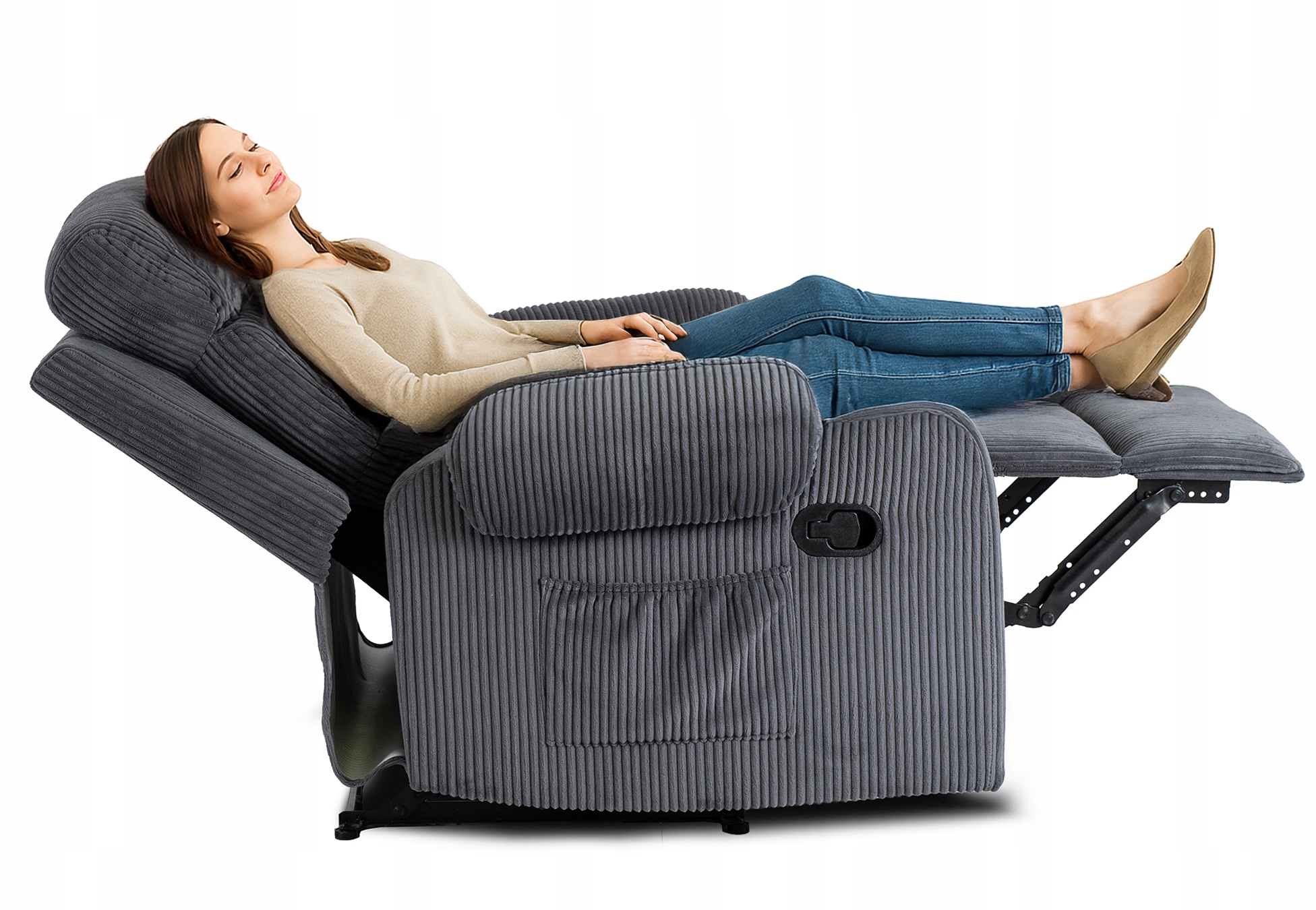 Pociągnij czarny uchwyt, który znajduje się na prawym boku fotela. Dzięki niemu płynnie i przyjemnie rozłożysz fotel do jednej z 3 wygodnych pozycji.
