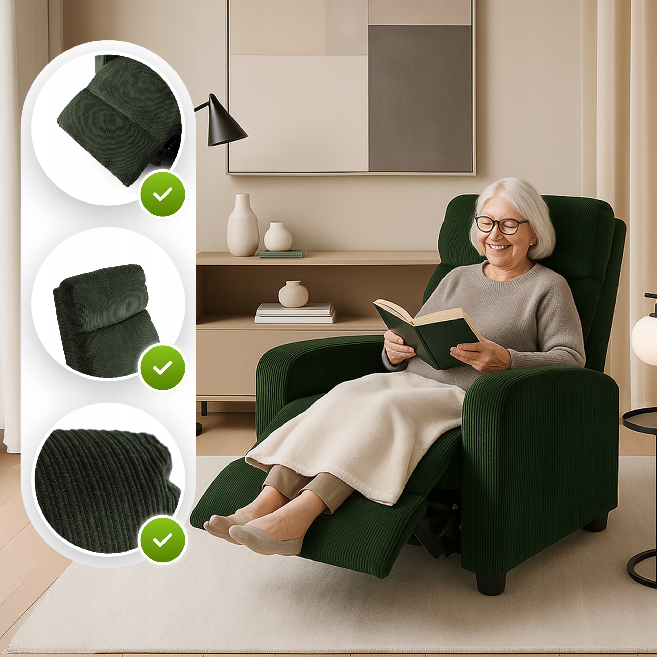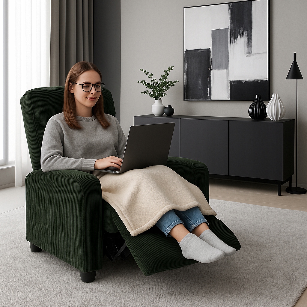 Nie musisz szarpać ani używać siły – wystarczy delikatny ruch ciała, by rozłożyć podnóżek i odchylić oparcie. To idealne rozwiązanie na chwilę relaksu, popołudniową drzemkę czy wieczorne oglądanie ulubionych filmów.