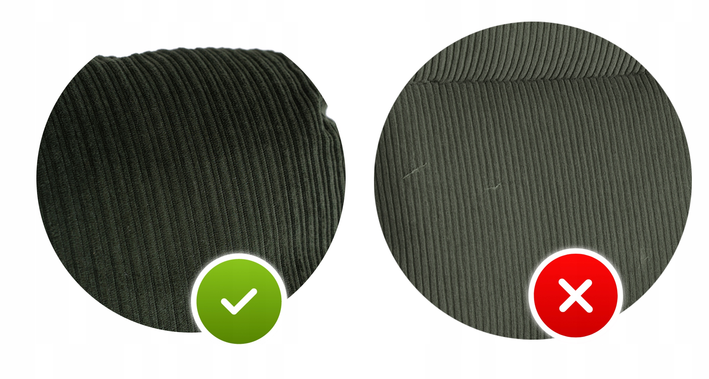 Po prawej natomiast przykład niskiej jakości – tkanina szybko się marszczy, mechaci i wyciera, a pojedyncze nitki zaczynają wychodzić już po krótkim czasie. Mebel traci na wyglądzie i sprawia wrażenie zużytego, mimo że nie był długo używany.