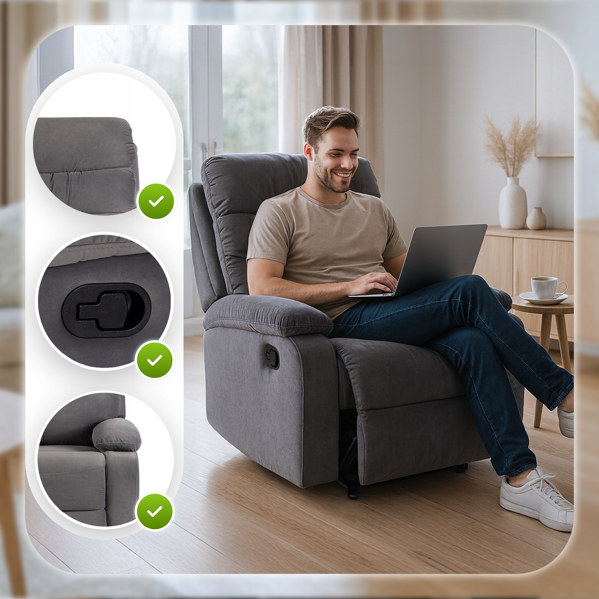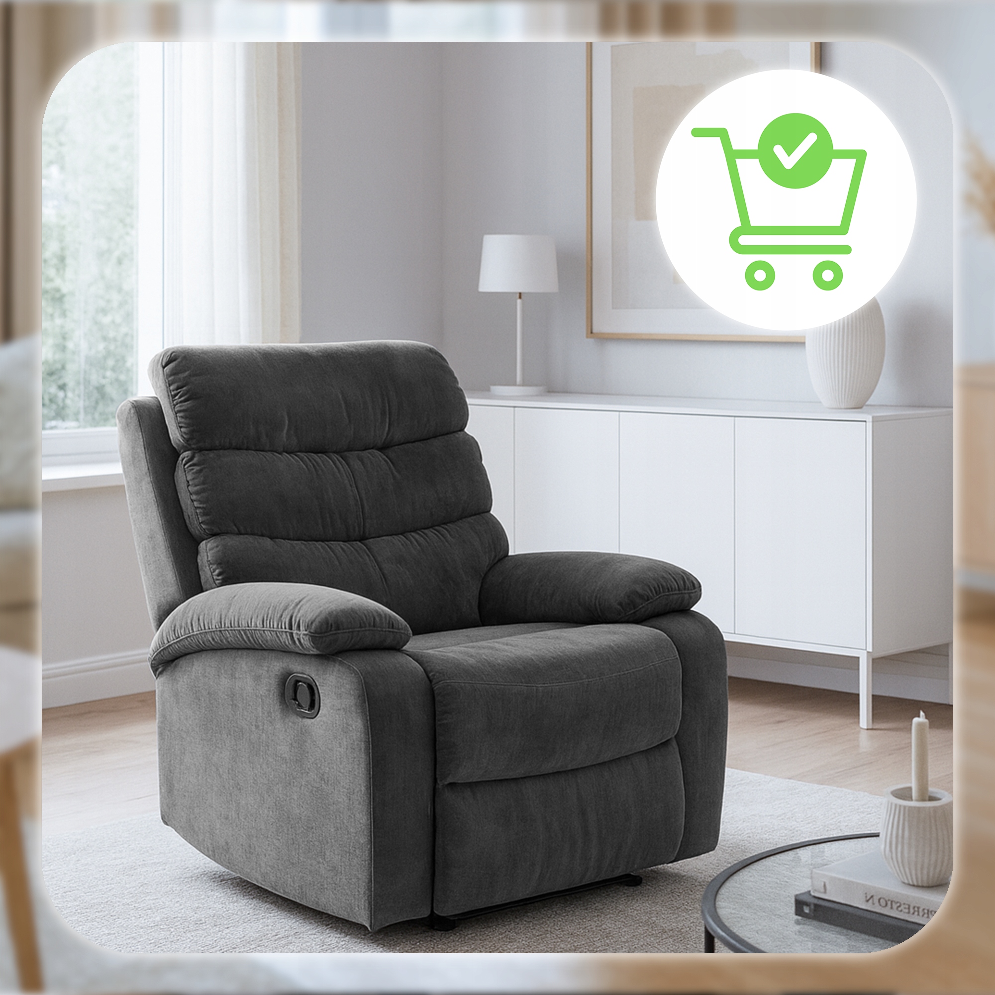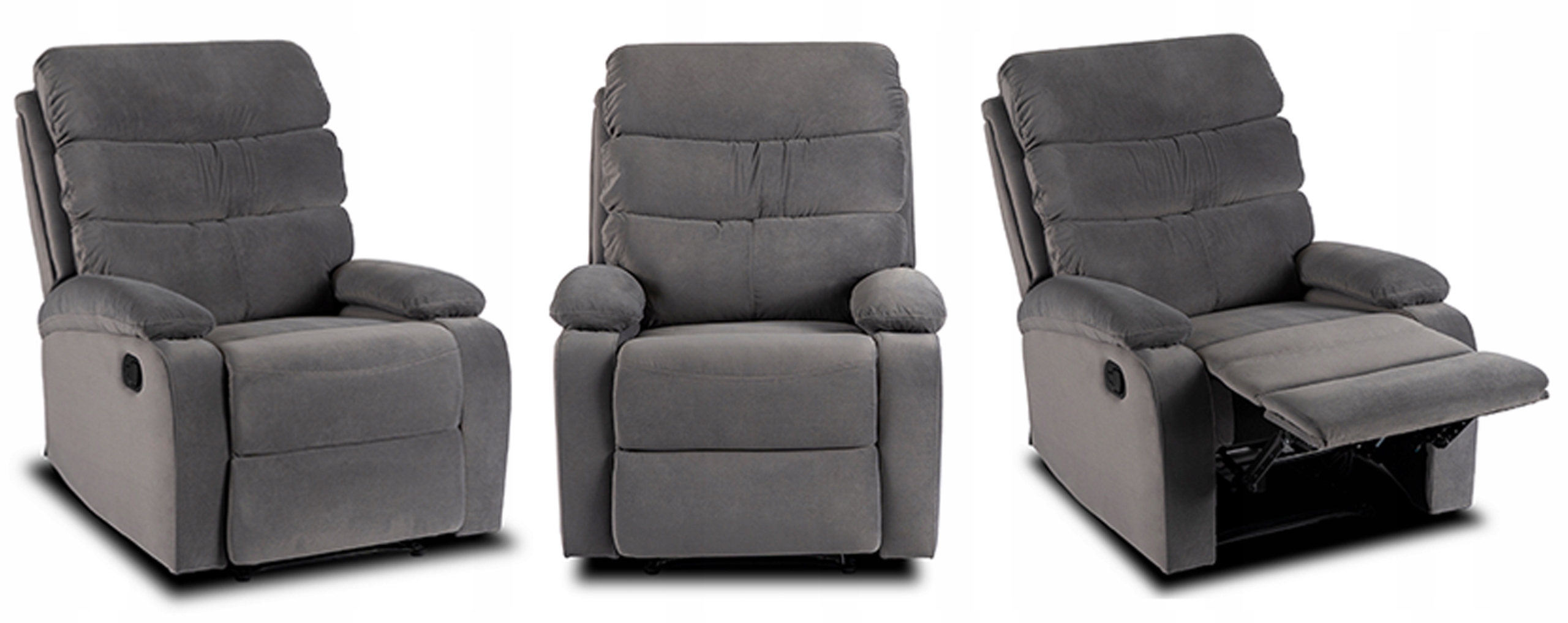 Prosty w obsłudze mechanizm sprawia, że jednym ruchem ustawisz fotel w wygodnej pozycji. Uniwersalny odcień szarości i elegancka, welurowa tkanina nadają mu ponadczasowy charakter, który pasuje do nowoczesnych i klasycznych wnętrz.