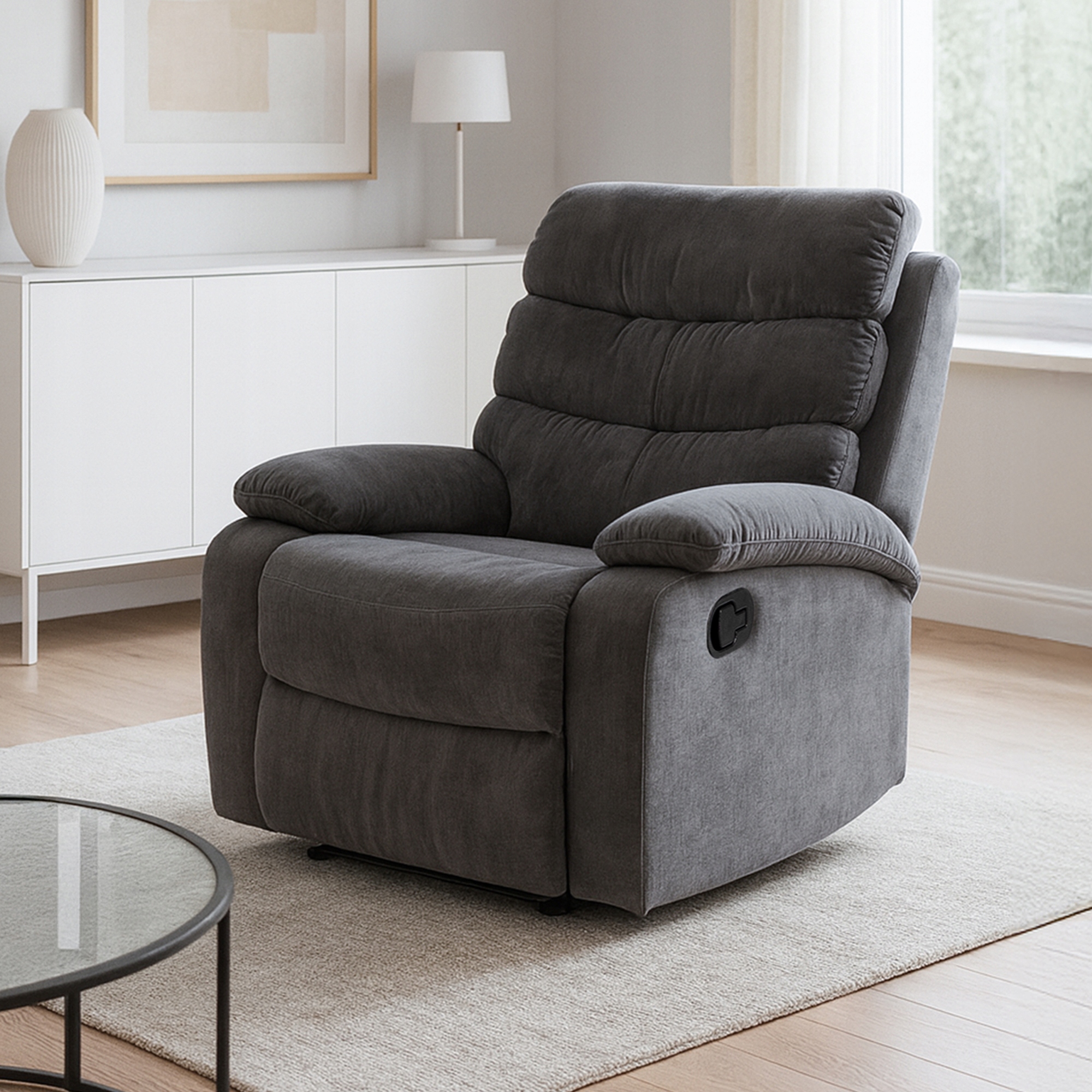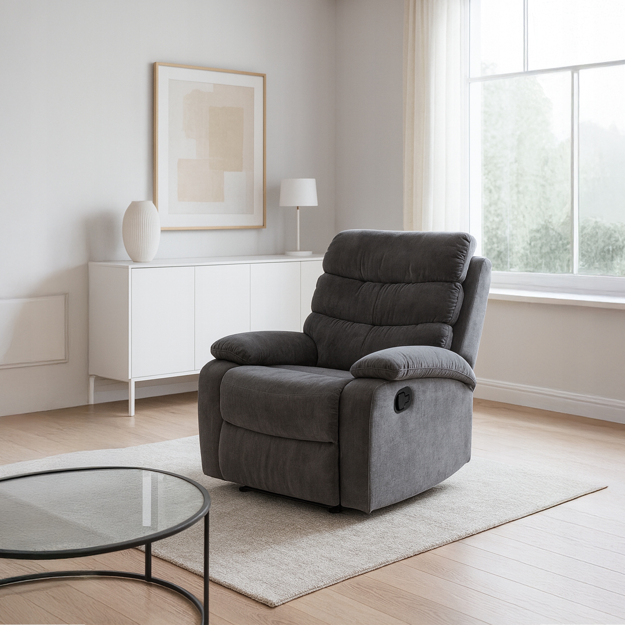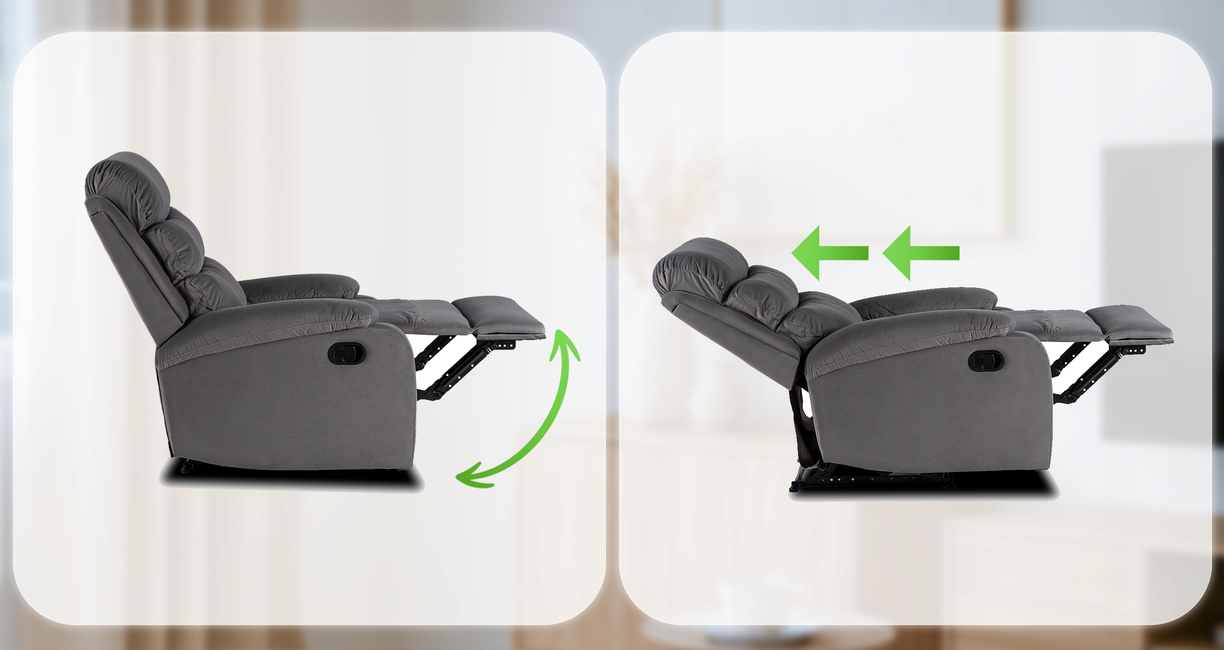 Prosty w obsłudze mechanizm sprawia, że jednym ruchem ustawisz fotel w wygodnej pozycji. Uniwersalny odcień szarości i elegancka, welurowa tkanina nadają mu ponadczasowy charakter, który pasuje do nowoczesnych i klasycznych wnętrz.