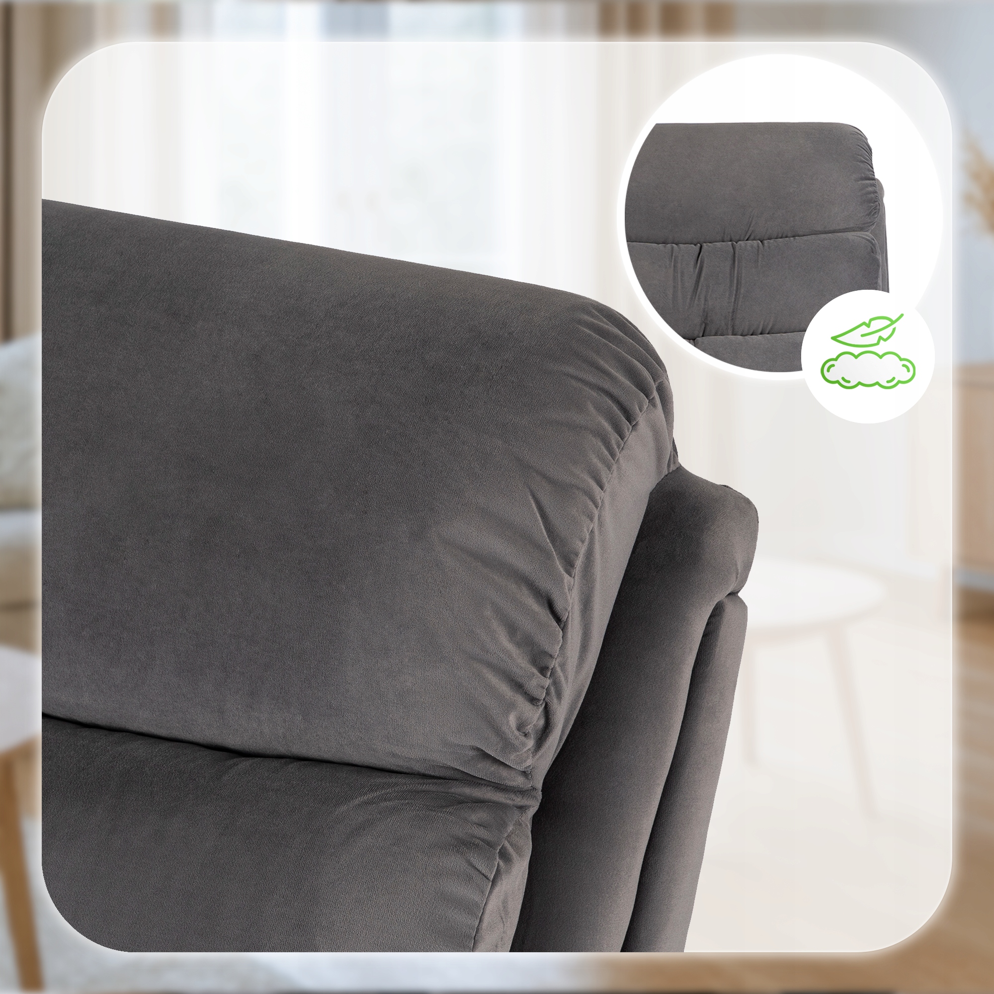 Fotel KOBE w kolorze popiel, tapicerowany miękkim welurem, to idealne miejsce do codziennego relaksu. Dzięki możliwości rozłożenia oparcia i podnóżka pozwala wypocząć w pozycji siedzącej, półleżącej lub leżącej.
