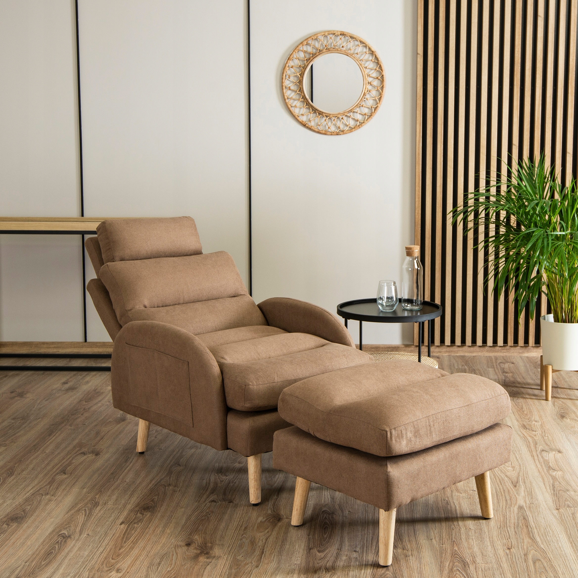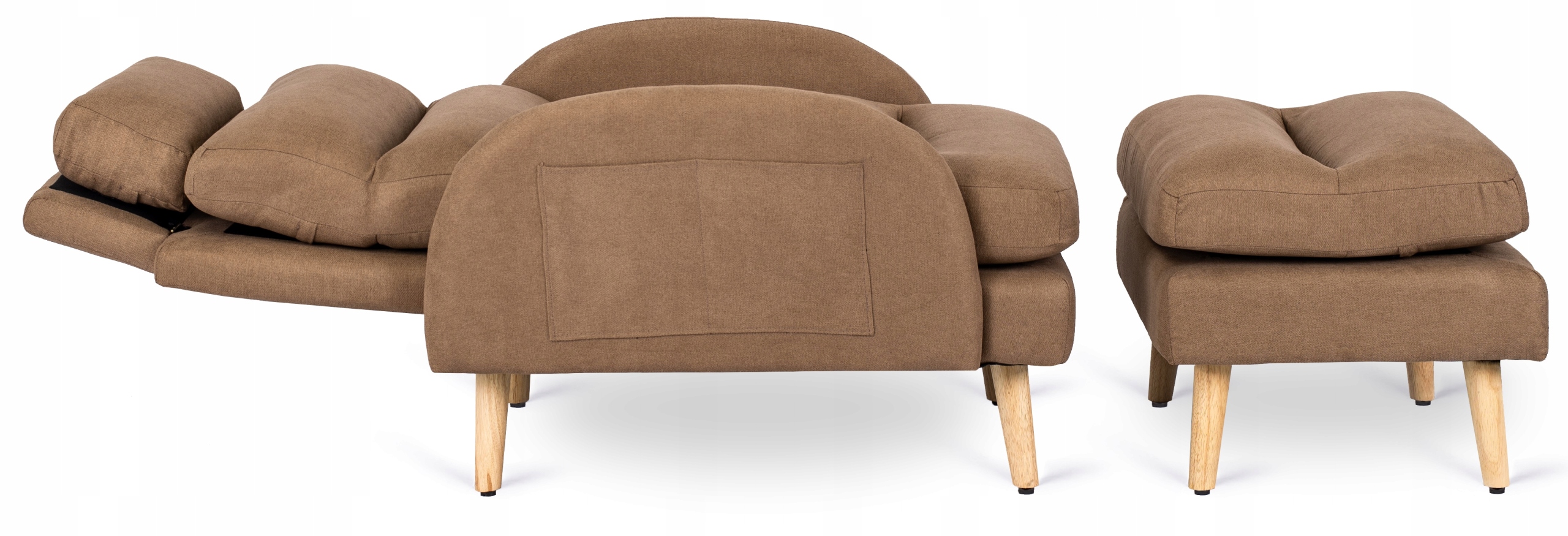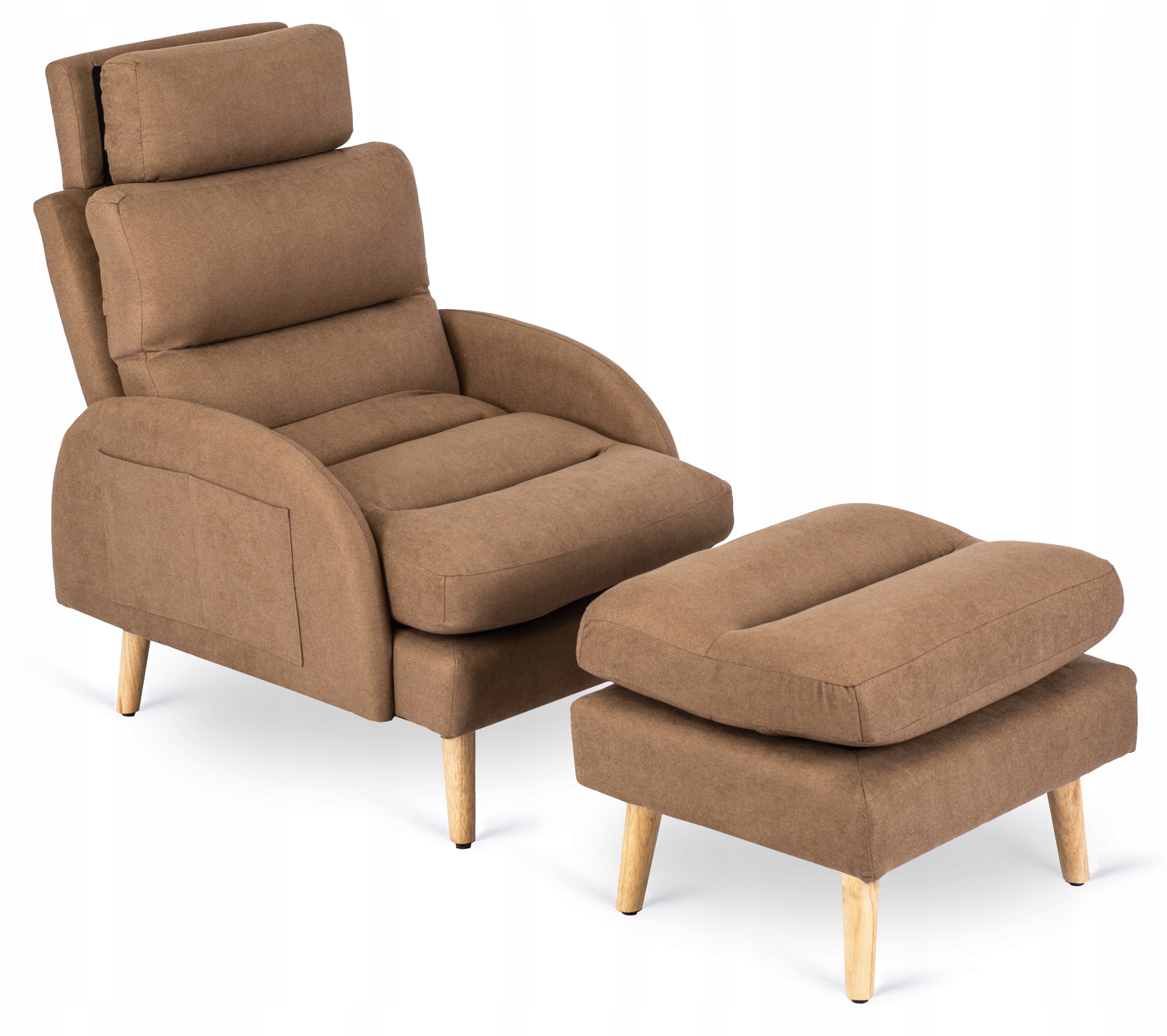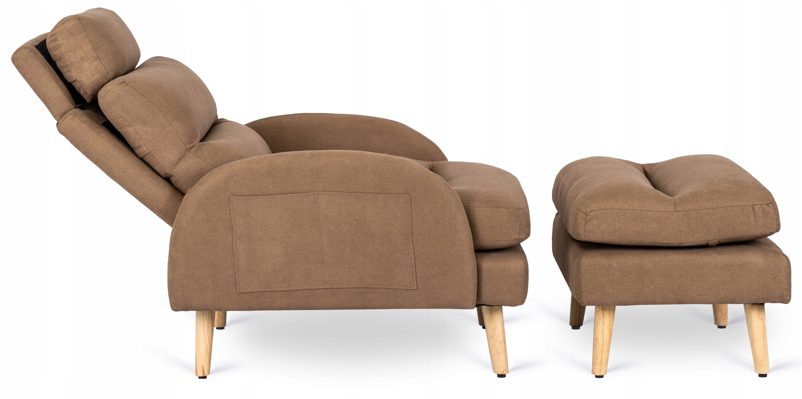 - Fotel wypoczynkowy z podnóżkiem HENRY w kolorze brązowym z dębowymi nóżkami