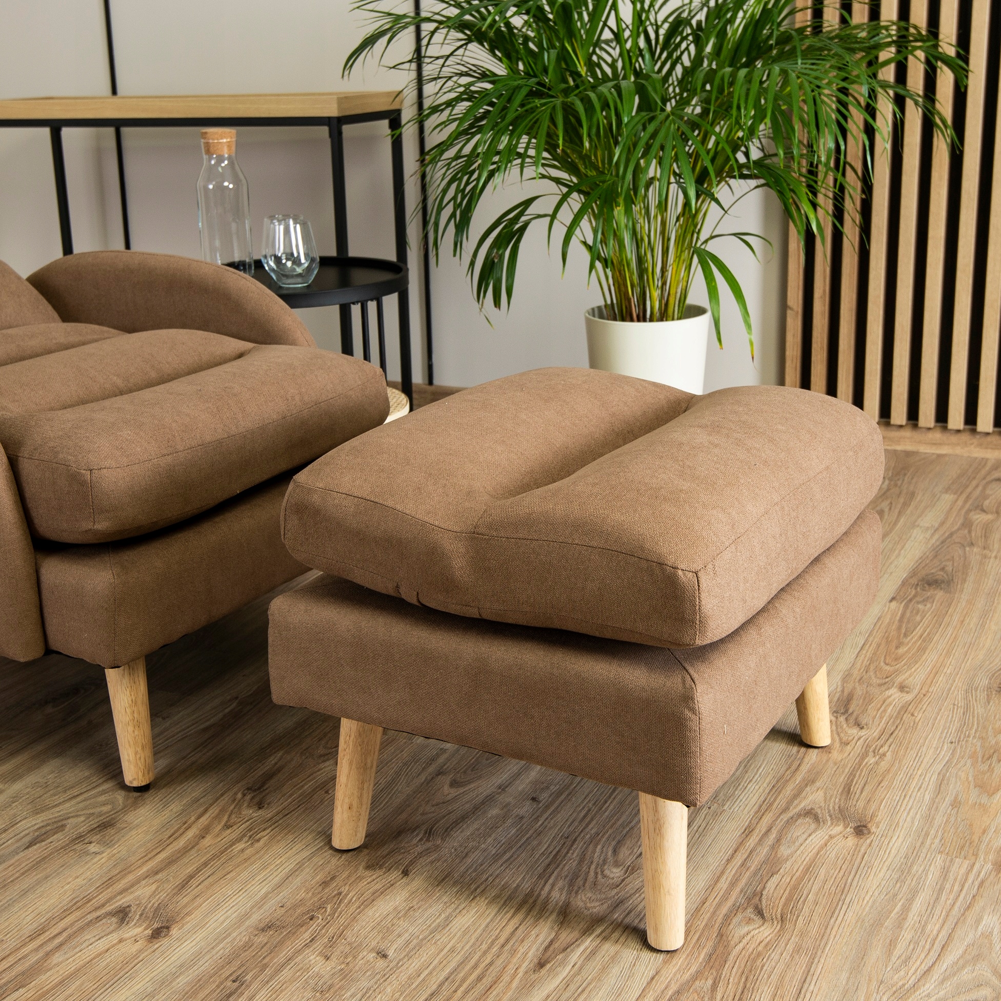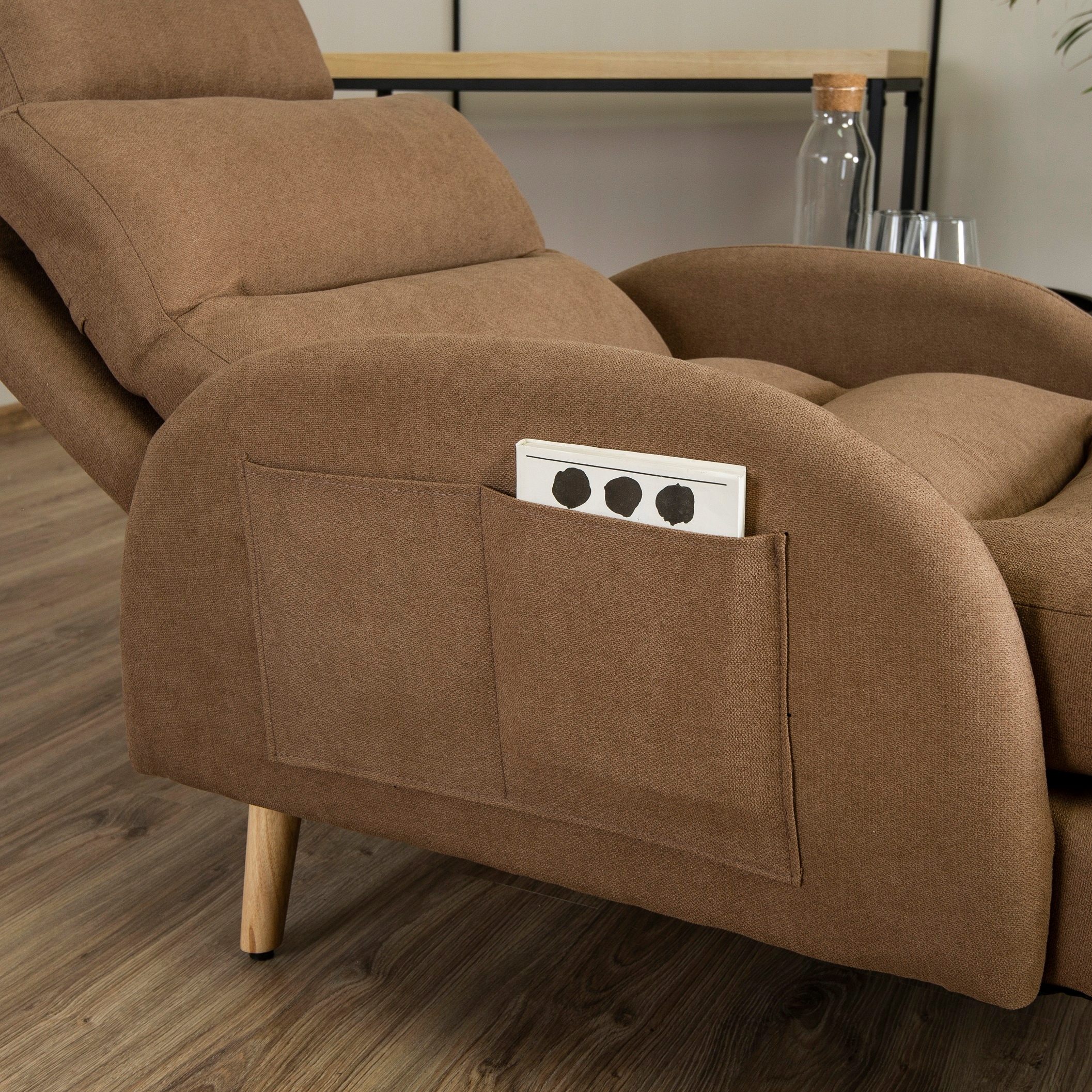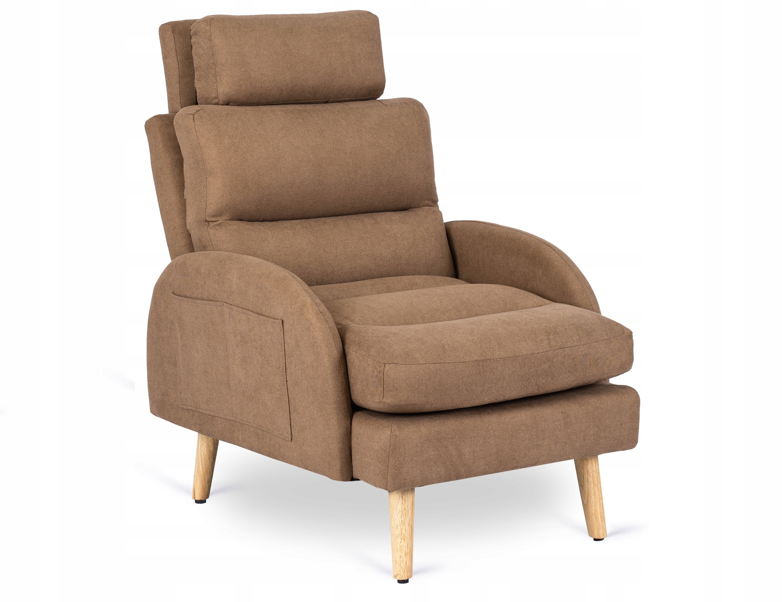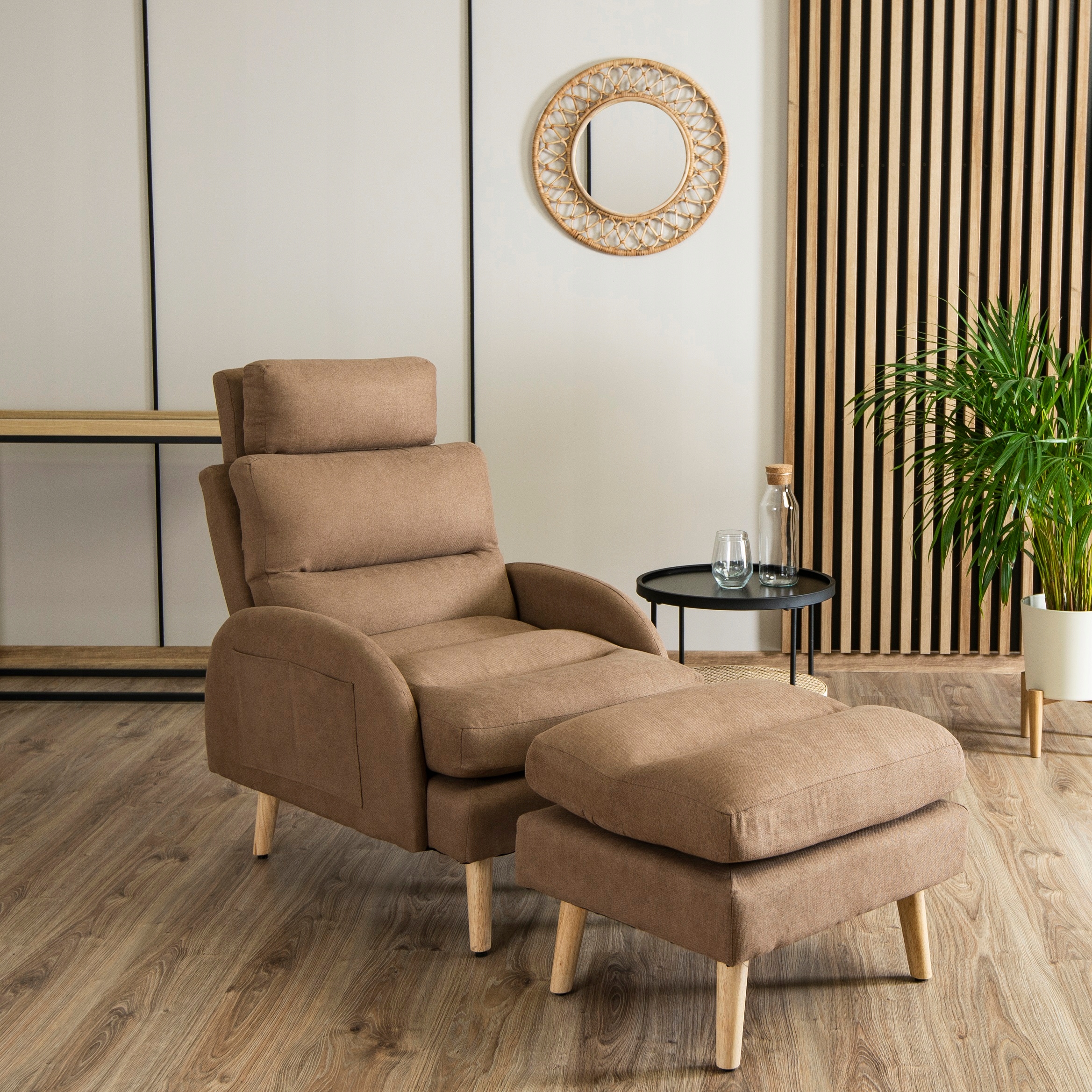 - Fotel wypoczynkowy z podnóżkiem HENRY w kolorze brązowym z dębowymi nóżkami