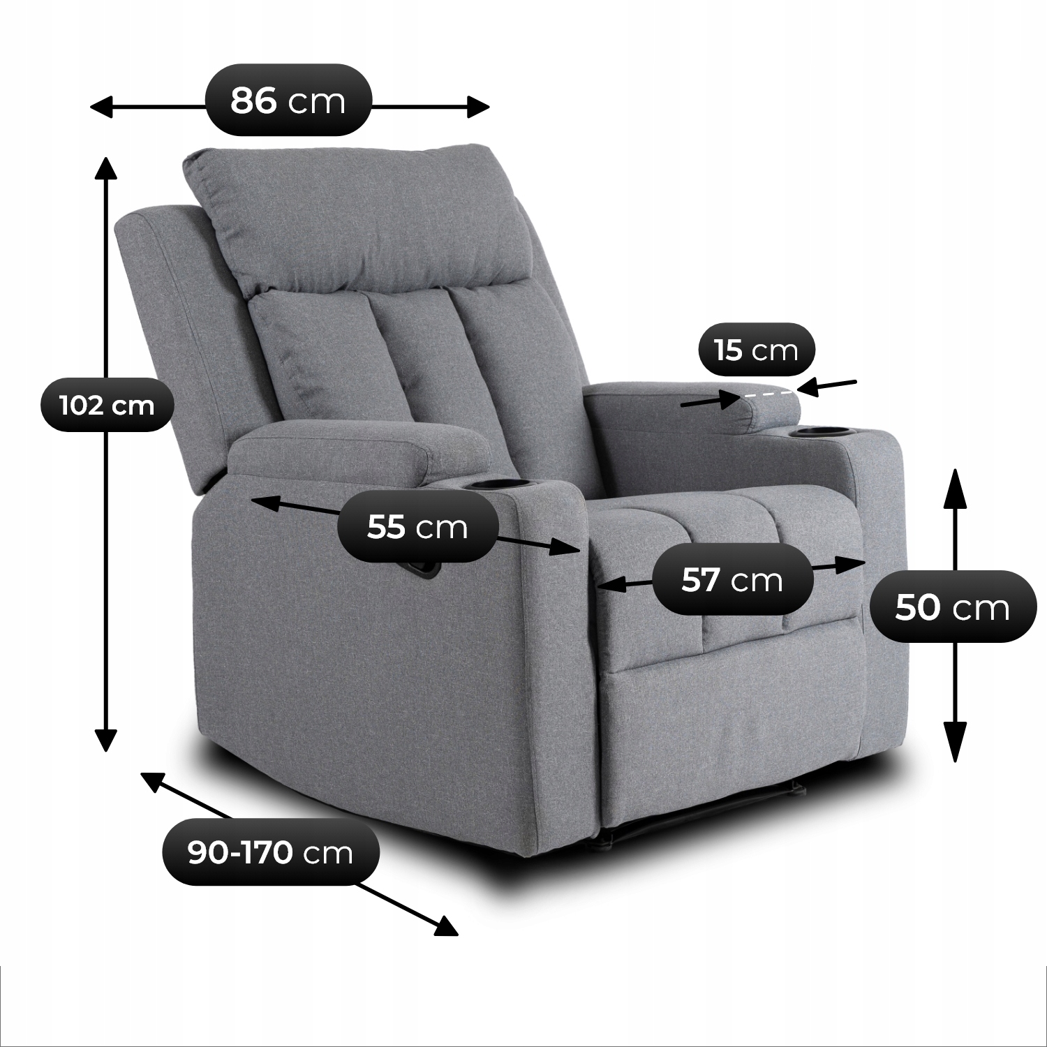 - Szerokość podłokietnika: 15 cm