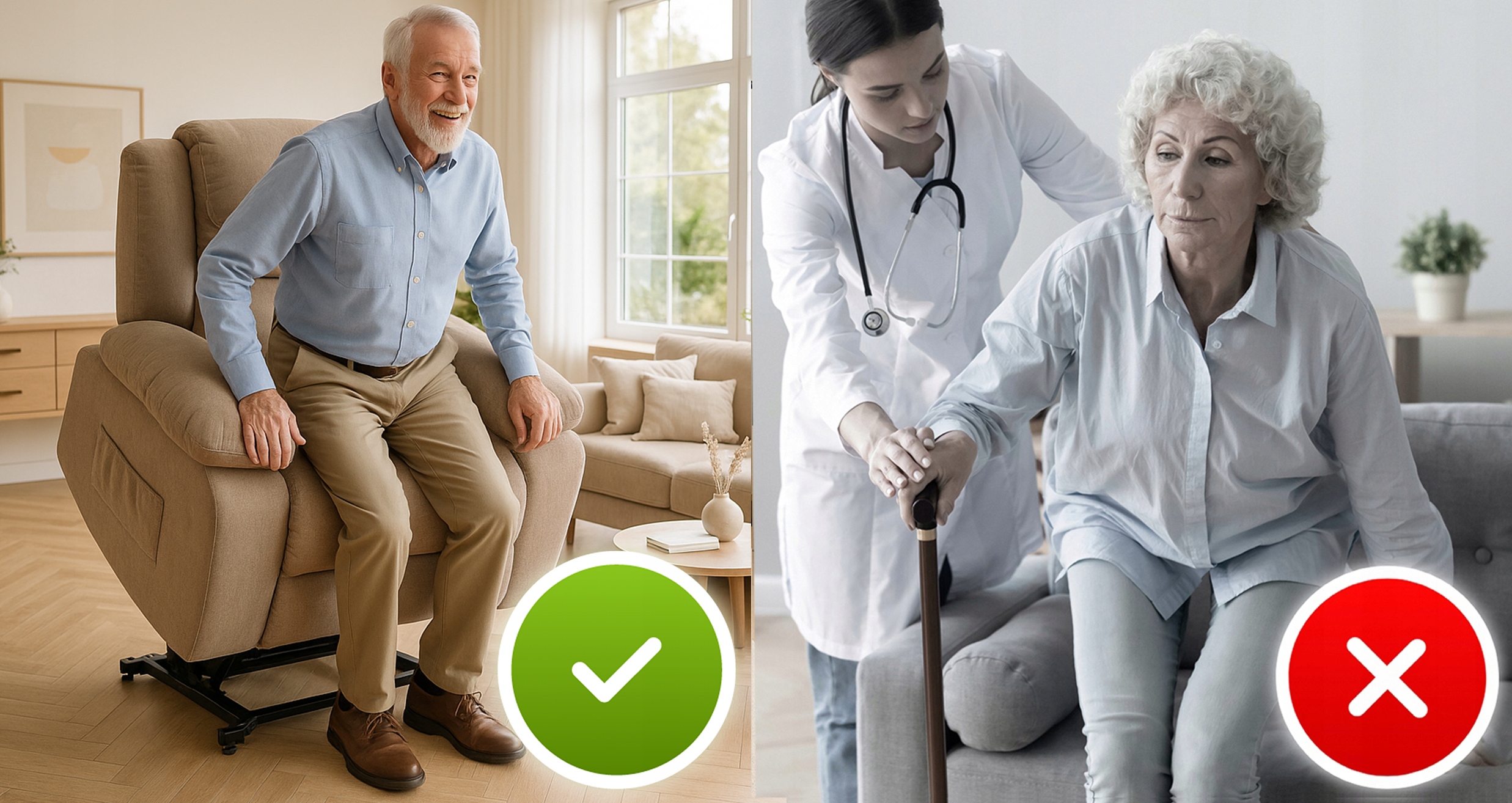 Za pomocą jednego przycisku fotel delikatnie unosi się do góry, pomagając przejść z pozycji siedzącej do stojącej w sposób stabilny i kontrolowany.