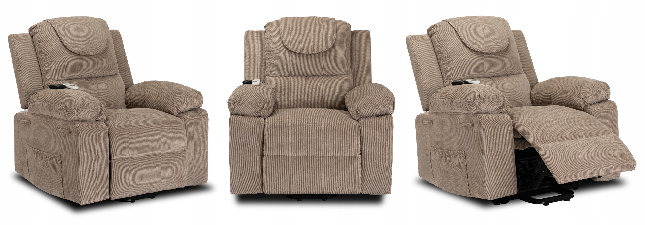 - W pełni elektryczne sterowanie – podnoszenie oparcia, siedziska oraz podnóżka odbywa się płynnie za pomocą pilota.