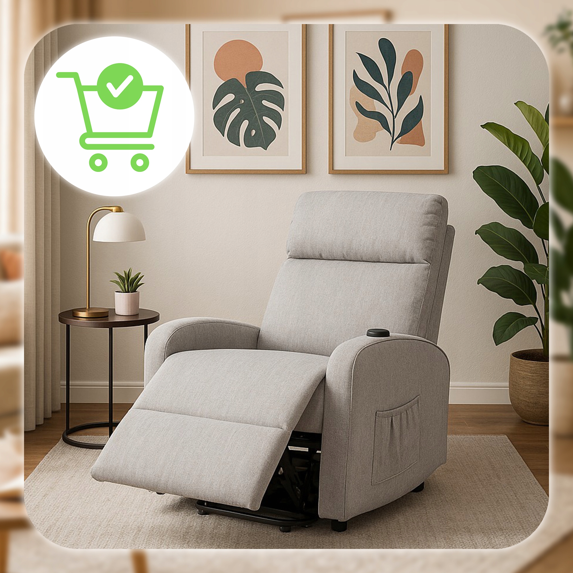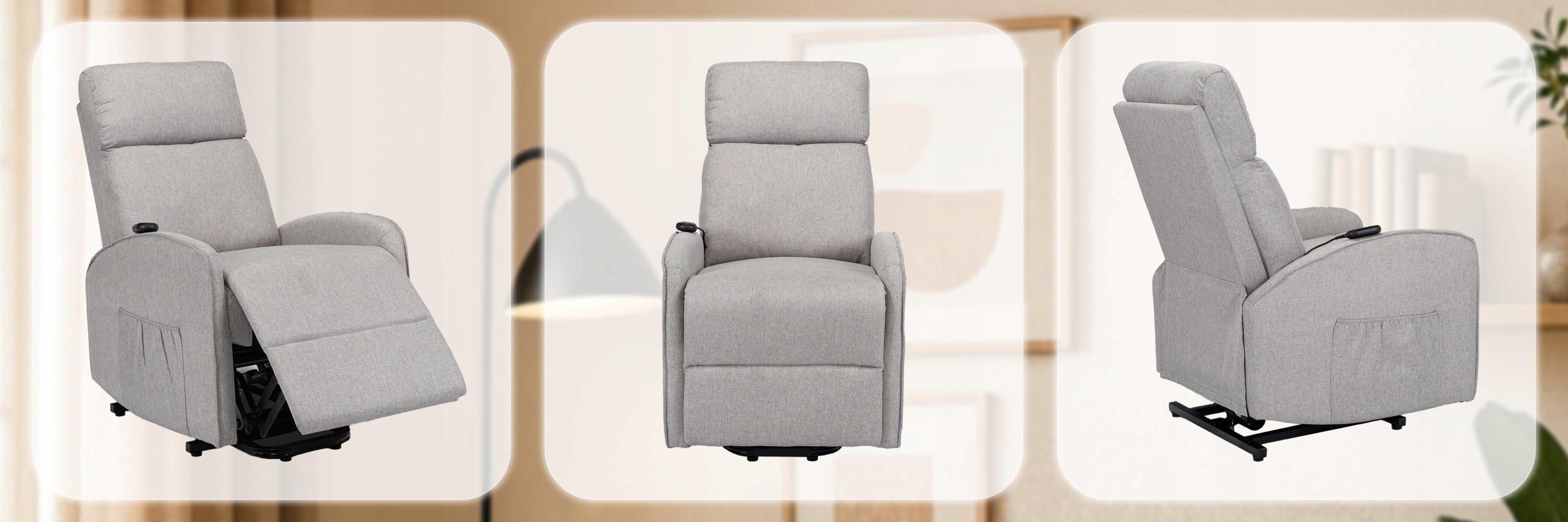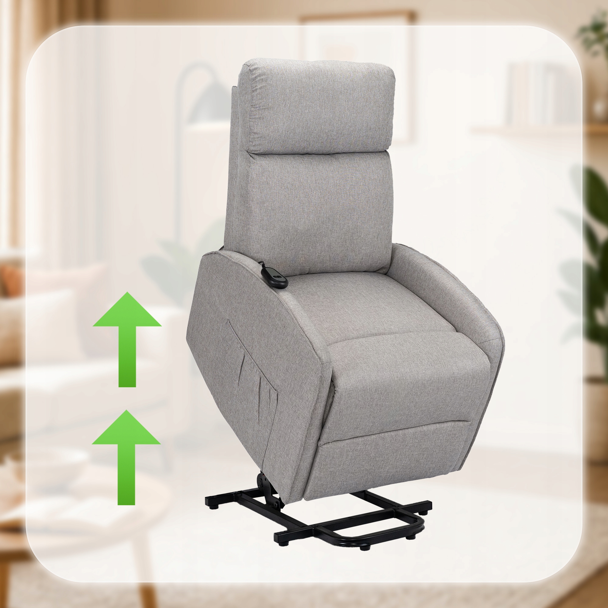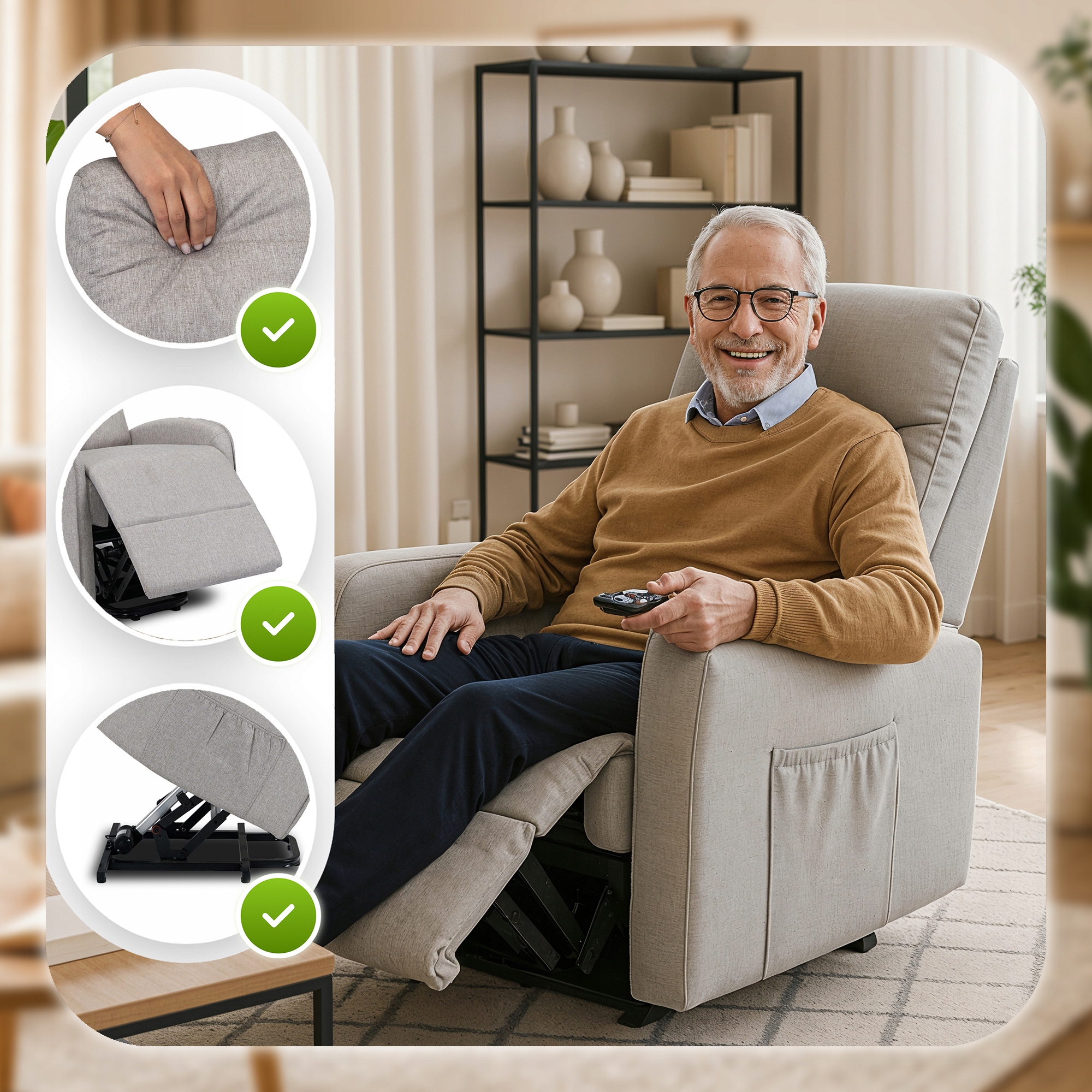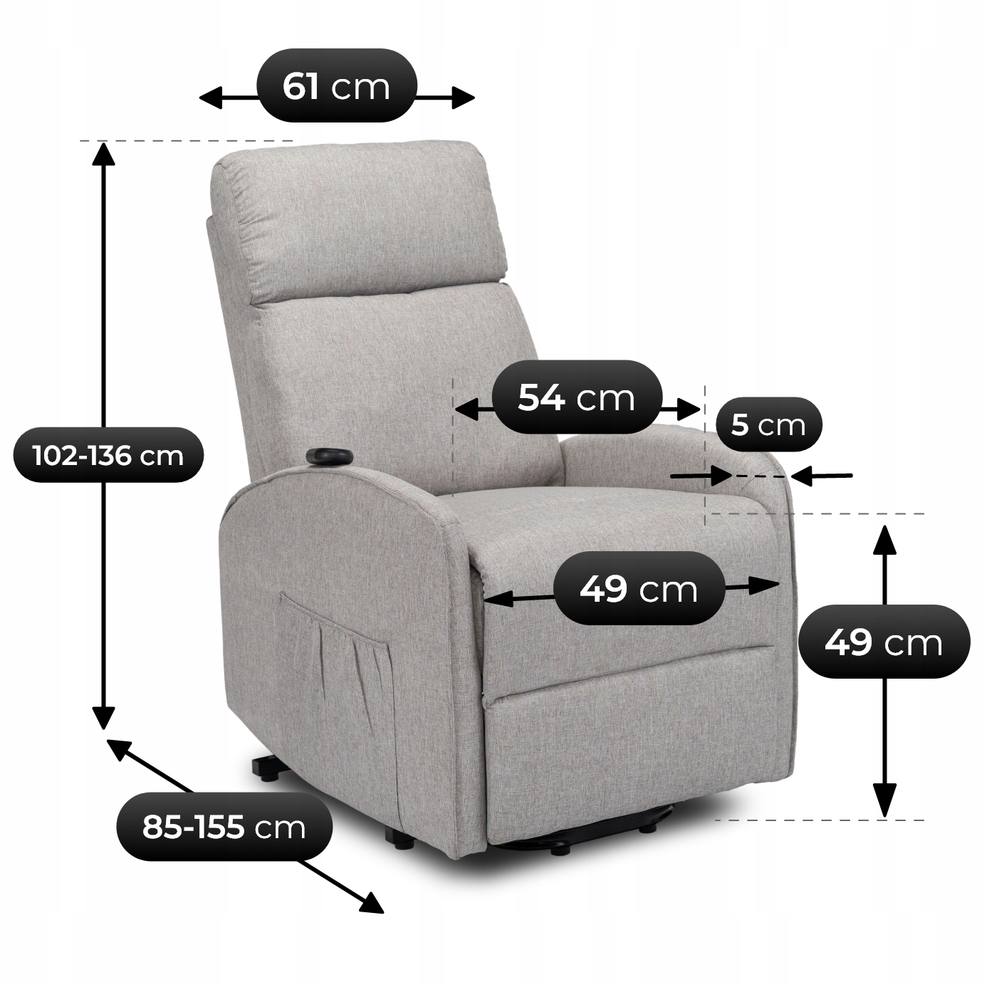 Fotel COLTON w tkaninie w kolorze szarym to idealne rozwiązanie dla osób starszych lub mających trudności ze wstawaniem. Wyposażony w funkcję podnoszenia, ułatwia bezpieczne i komfortowe wstawanie z fotela. Rozkładane oparcie oraz wbudowany podnóżek pozwalają na pełny relaks w pozycji półleżącej lub leżącej. Wszystkie funkcje obsługiwane są wygodnym pilotem, co zapewnia prostotę użytkowania. Miękka, przyjemna w dotyku tapicerka nadaje fotelowi elegancki i przytulny wygląd, pasujący do każdego wnętrza.