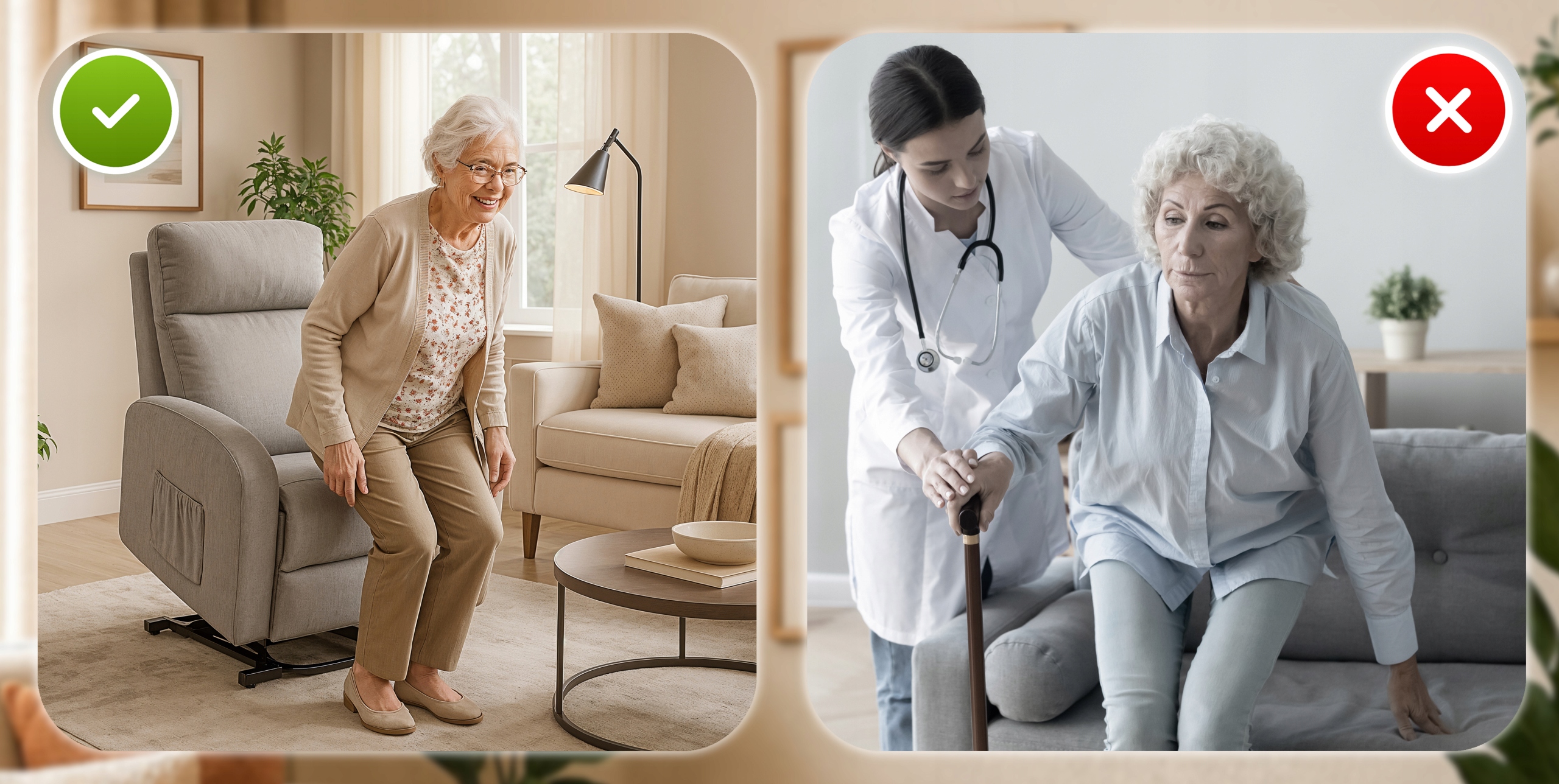 Za pomocą jednego przycisku fotel delikatnie unosi się do góry, pomagając przejść z pozycji siedzącej do stojącej w sposób stabilny i kontrolowany.