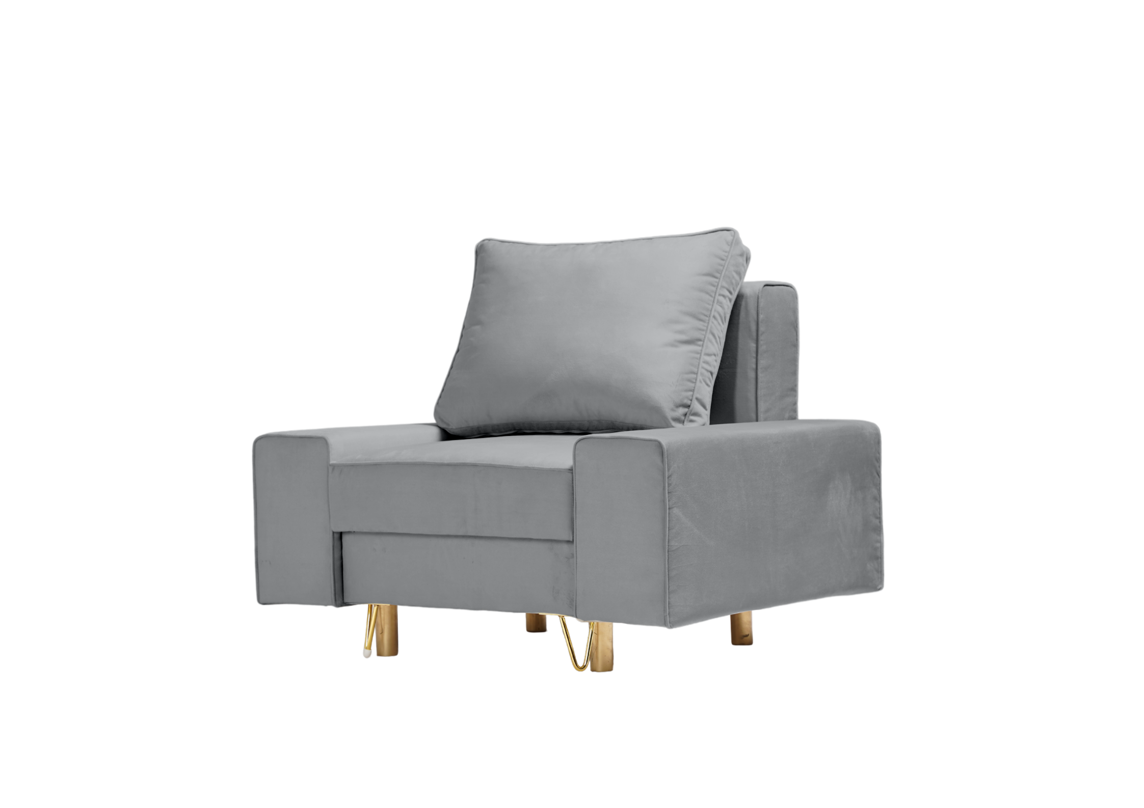 Tapicerowany Fotel z kolekcji STINO to fotel elegancki fotel na złotych metalowych nogach, który kryje pod siedziskiem pojemnik na drobiazgi. W kolekcji Stino dostępny jest również fotel rozkładany, sofa, pufa oraz narożnik.