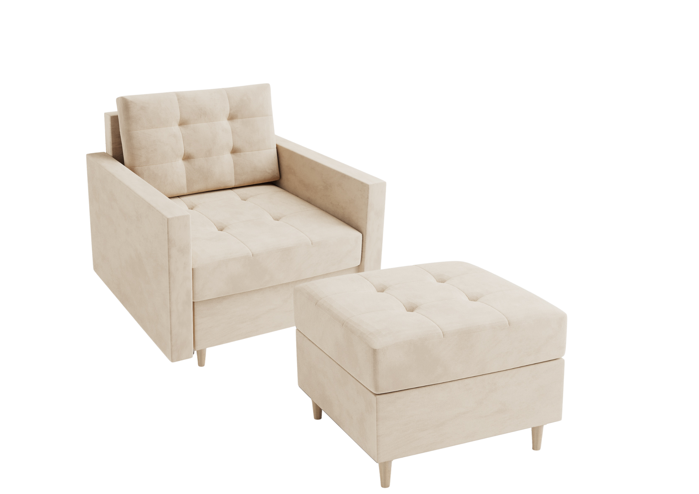 ⭐️Fotel VIDO Beżowy Tapicerowany Welur Salon Biuro Skandynawski pufą VIDO