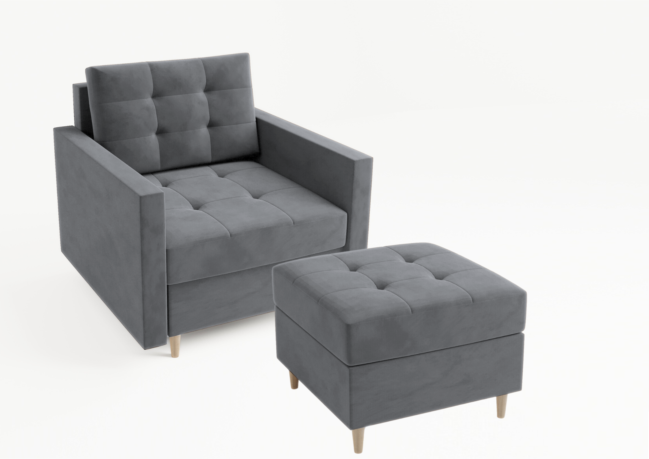 Fotel z pikowanym siedziskiem oraz pikowaną poduszką idealnie dopasowany do pozostałych produktów z serii VIDO. Dodatkowo piękny duży podnóżek 60x60cm, który po dołączeniu do fotela sprawi, że będziemy mogli cieszyć się pozycją półleżącą. Wysokie 10cm nogi, piękne tkaniny i wypełnienia do wyboru.