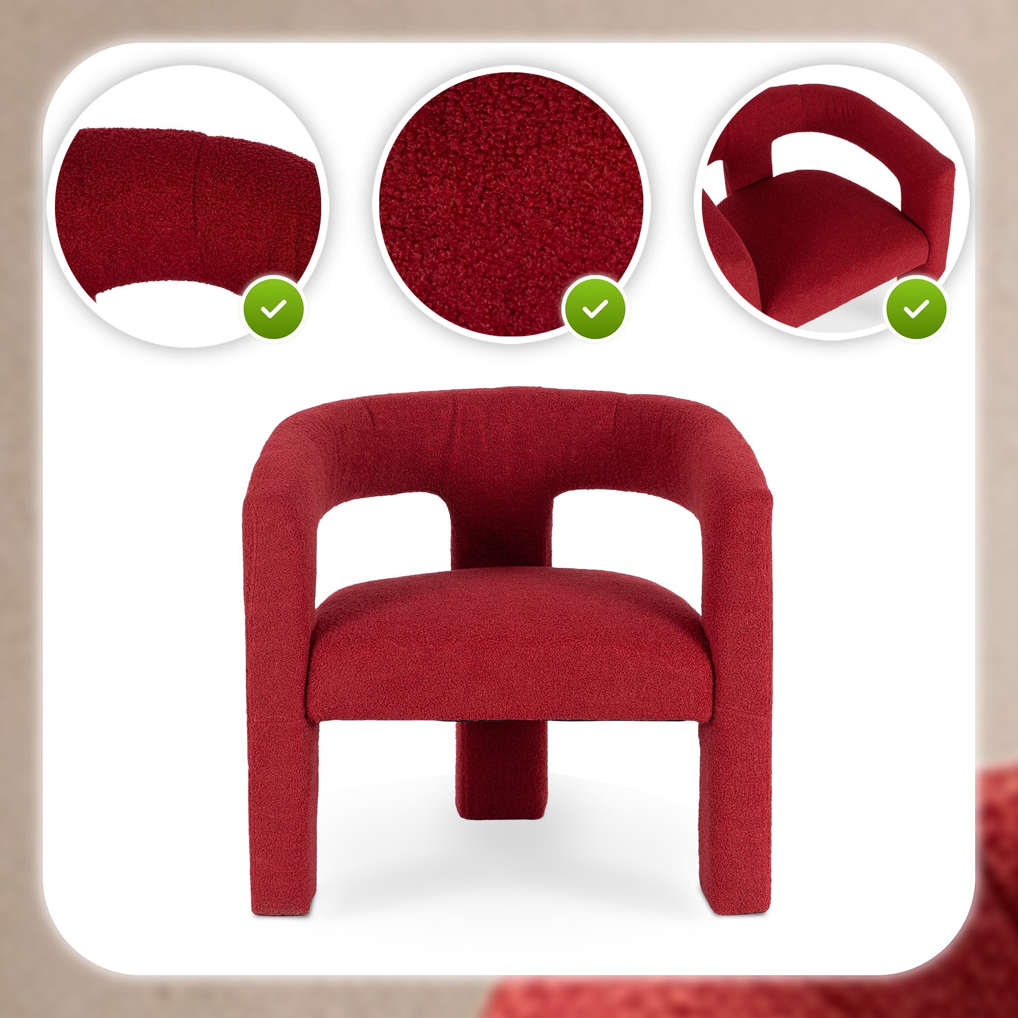 Fotel LILE zachwyca swoją nowoczesną formą i subtelną elegancją. Piękne siedzisko i zaokrąglone oparcie sprawiają, że fotel przyciąga wzrok i dodaje wnętrzu wyjątkowego charakteru. Bordowa tkanina komponuje się z różnymi stylami – do nowoczesnego po minimalistyczne aranżacje.