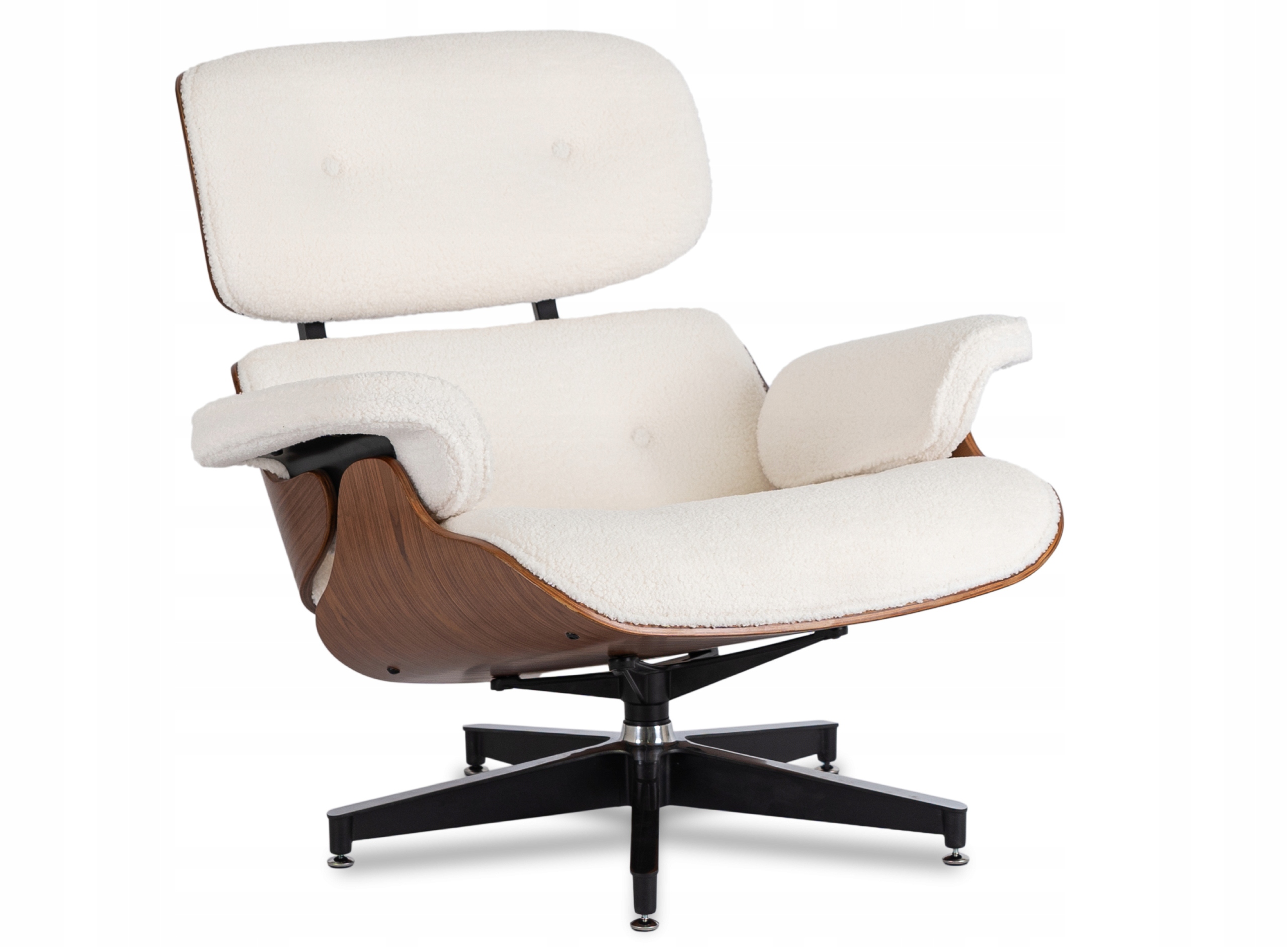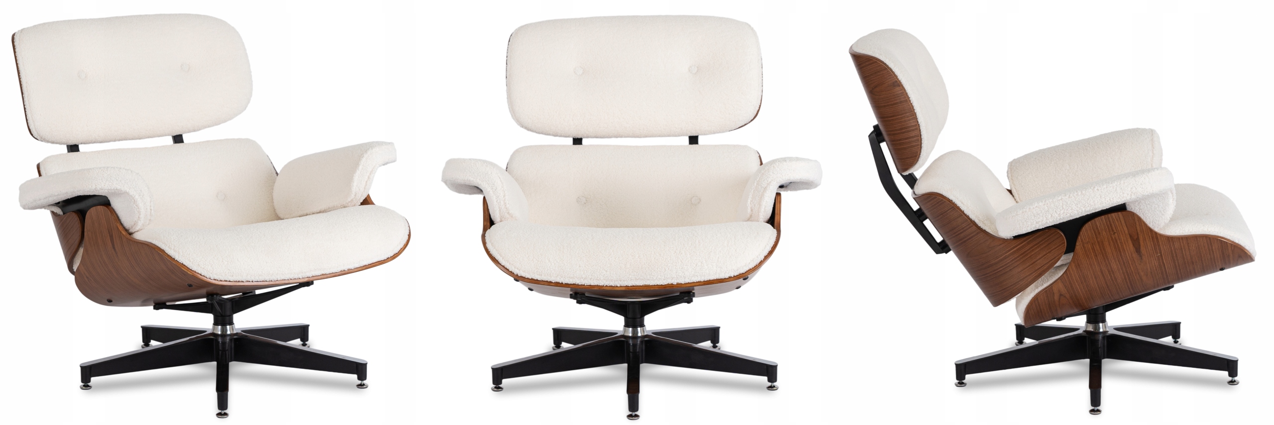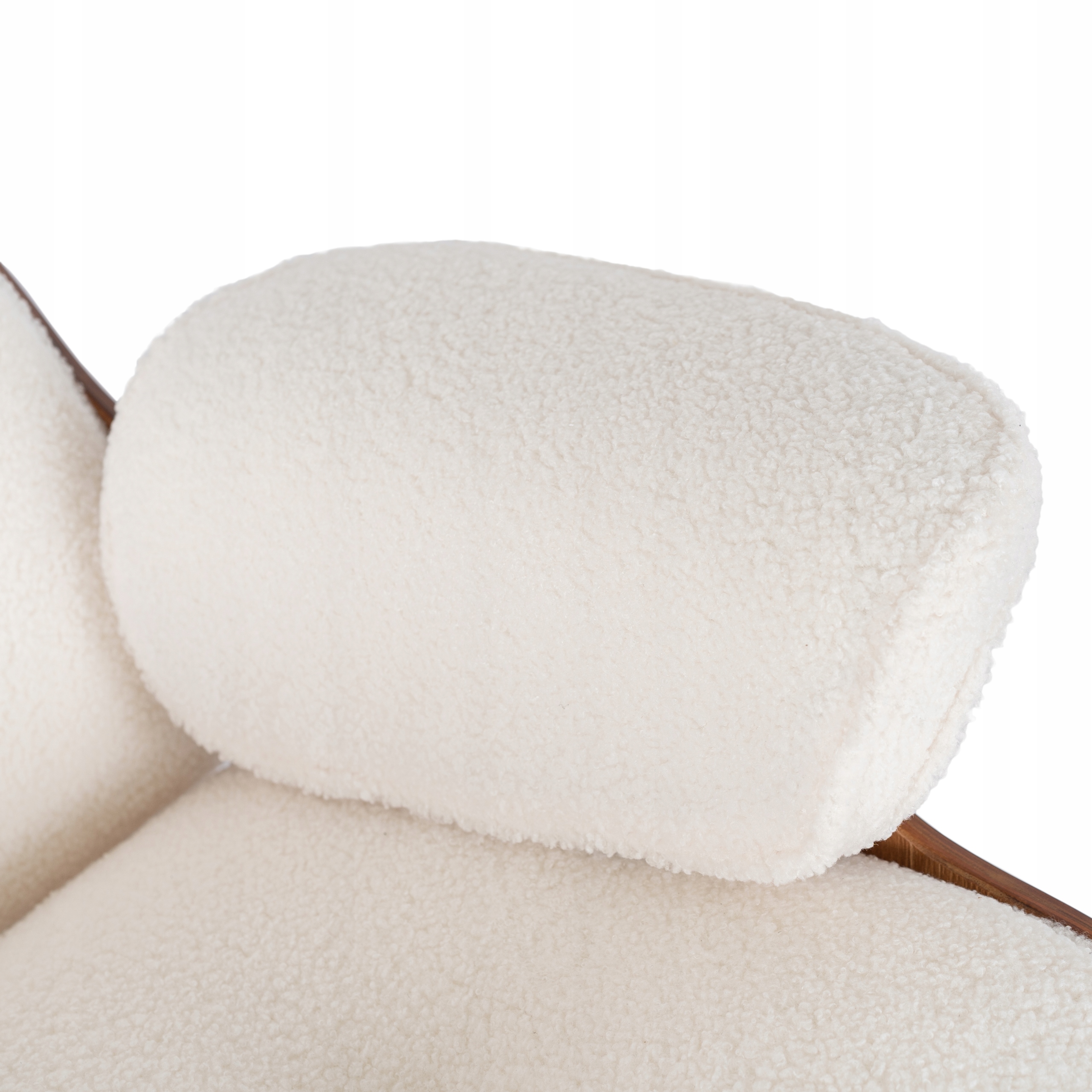 Fotel tapicerowany jest bardzo miłą w dotyku tkaniną typu baranek boucle w białym kolorze. Taka tkanina nadaje miękkości i przytulności.