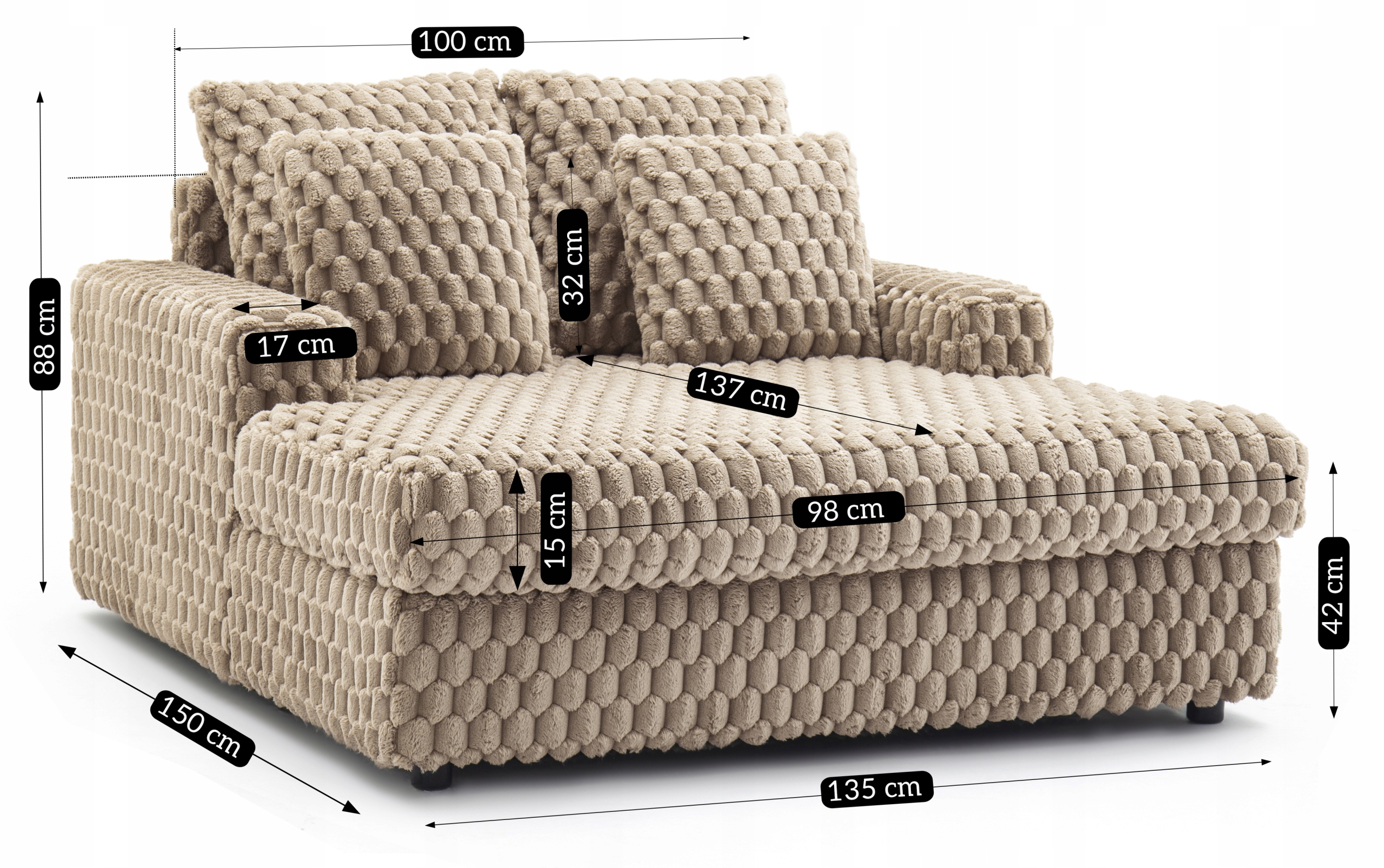 Grube, sprężyste poduchy zapewniają idealne podparcie dla pleców pozwalając zrelaksować się w ulubionej pozycji – siedząc lub swobodnie leżąc. Idealnie sprawdza się podczas wieczorów z książką, oglądania filmów czy chwil odpoczynku w ciągu dnia.