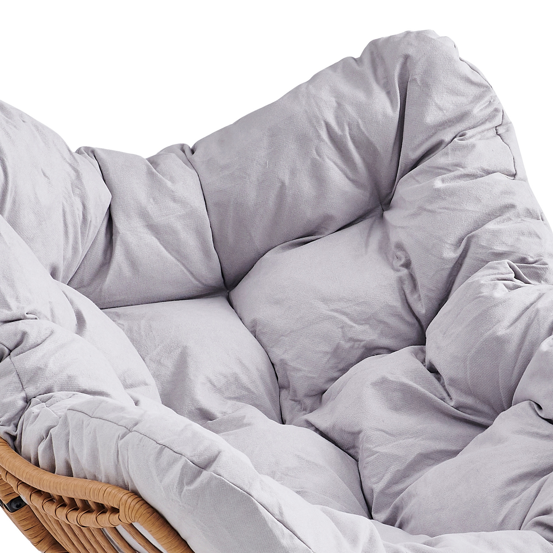 Siedzisko fotela wypełnia gruba, pikowana poduszka w jasnym, szarym kolorze.