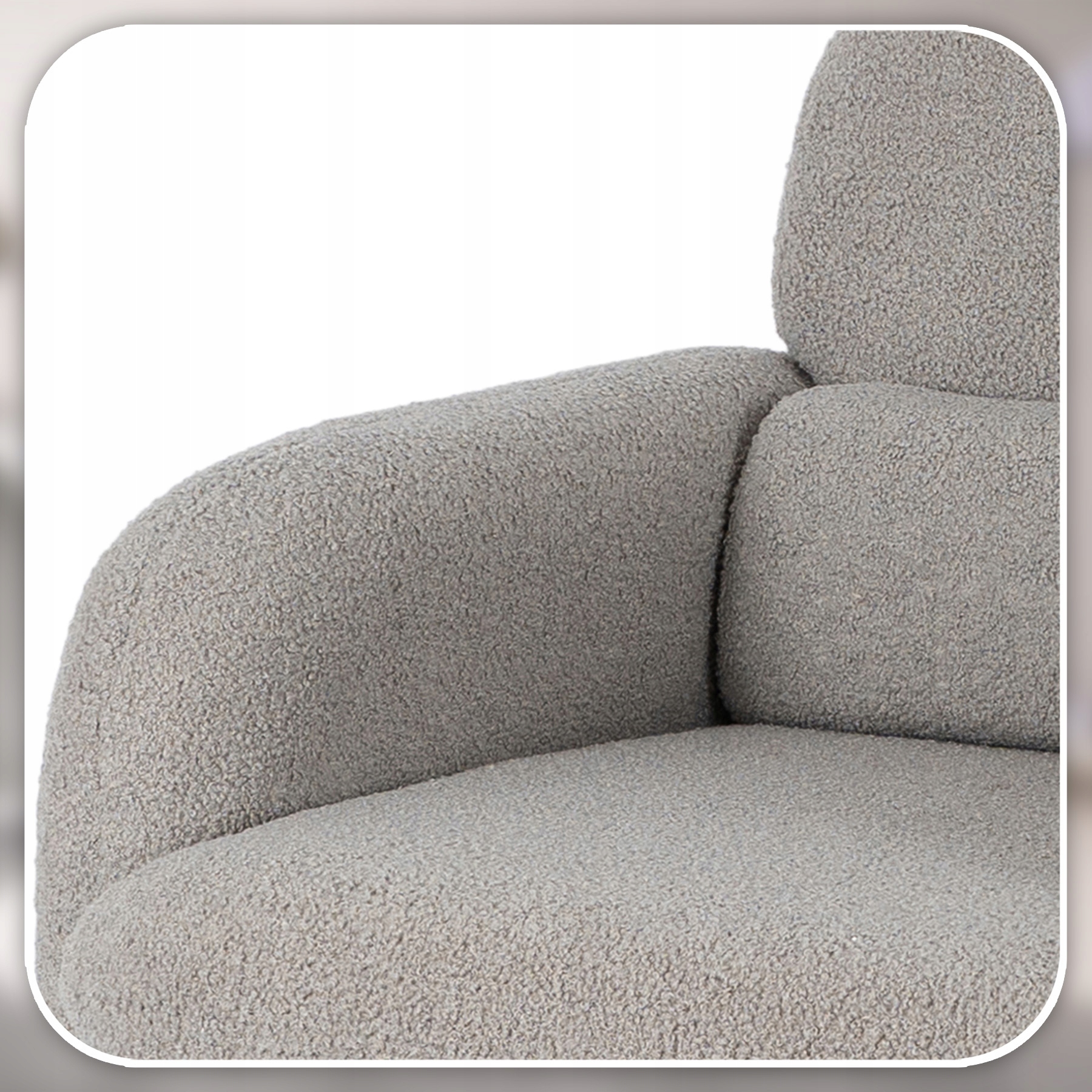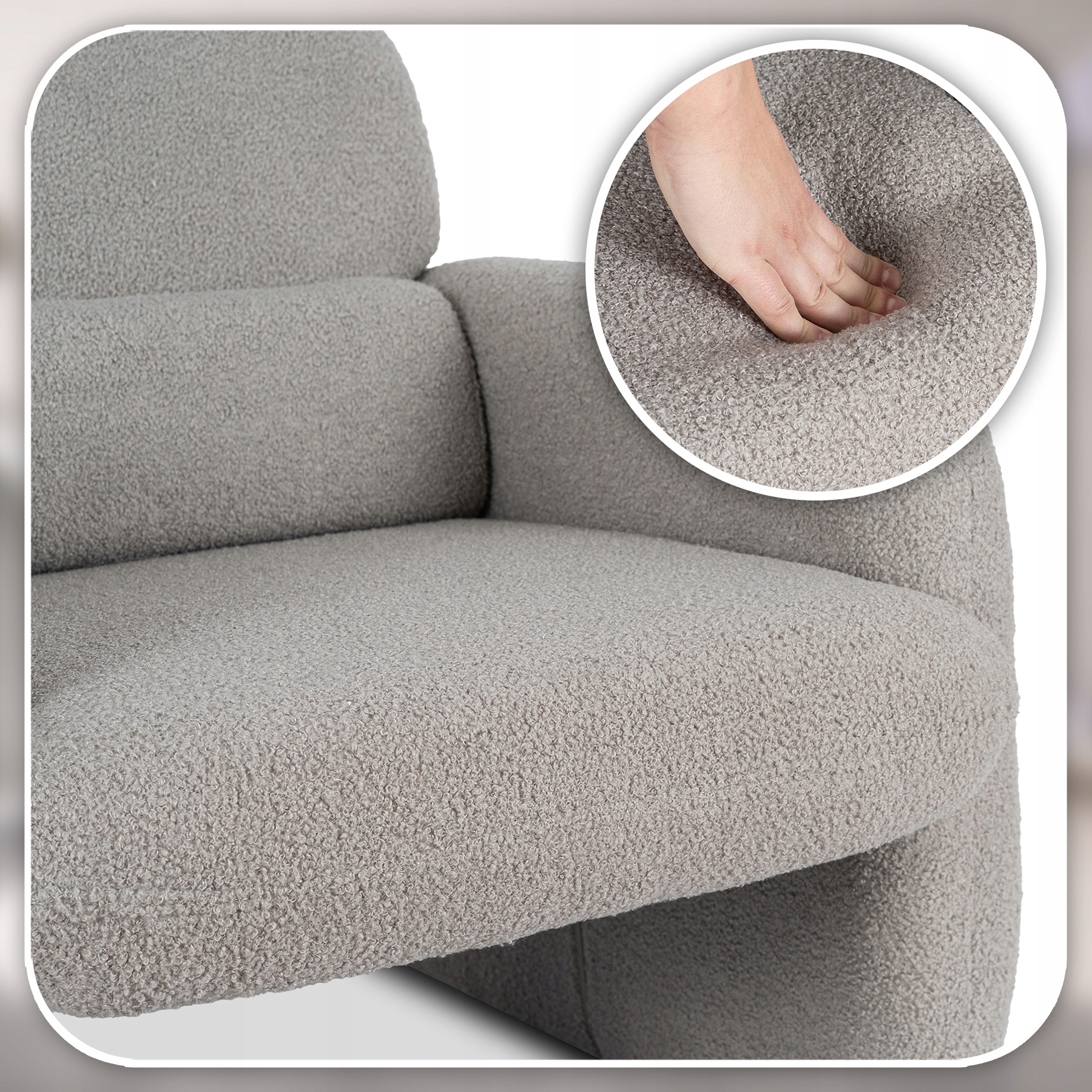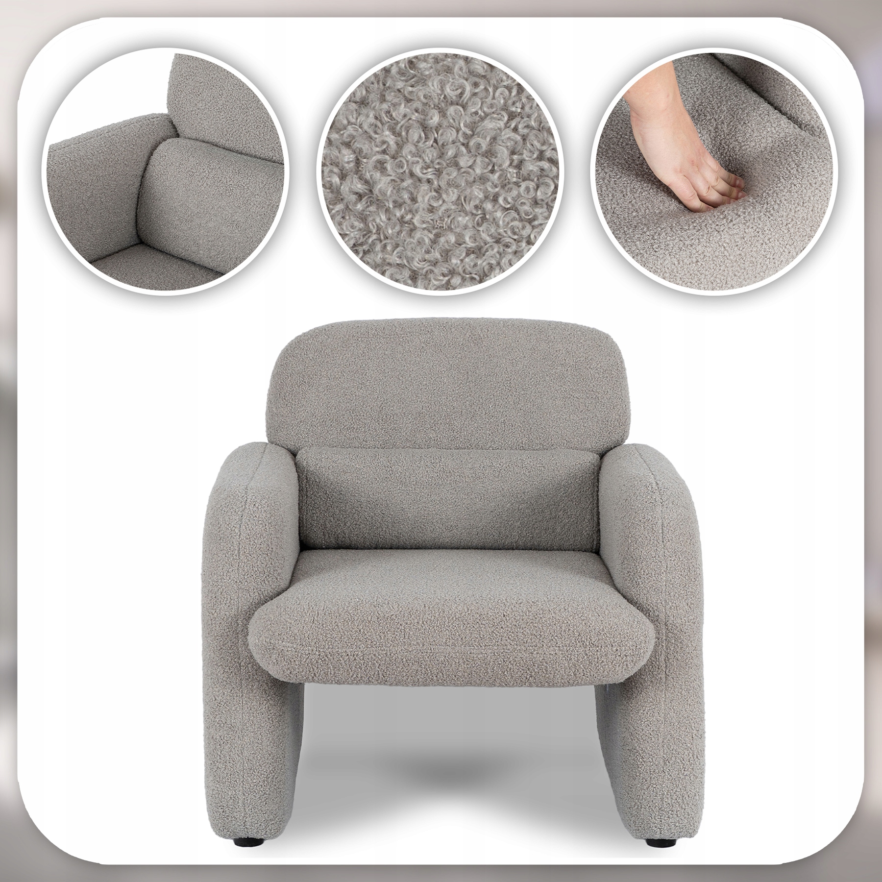 Fotel TOGO zachwyca swoją nowoczesną formą i subtelną elegancją. Piękne siedzisko i zaokrąglone oparcie sprawiają, że fotel przyciąga wzrok i dodaje wnętrzu wyjątkowego charakteru. Szara tkanina teddy komponuje się z różnymi stylami – do nowoczesnego po minimalistyczne aranżacje.