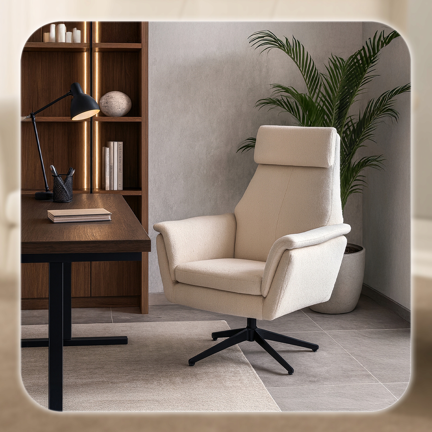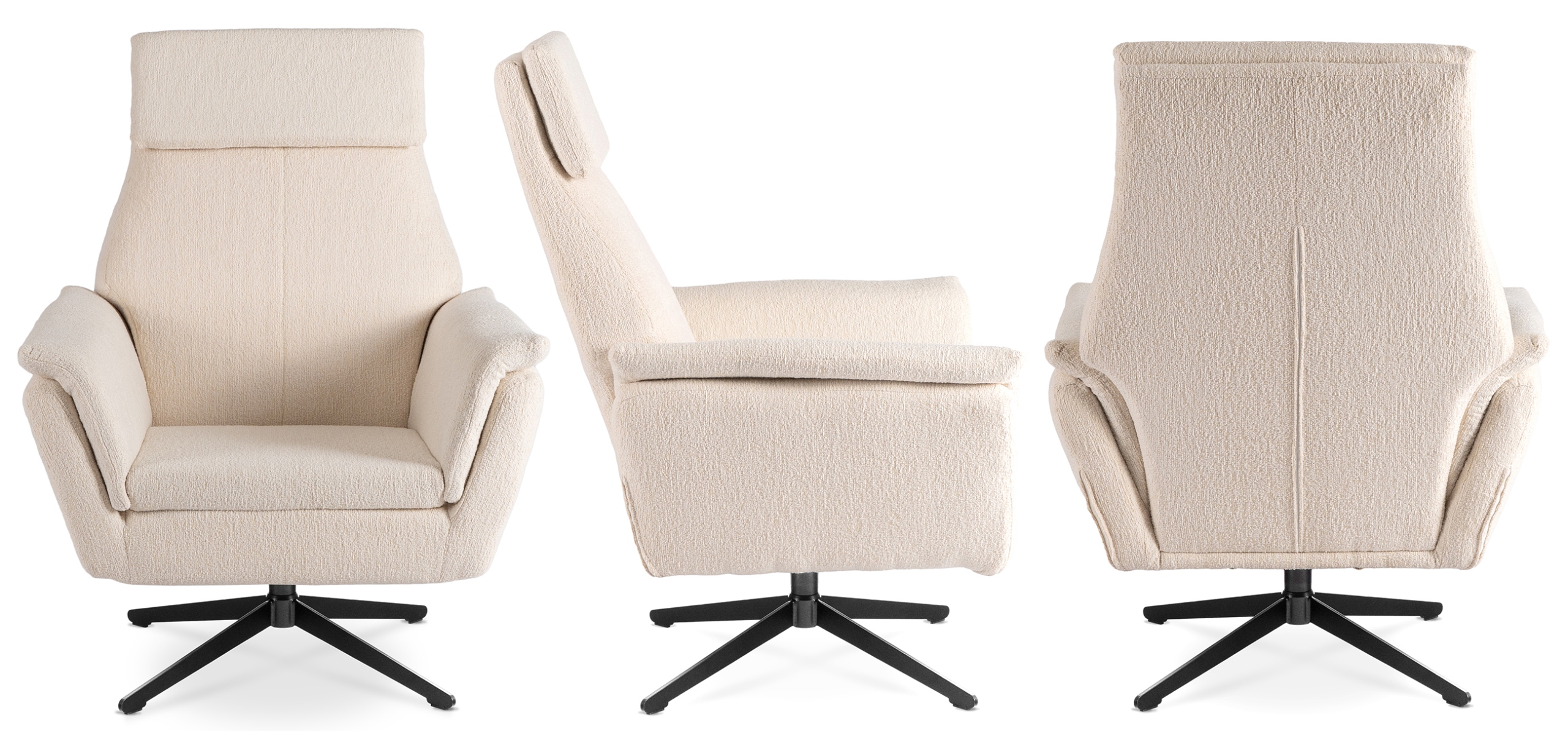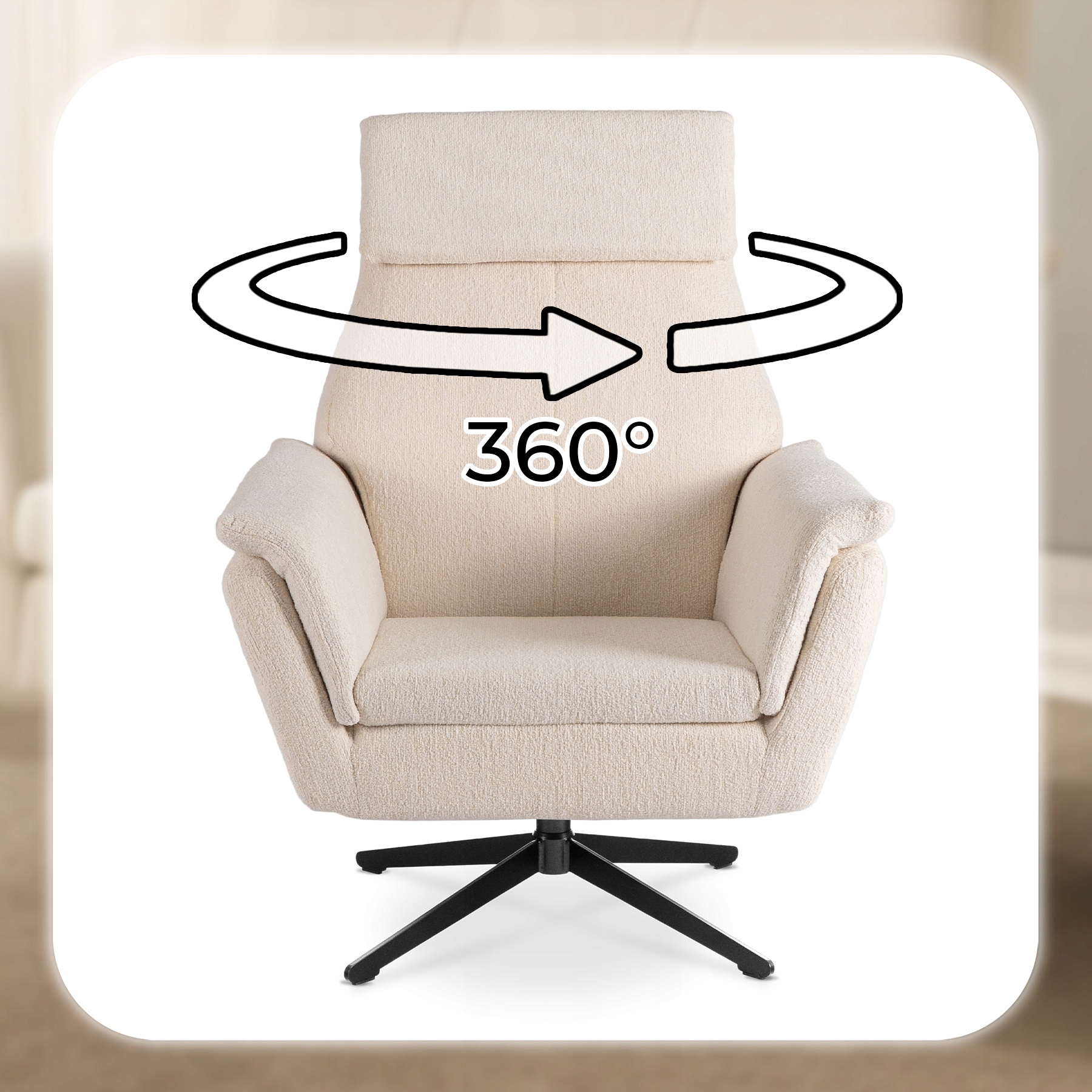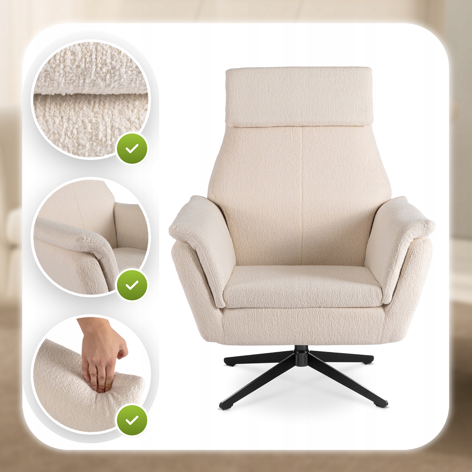 Fotel TERRY to połączenie nowoczesnej formy i ponadczasowej elegancji. Wysokie oparcie z zagłówkiem oraz szerokie podłokietniki gwarantują wygodę, a obrotowa podstawa 360° dodaje funkcjonalności. Beżowa tkanina boucle nadaje mu przytulny i modny charakter, dzięki czemu idealnie odnajdzie się w salonie, gabinecie czy przestrzeni do relaksu.
