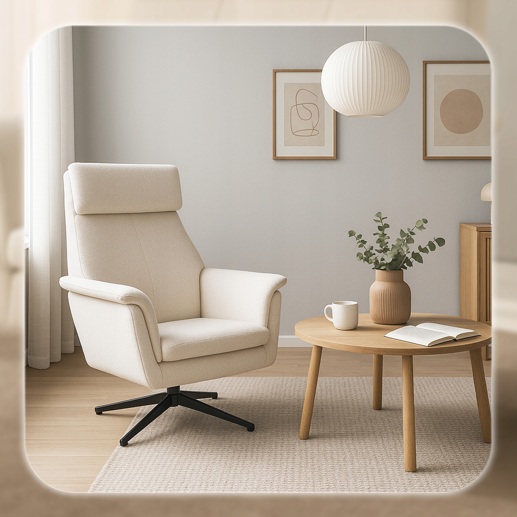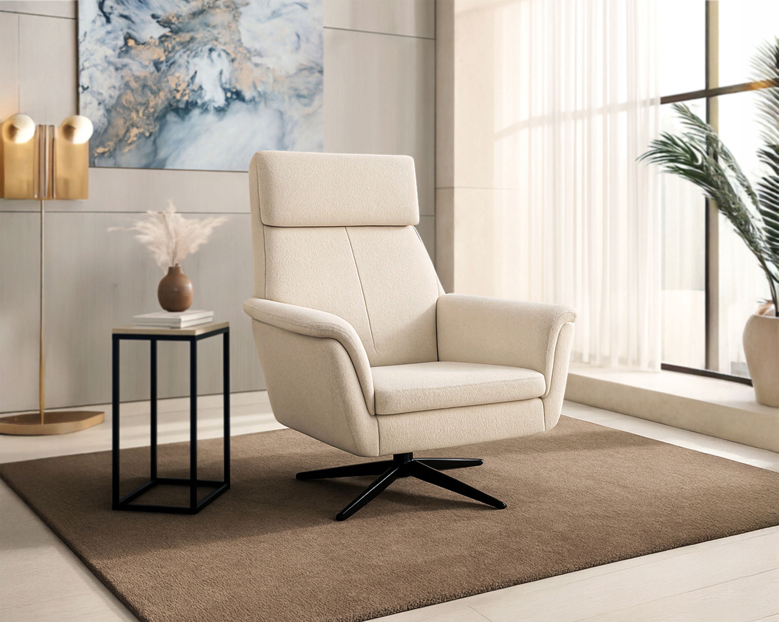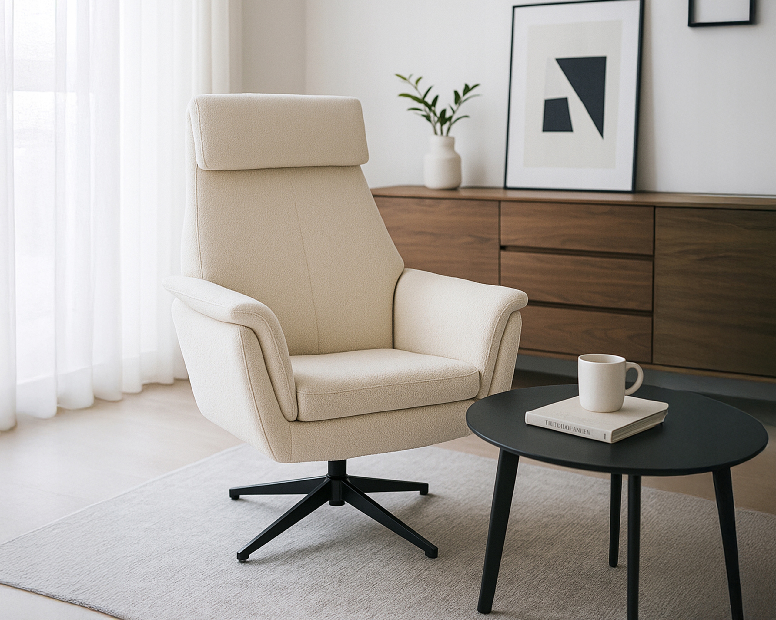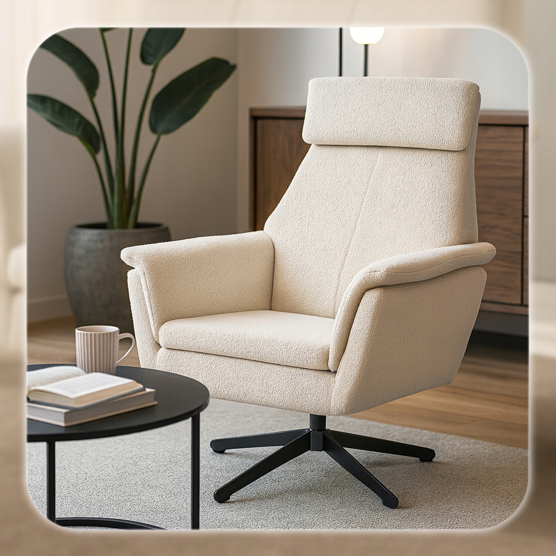 Fotel TERRY to połączenie nowoczesnej formy i ponadczasowej elegancji. Wysokie oparcie z zagłówkiem oraz szerokie podłokietniki gwarantują wygodę, a obrotowa podstawa 360° dodaje funkcjonalności. Beżowa tkanina boucle nadaje mu przytulny i modny charakter, dzięki czemu idealnie odnajdzie się w salonie, gabinecie czy przestrzeni do relaksu.