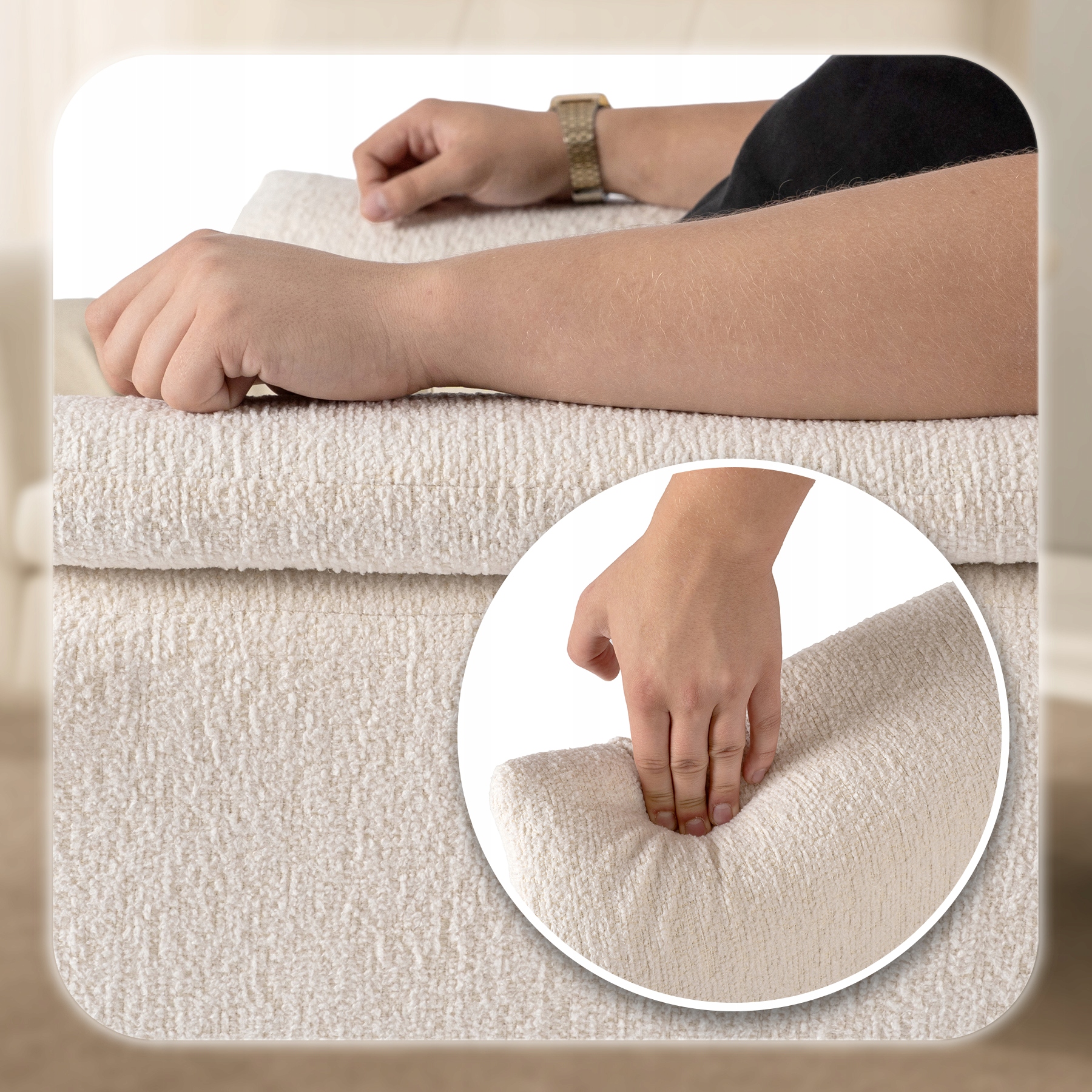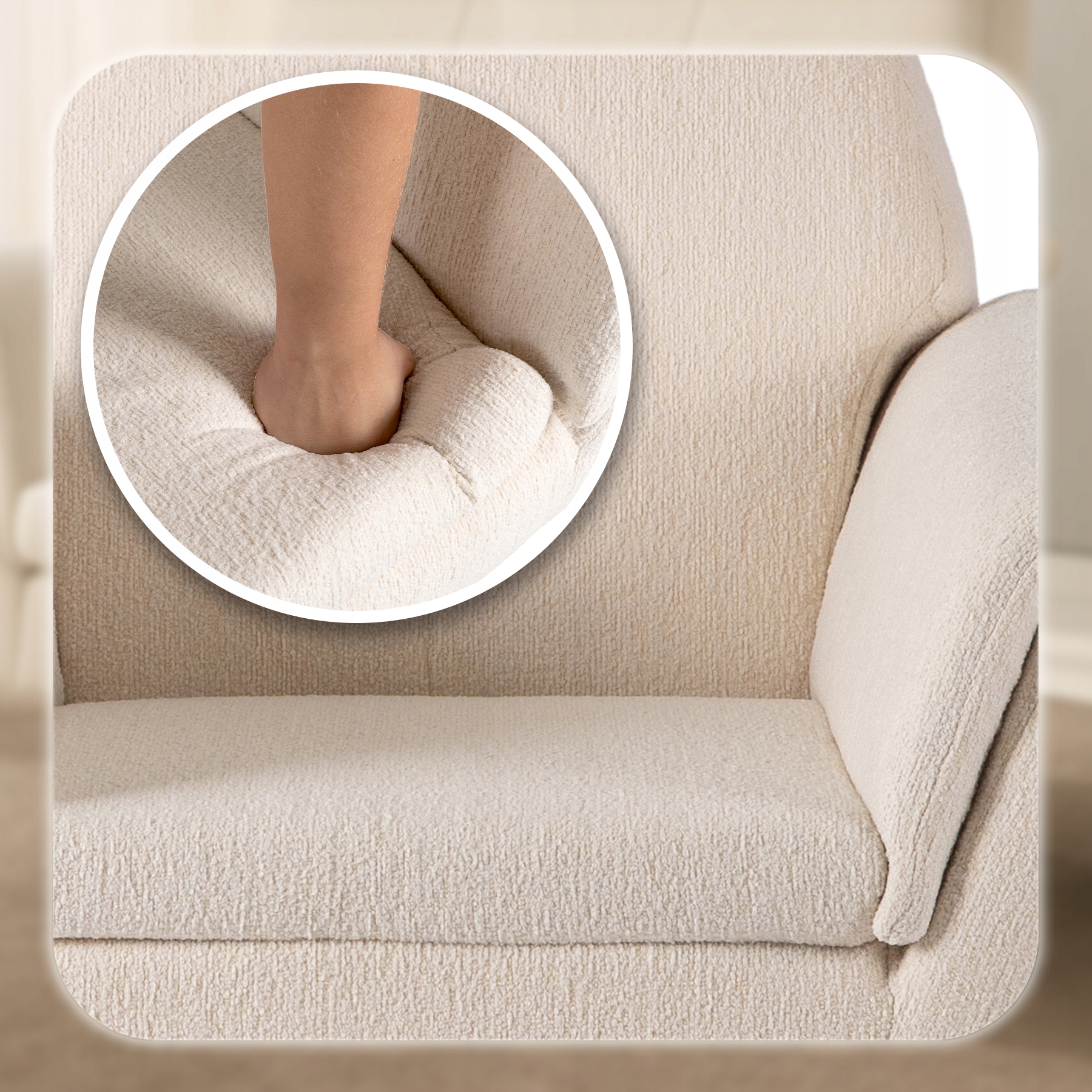 - Stylowa tkanina boucle – beżowe obicie jest nie tylko przyjemne w dotyku, ale także wyjątkowo modne i eleganckie.