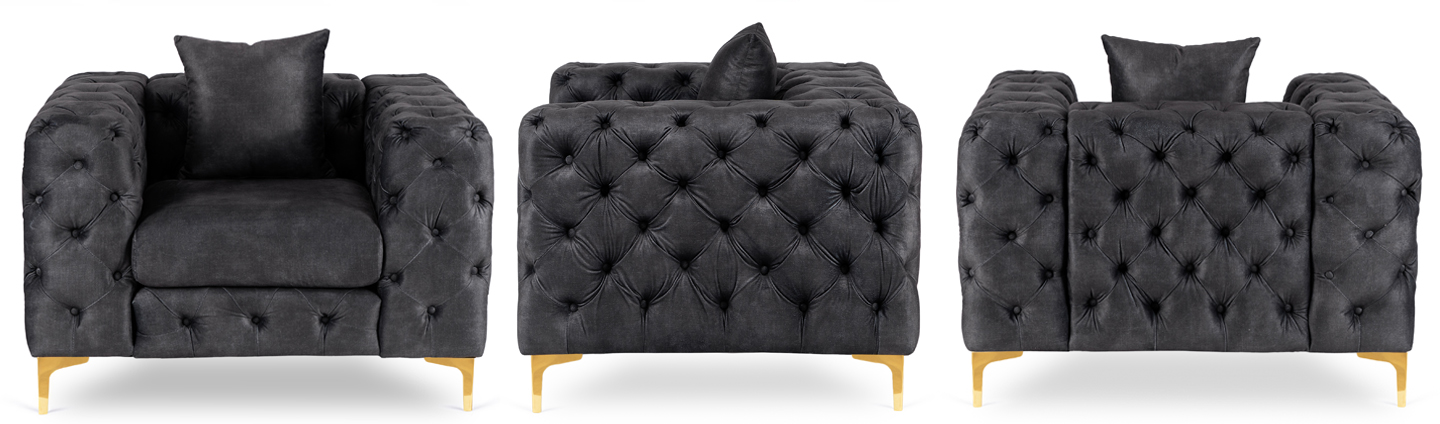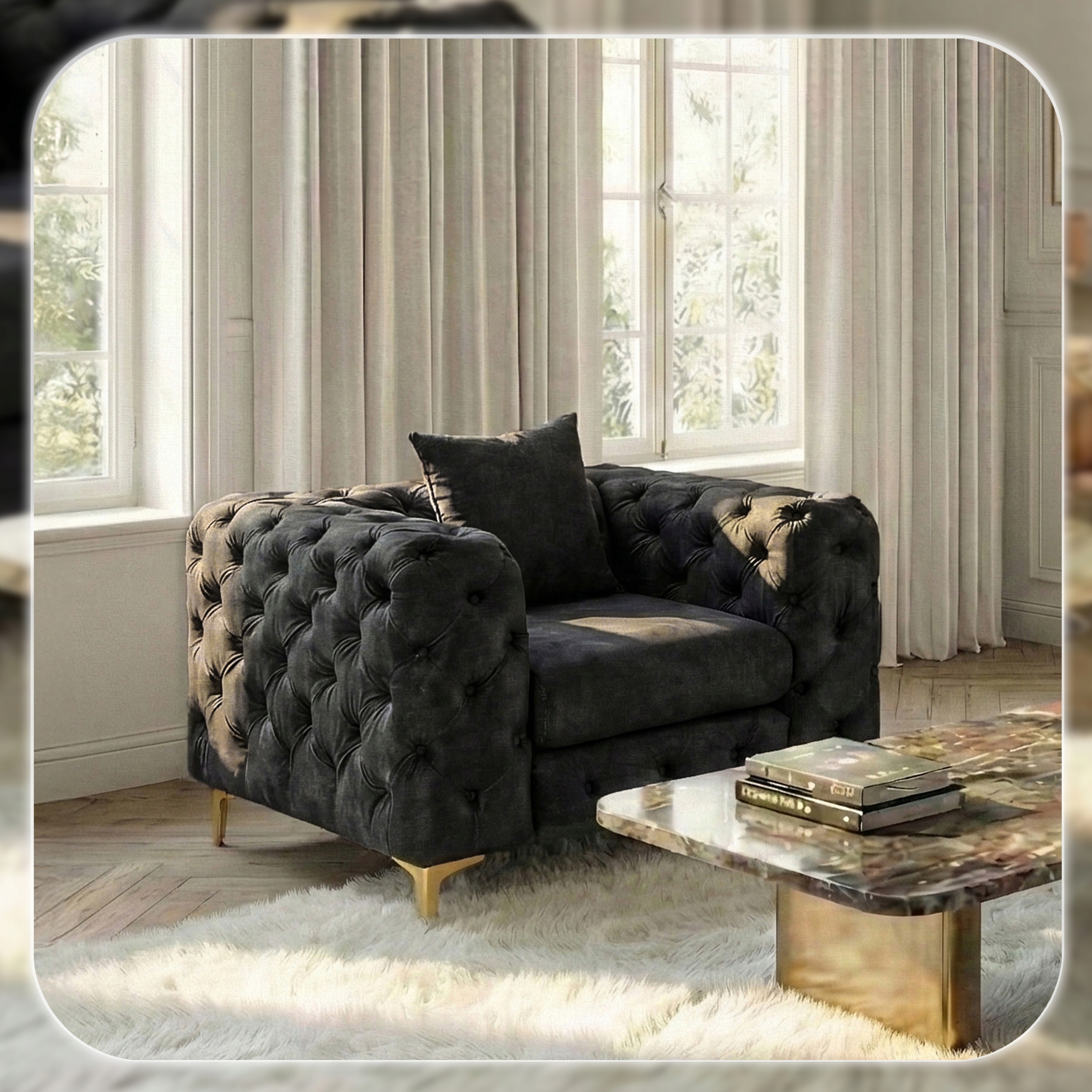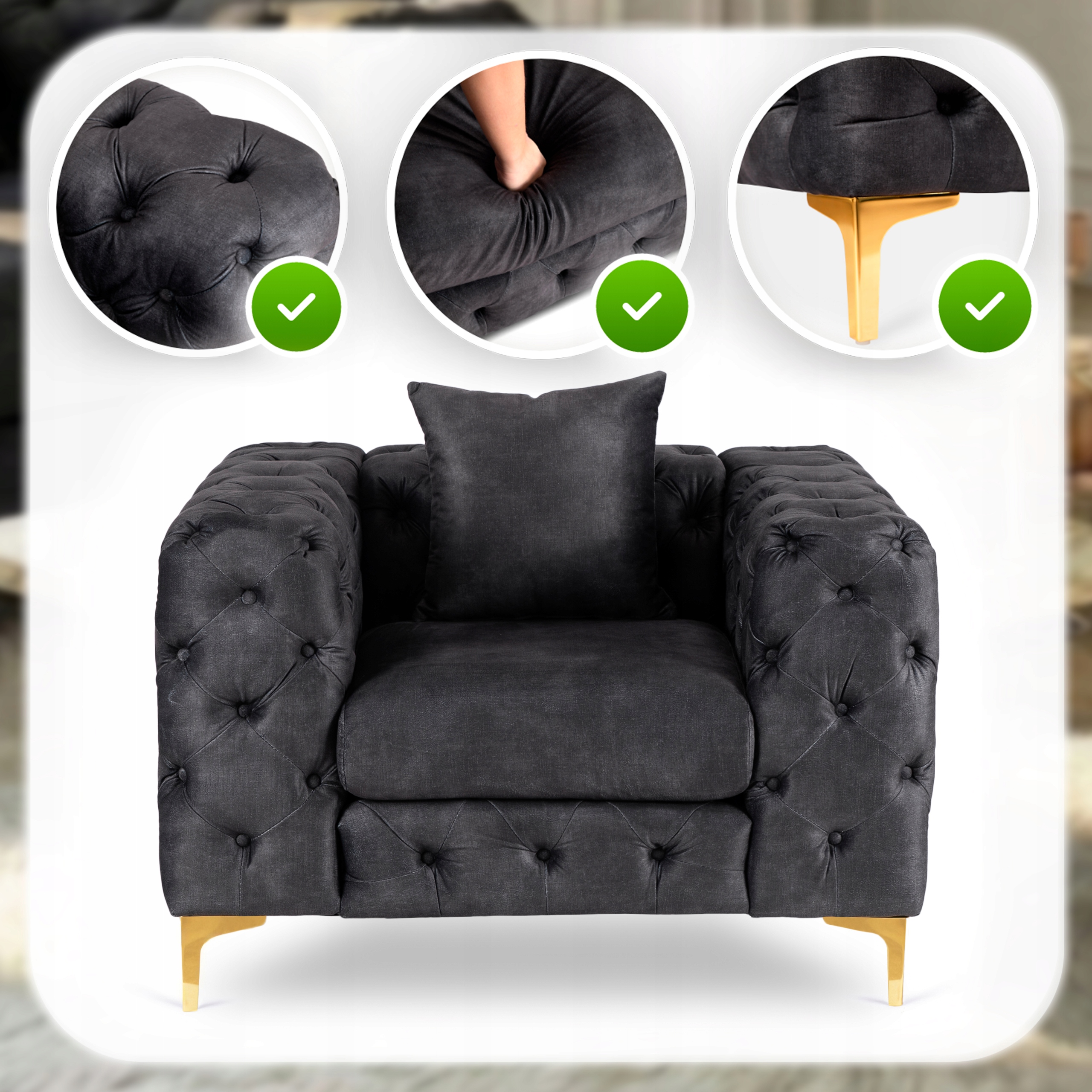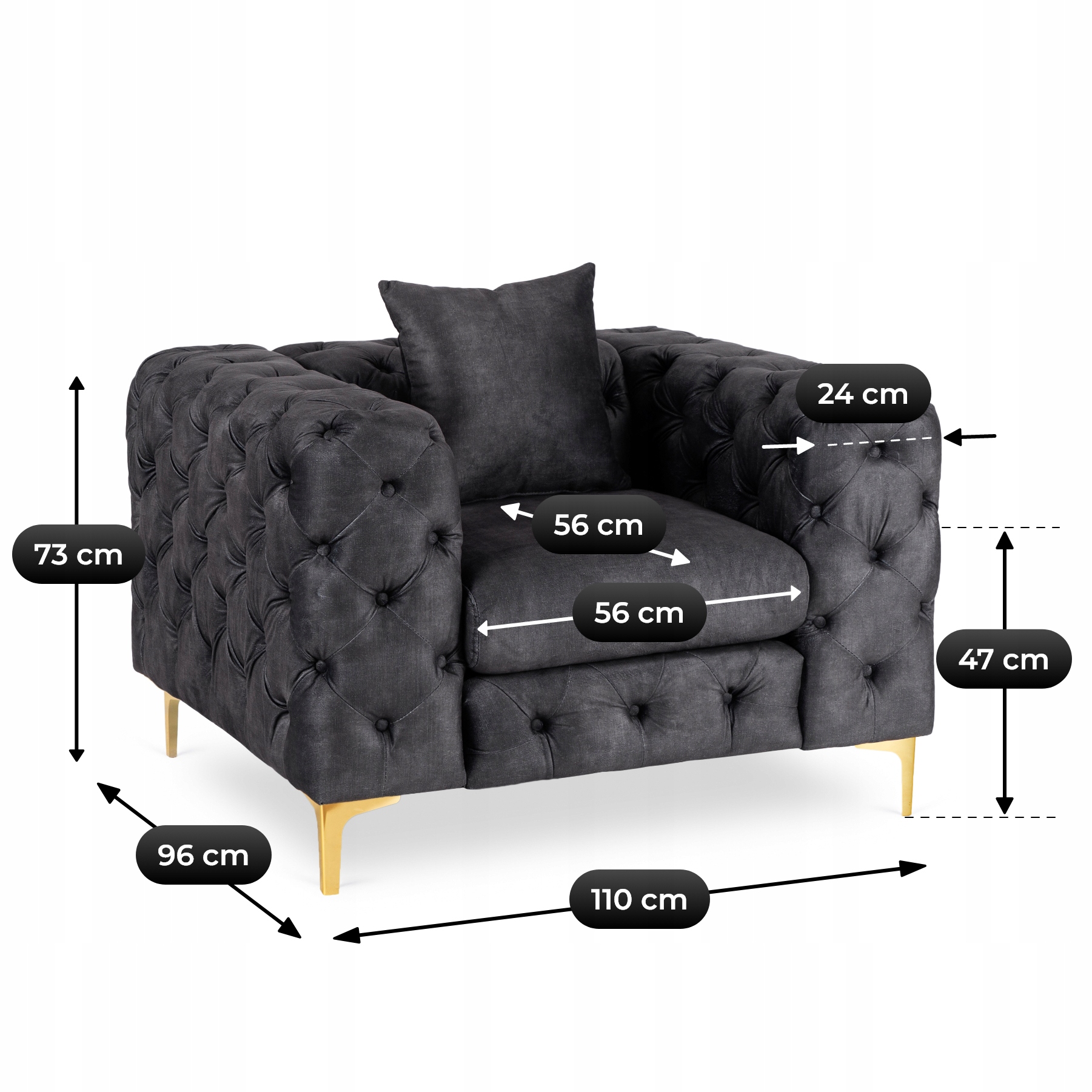 Fotel SORRENTO 1S łączy w sobie luksusowy wygląd z najwyższym poziomem komfortu. Jego ciemno szary odcień wprowadza do pomieszczenia elegancję a głębokie pikowania nadają mu wyjątkowy charakter. To mebel, który zachwyca od pierwszego spojrzenia i zaprasza do relaksu.