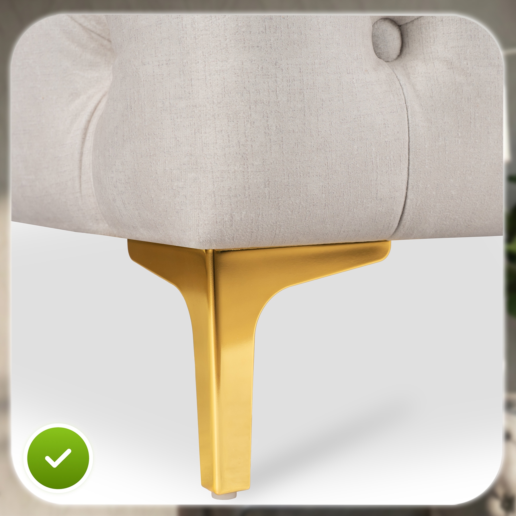 Fotel SORRENTO 1S został osadzony na wysokich nóżkach, które gwarantują pełną stabilność i trwałość konstrukcji. Ich złoty kolor tworzy elegancki kontrast z jasną tkaniną, dodając kanapie wyrafinowanego charakteru.