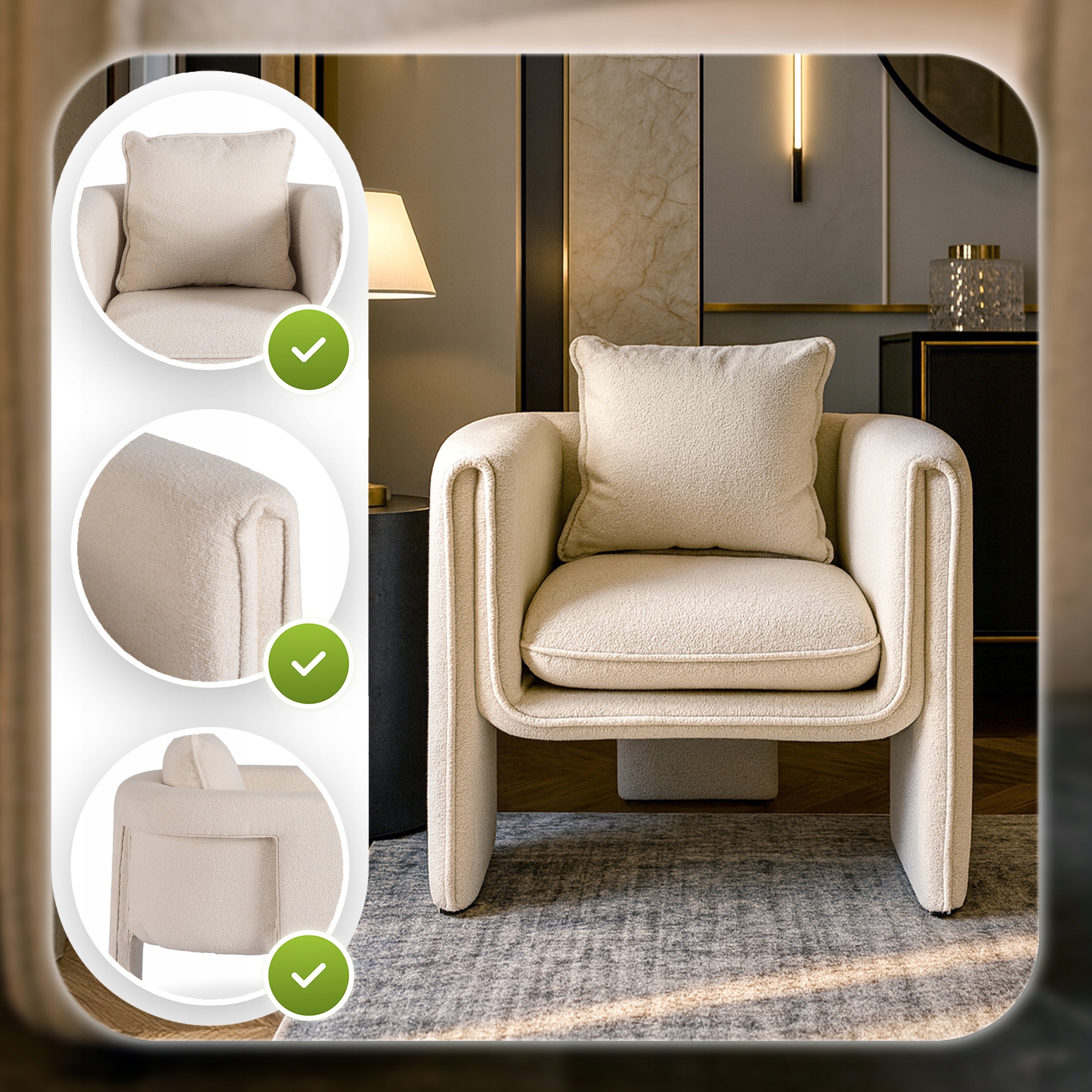 Ten elegancki fotel doskonale odnajdzie się w salonie, sypialni, ale również w przestrzeniach komercyjnych – takich jak salony beauty, gabinety kosmetyczne, poczekalnie, hotele czy kawiarnie.