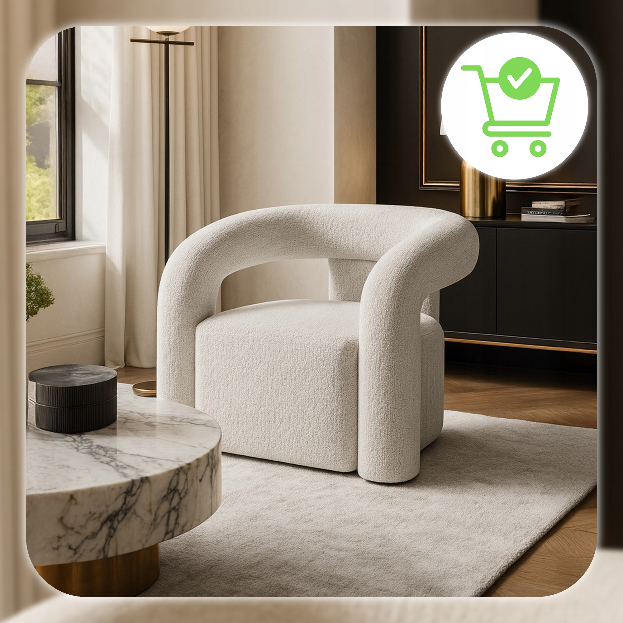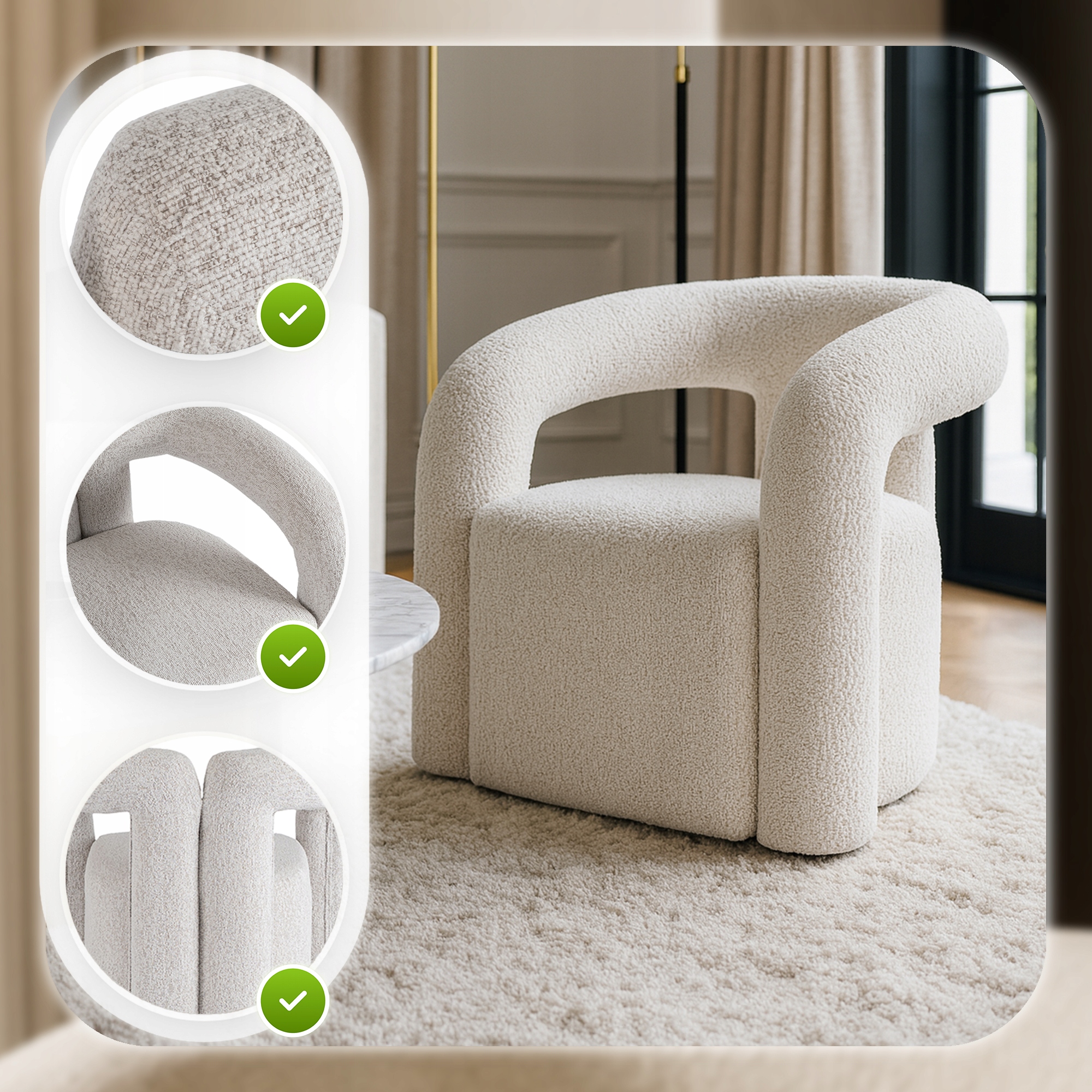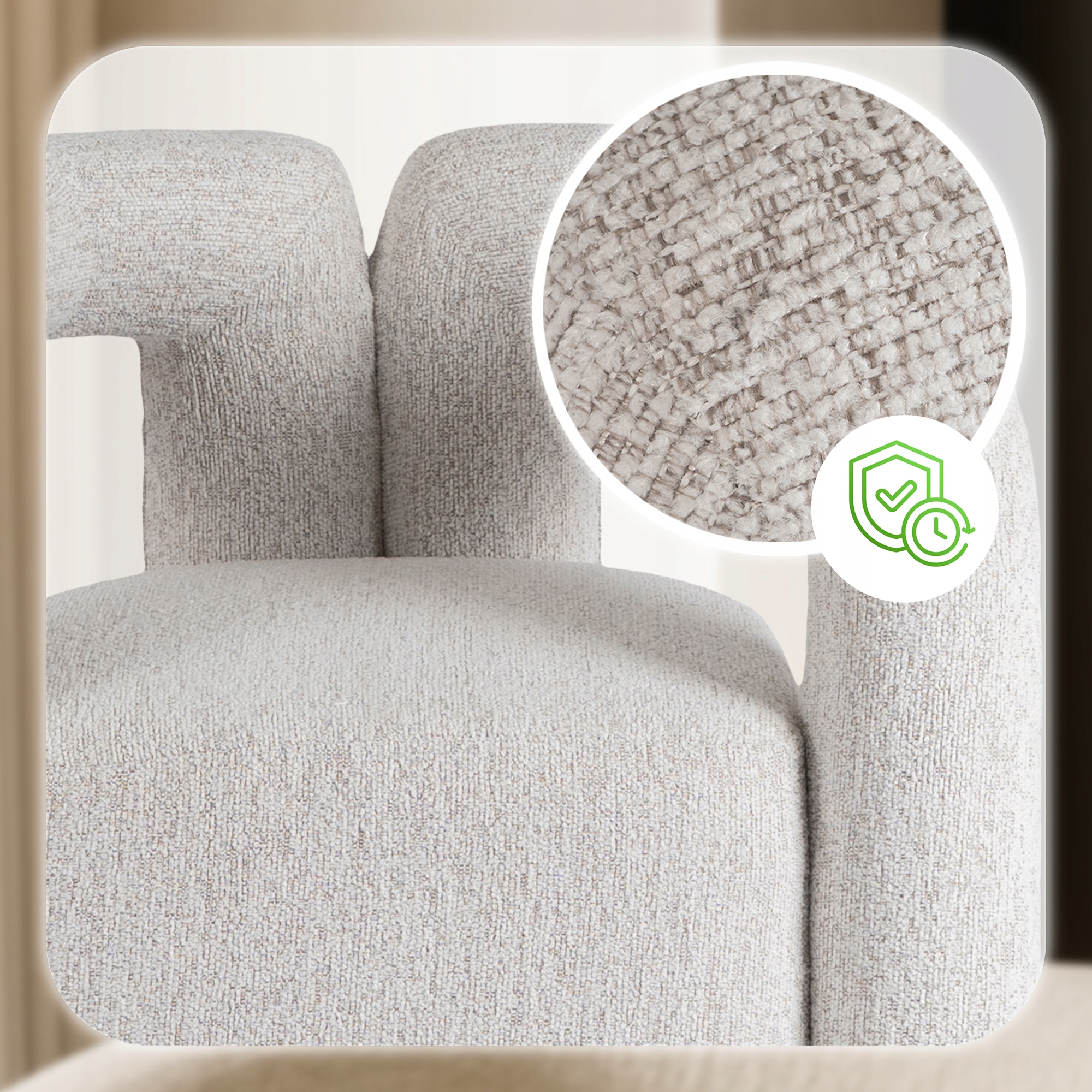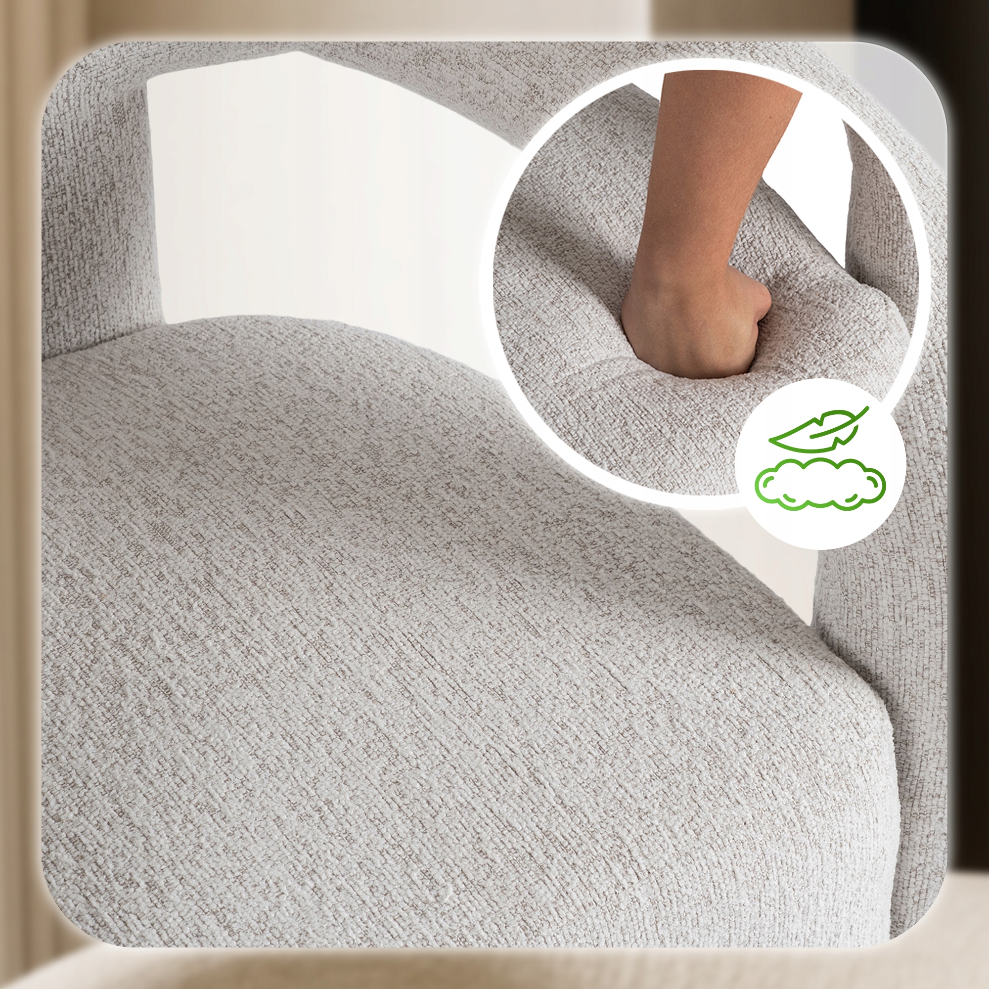Obszerne, miękkie siedzisko o wspierającej strukturze gwarantuje niezrównany komfort użytkowania. Dzięki wysokiej jakości wypełnieniu dopasowuje się do ciała, odciąża plecy i pozwala na wygodne siedzenie przez długi czas – zarówno podczas spotkań przy kawie, jak i chwil relaksu w ciągu dnia. Miękkie siedzisko sprawia, że każda chwila staje się wyjątkowo komfortowa.