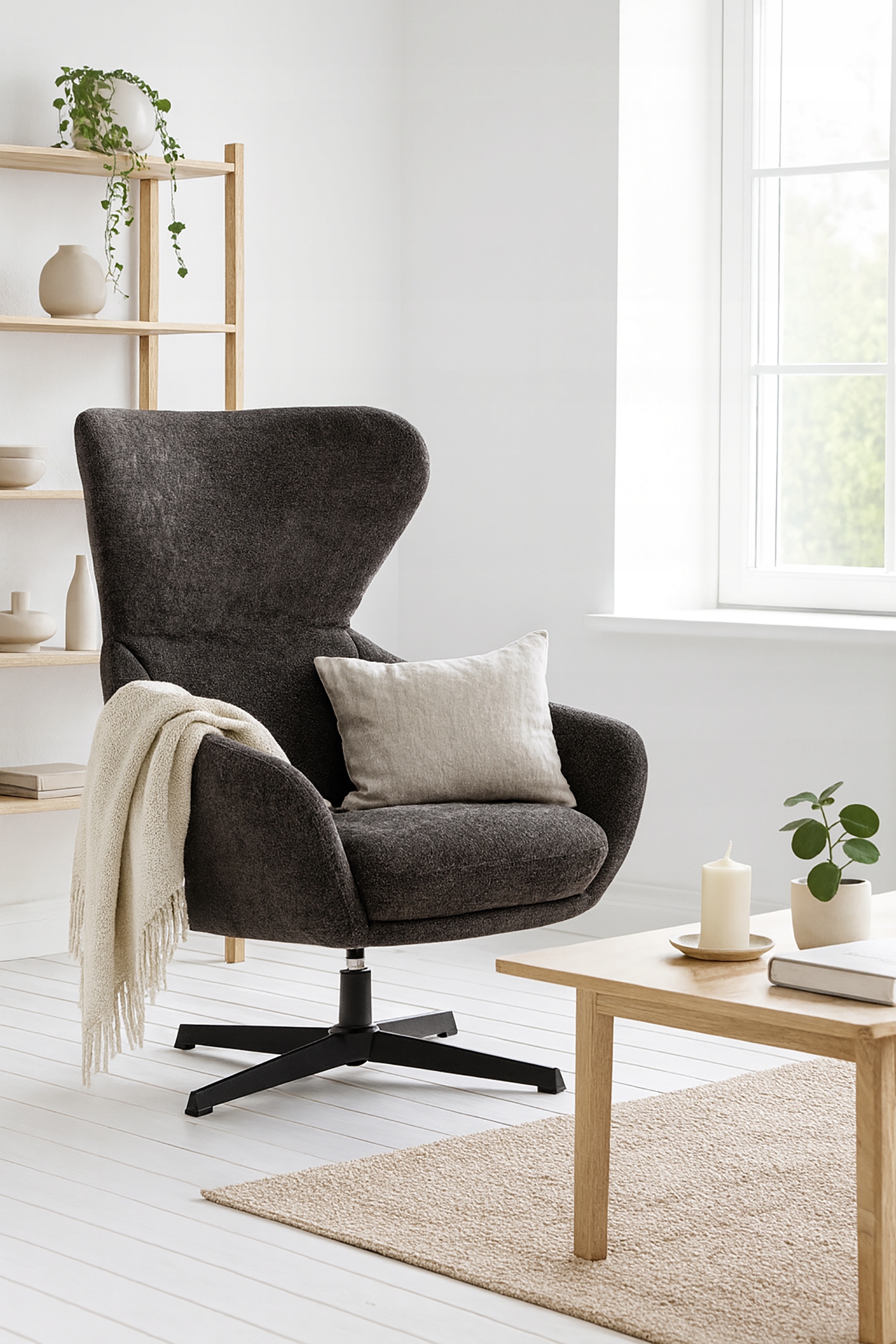 Miękka tkanina o przyjemnej strukturze w modnym ciemno szarym odcieniu dodaje wnętrzu przytulności i naturalnego uroku, idealnie wpisując się w nowoczesne trendy aranżacyjne.