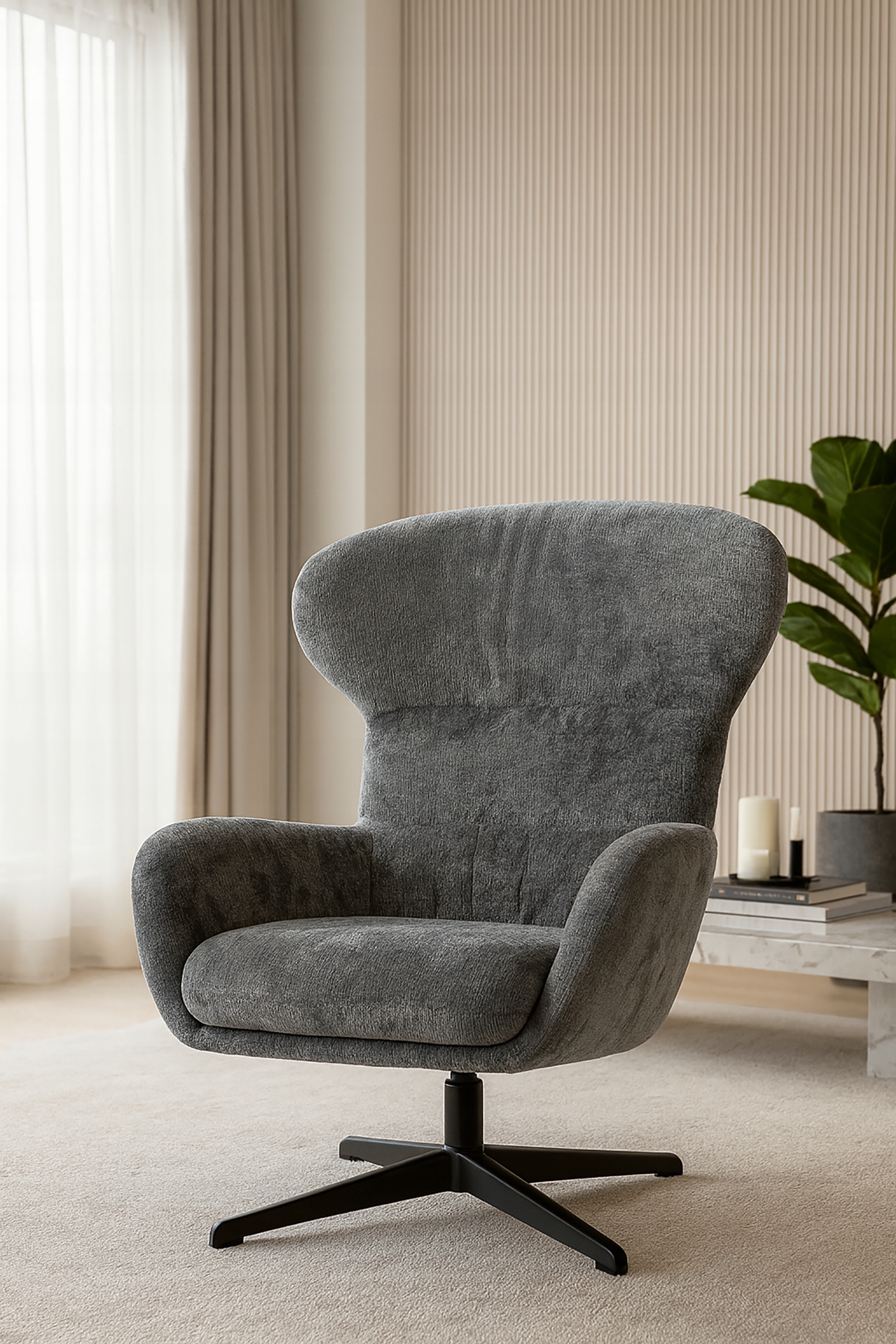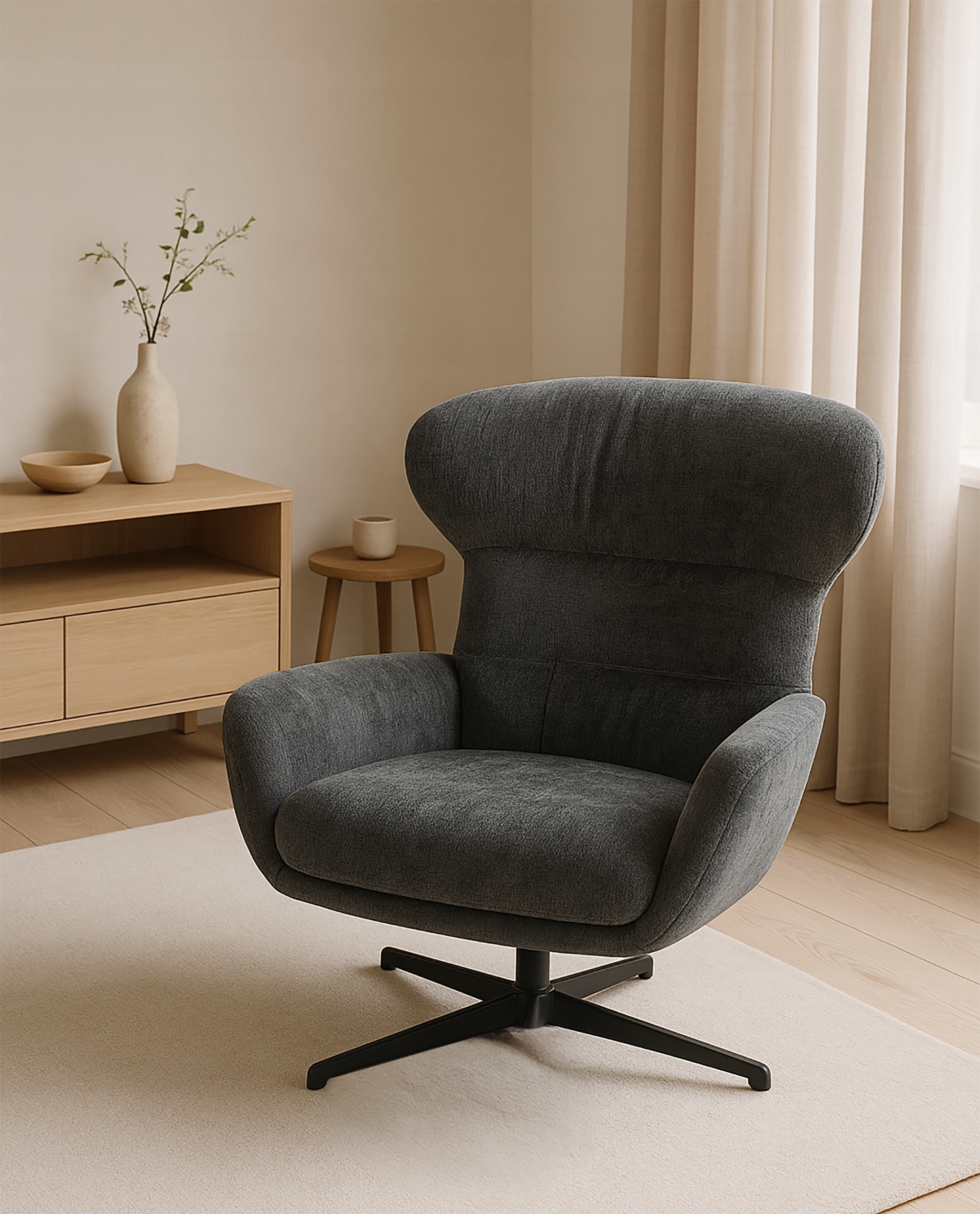 Miękka tkanina o przyjemnej strukturze w modnym ciemno szarym odcieniu dodaje wnętrzu przytulności i naturalnego uroku, idealnie wpisując się w nowoczesne trendy aranżacyjne.
