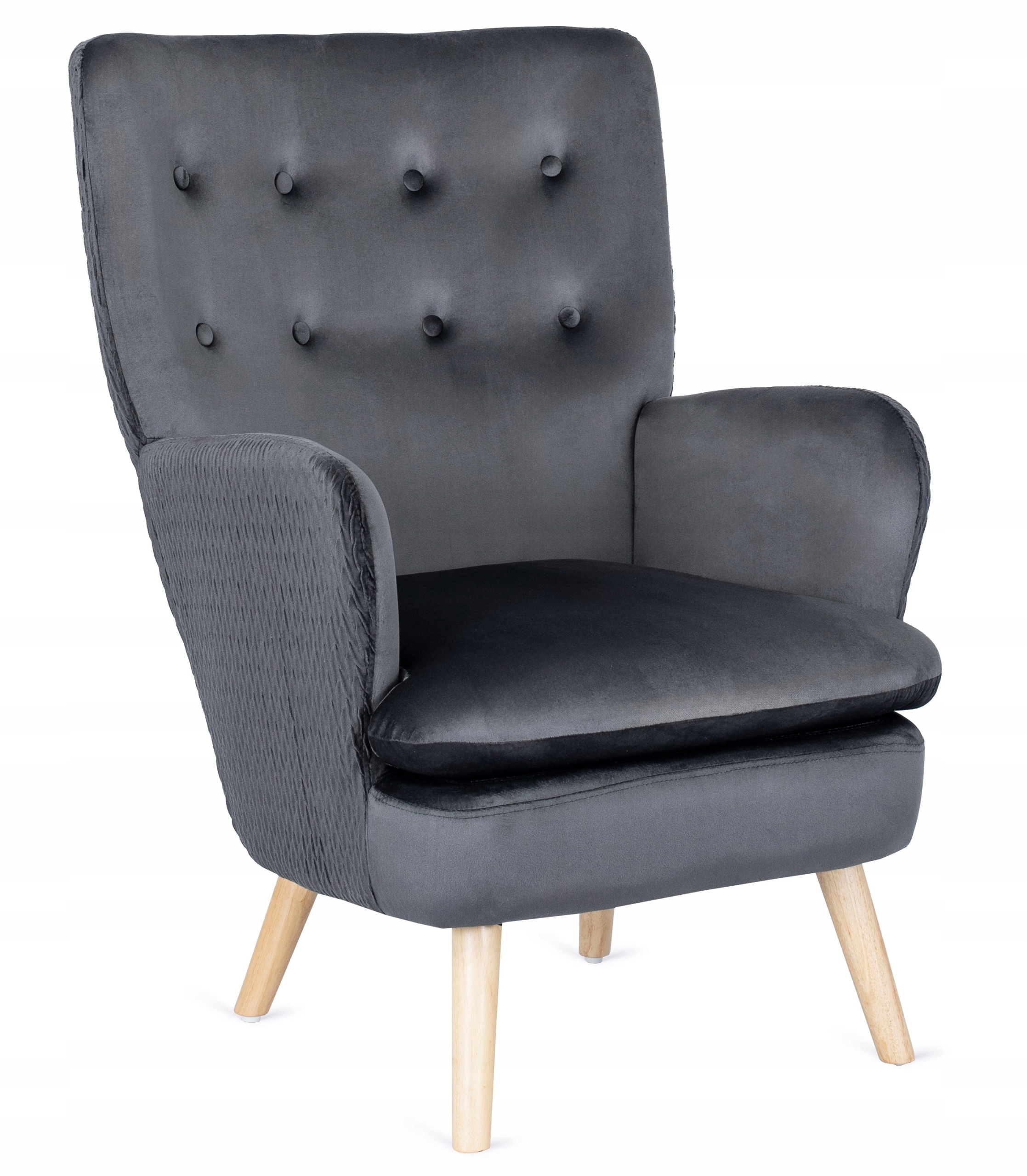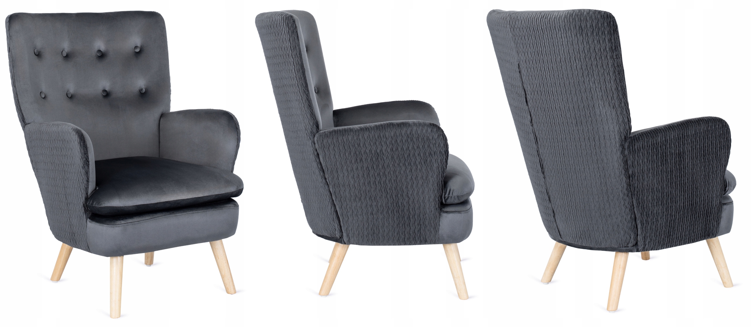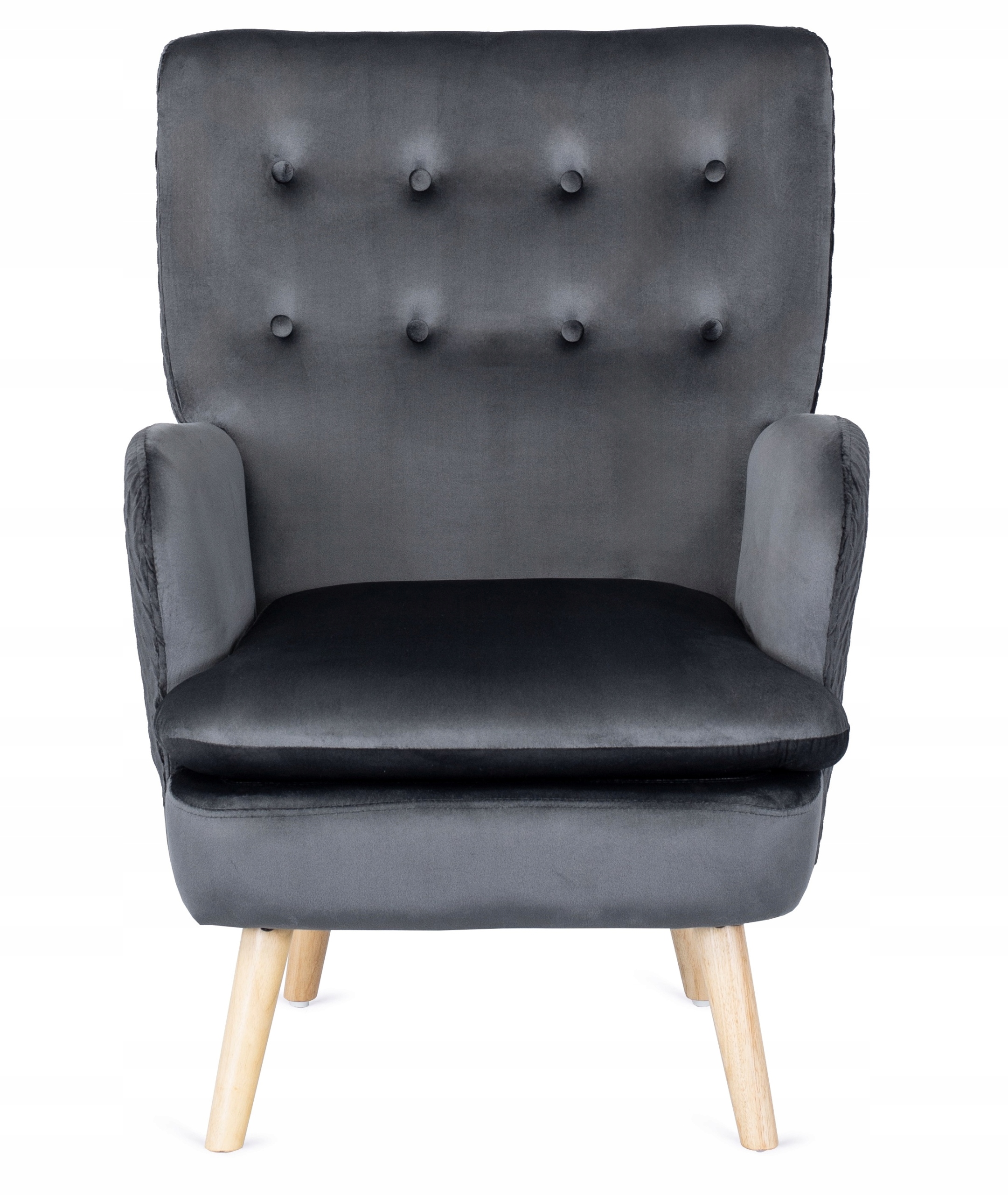 Wysokie, delikatnie profilowane nóżki o zaokrąglonym kształcie wyglądają gustownie. Są wykonane z drewna w naturalnym kolorze. Zapewniają stabilność i wytrzymałość fotela.