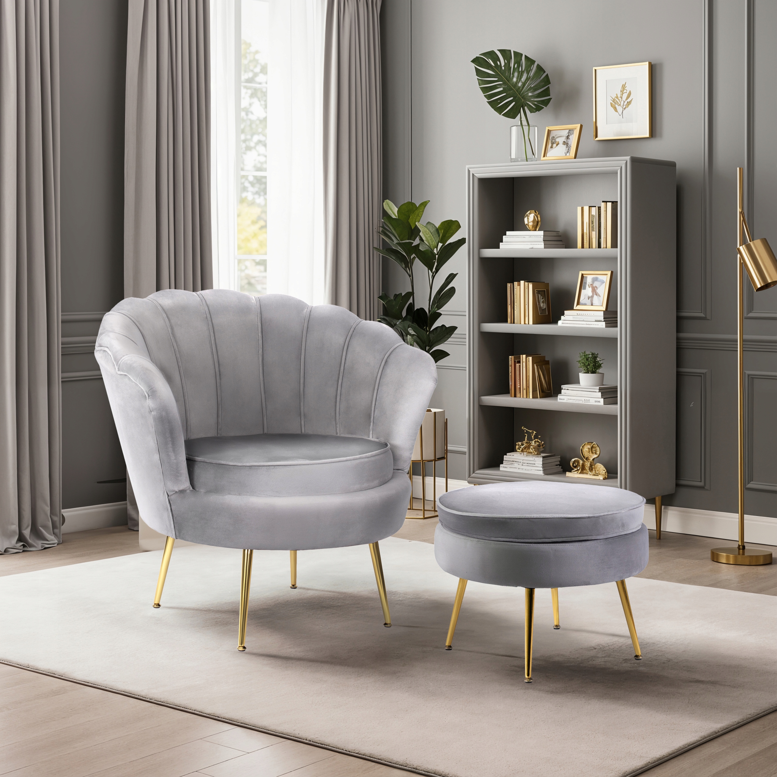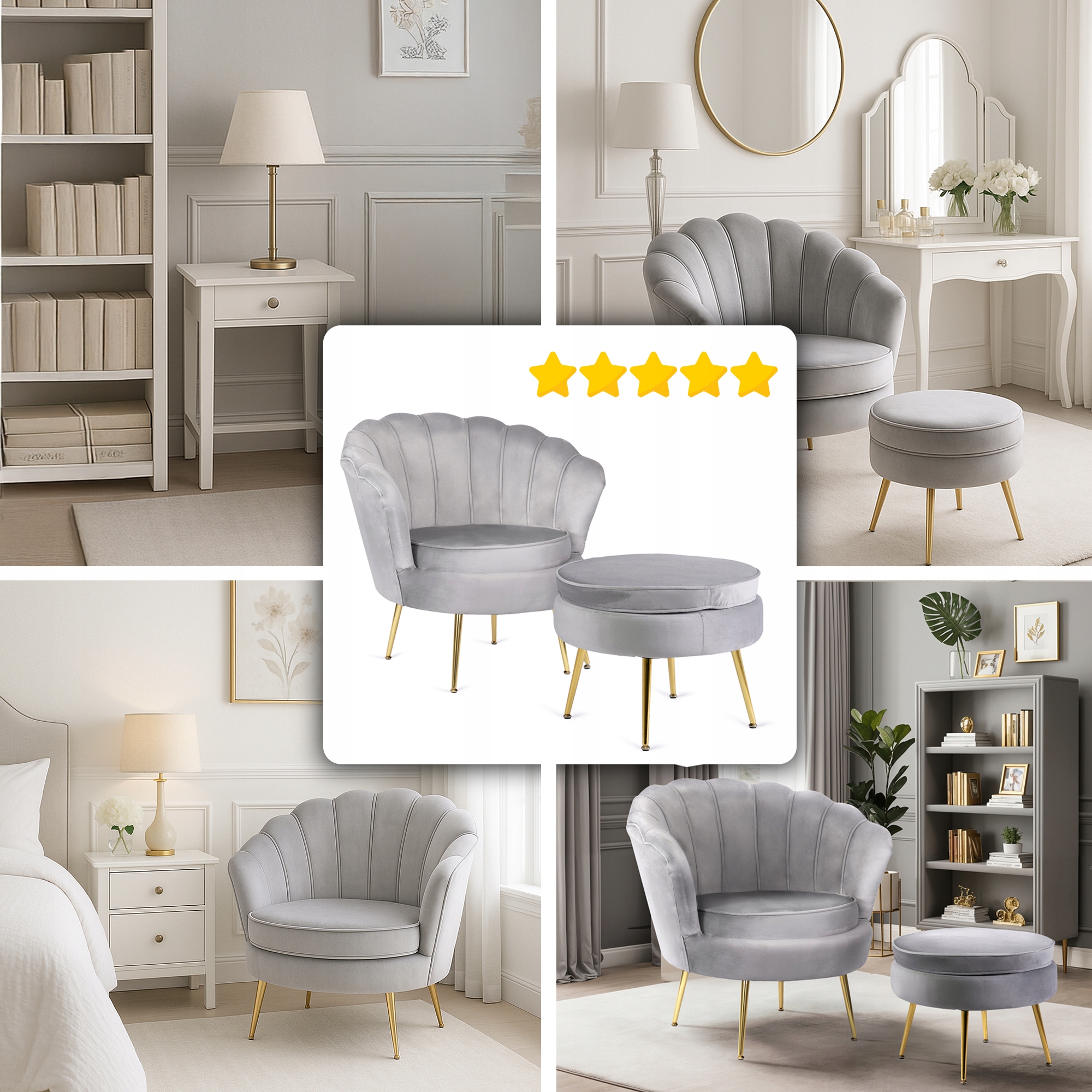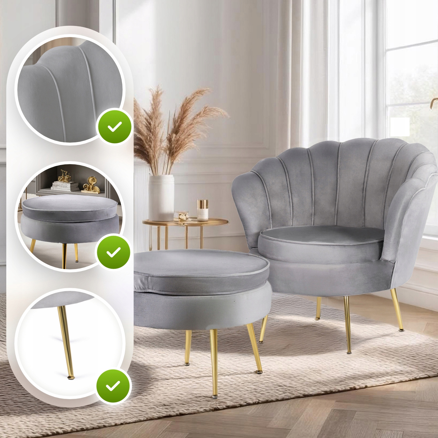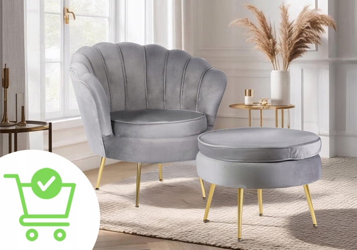 ✨ Fotel Wypoczynkowy z Podnóżkiem Do Salonu Welurowy Muszelka GRAND Szary