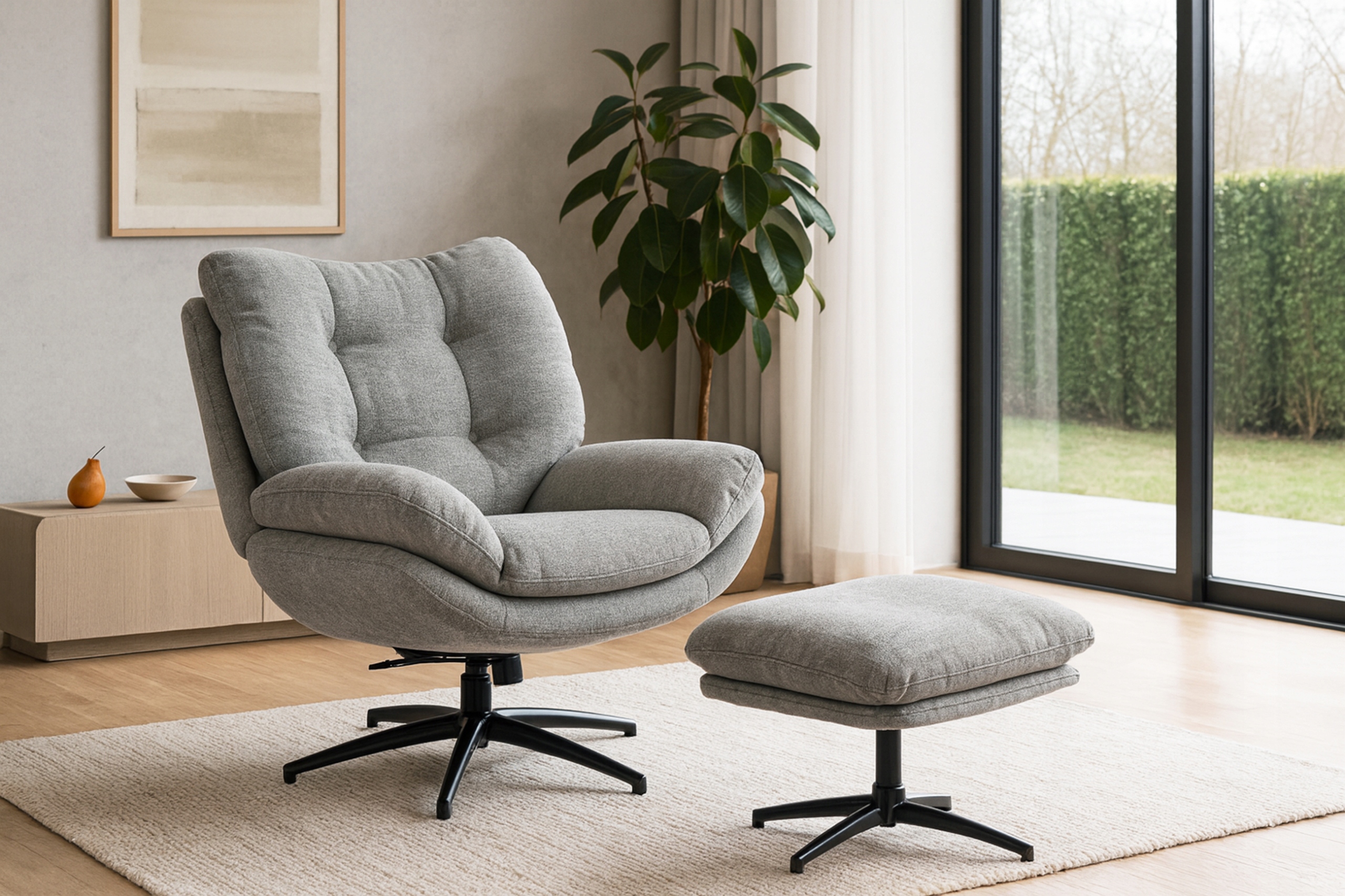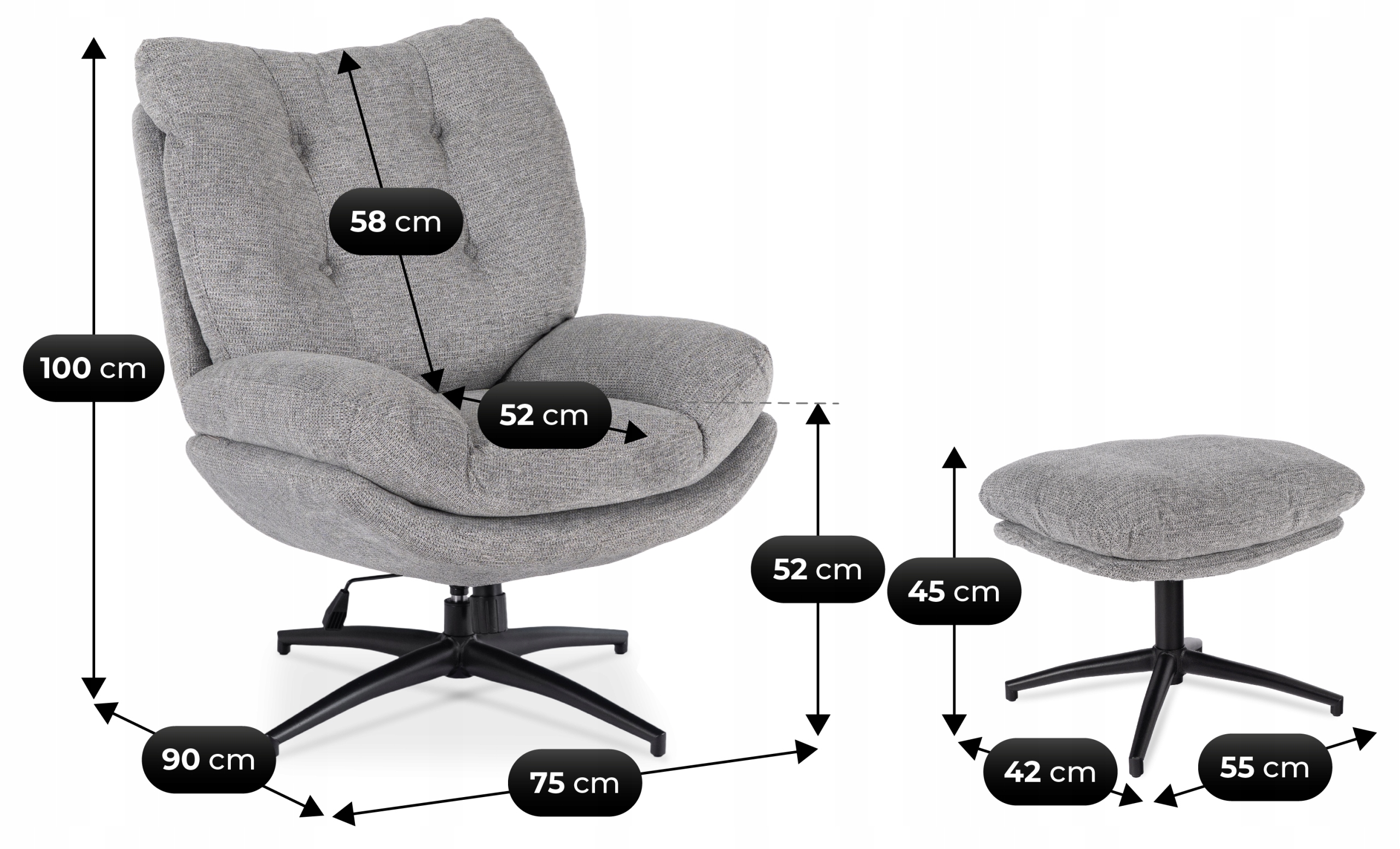 Nowoczesna forma, miękkie obszerne siedzisko i unikalne przeszycia sprawiają, że fotel przyciąga spojrzenia. W zestawie znajduje się wolnostojący podnóżek, który możesz ustawić w dowolnej odległości, dopasowując pozycję nóg do własnych potrzeb.