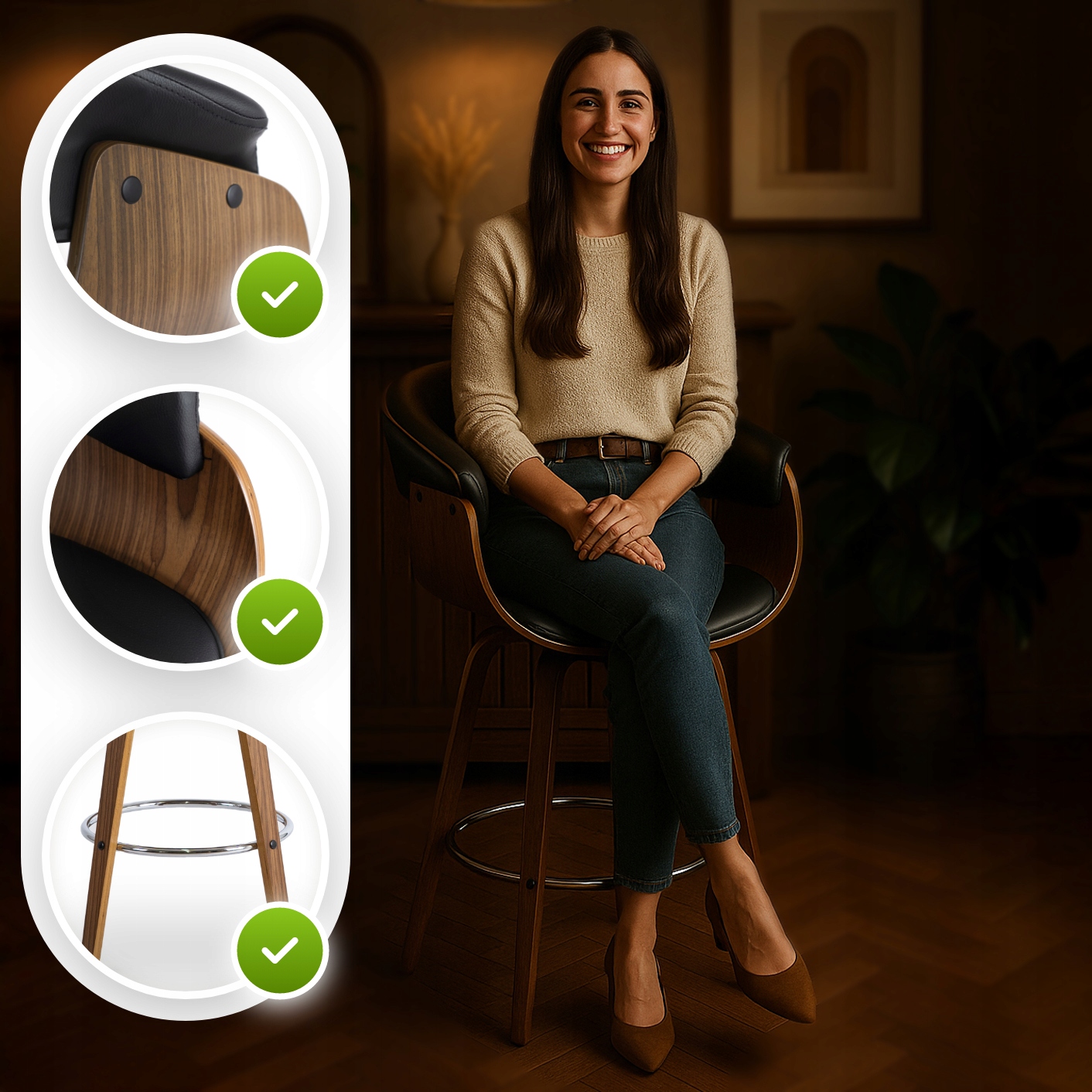 Hoker wykonany jest z drewna giętego, co zapewnia nie tylko piękny wygląd, ale też solidność konstrukcji. Miękkie siedzisko z ekoskóry sprawia, że siedzenie jest wygodne nawet przez dłuższy czas. Stabilne nogi i metalowy podnóżek to gwarancja komfortu i trwałości na lata.