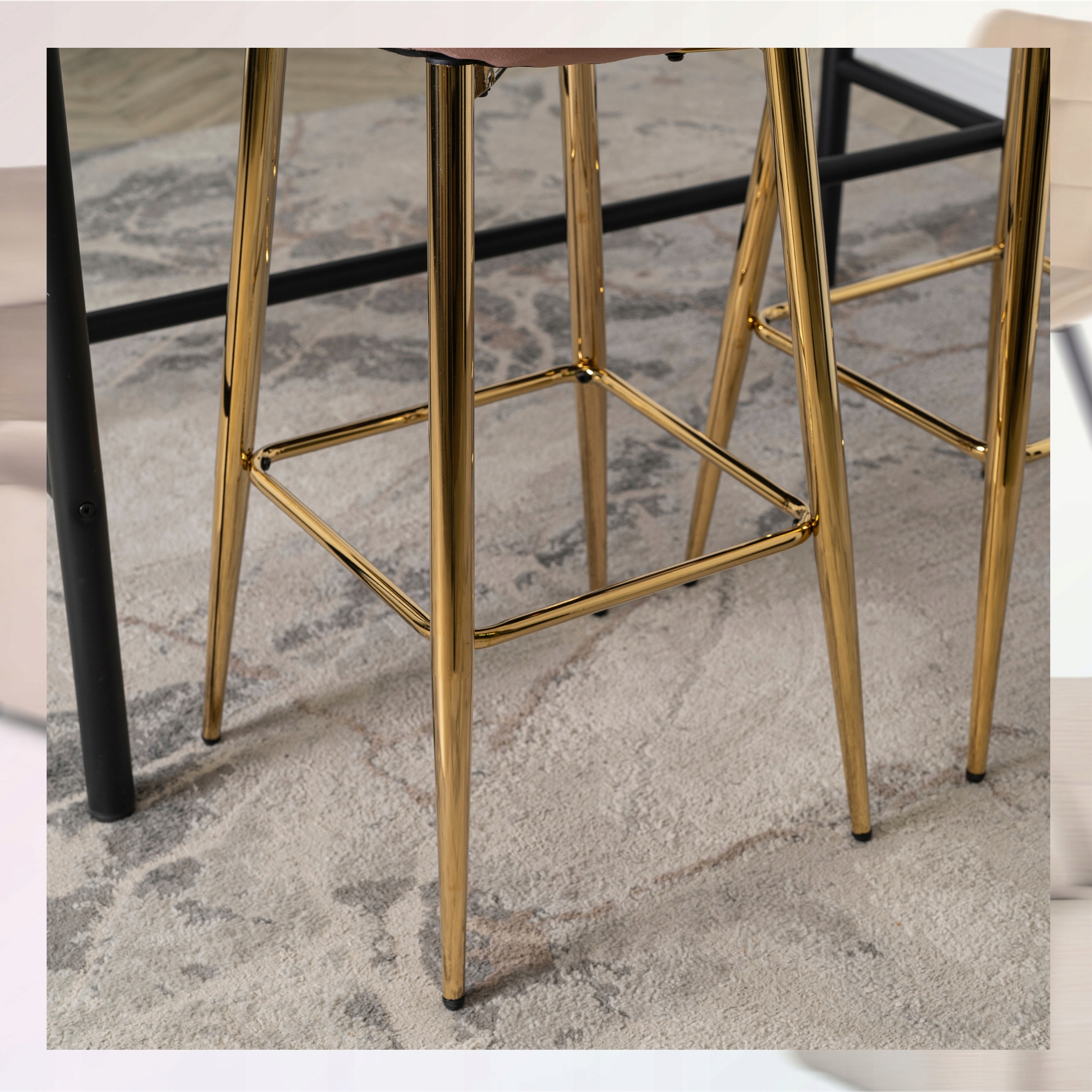 Solidne nogi krzesła wykonane są z metalu, pomalowanego na złoty kolor. Krzesło jest stabilne i trwałe w swojej konstrukcji.