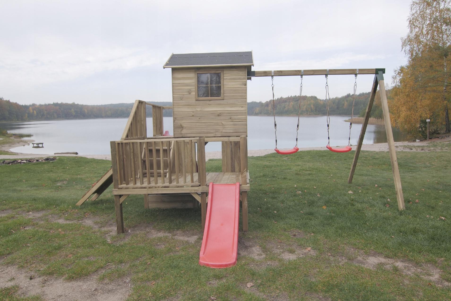 W skład zestawu wchodzi: drewno, łącznik potrójny 1 sztuka, mocowanie do wieży lub domku, 1 sztuka, 4 objemy do huśtawki, 2 huśtawki