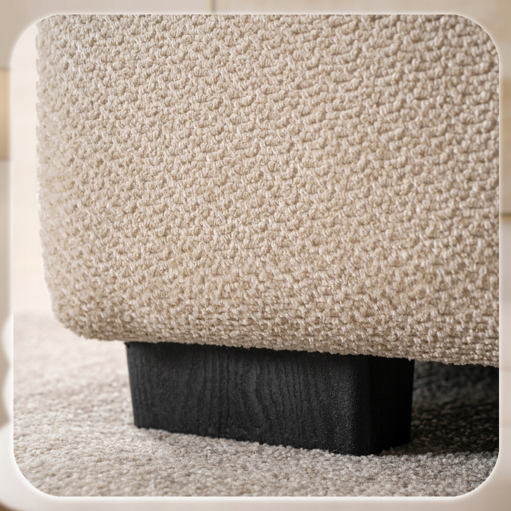 Kanapa MODERNO została osadzona na niskich nóżkach, które gwarantują pełną stabilność i trwałość konstrukcji. Ich czarny, kolor tworzy elegancki kontrast z jasną tkaniną, dodając kanapie wyrafinowanego charakteru.