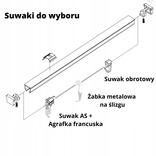 - dokręcana na śrubkę przez tworząc przy tym jednocześnie ogranicznik wysunięcia się ślizgu z karnisza
