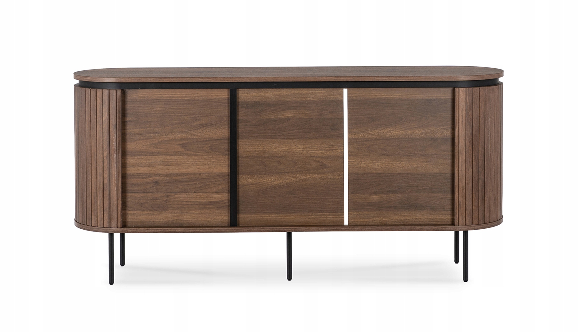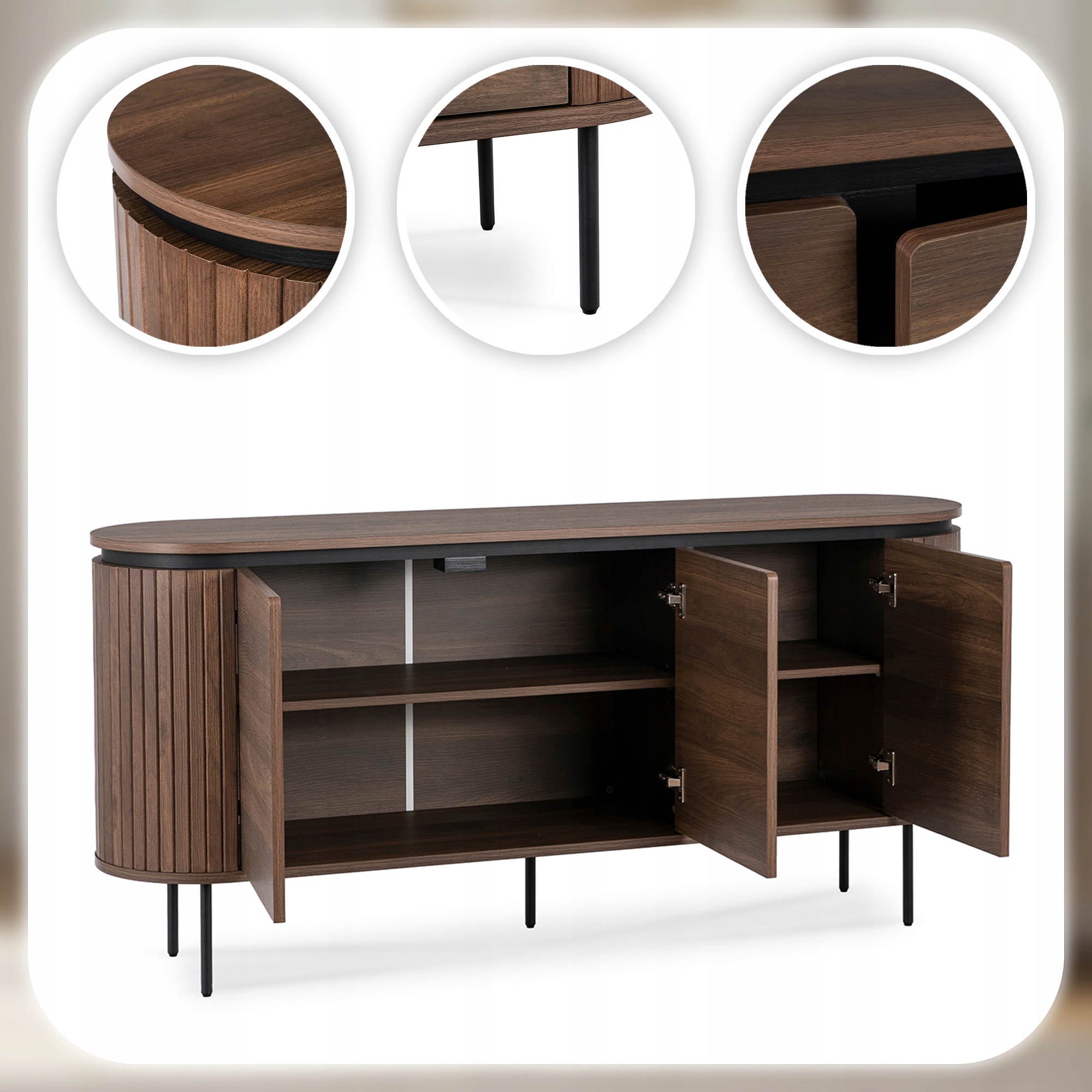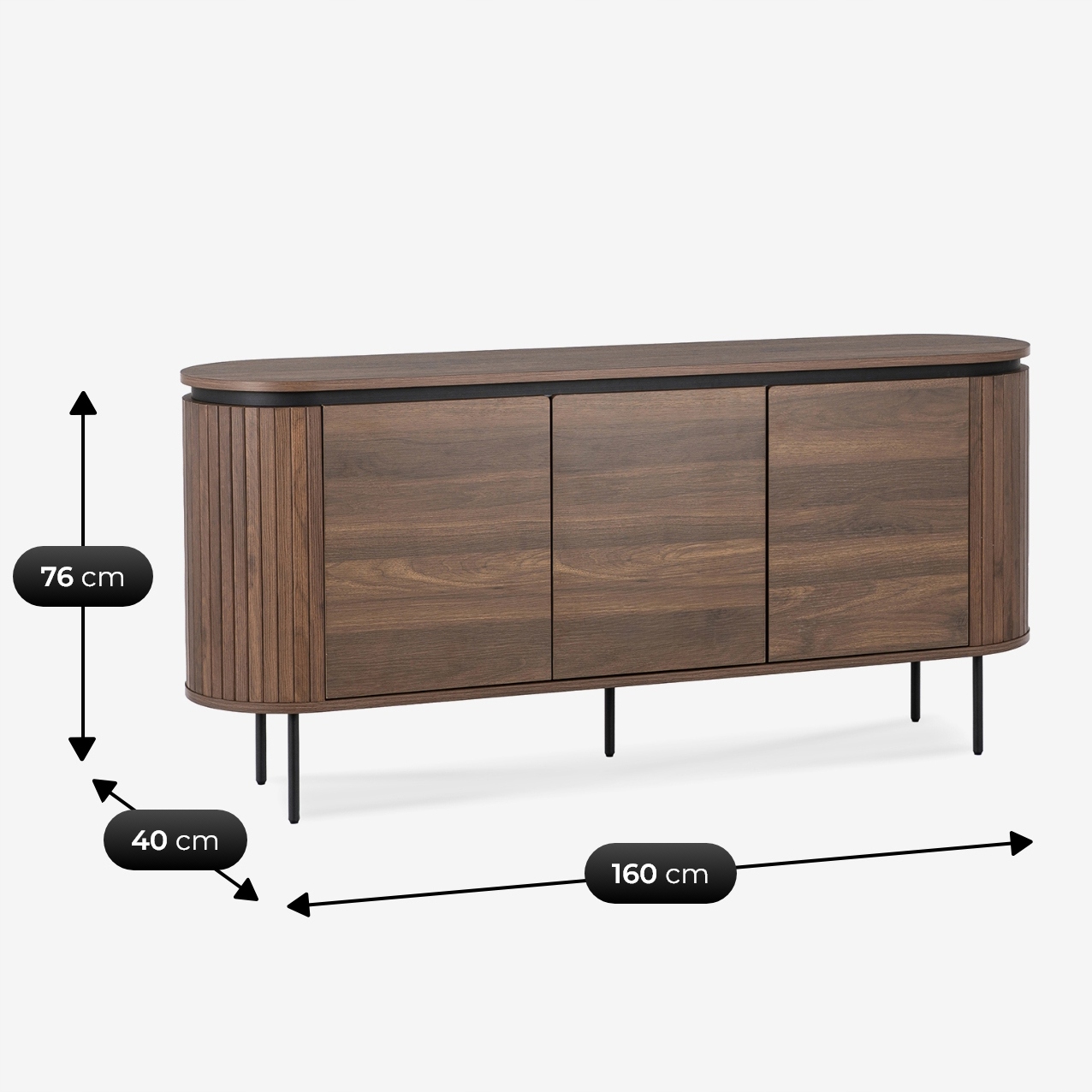 Komoda o wymiarach 160 x 40 x 76 cm to nowoczesny i funkcjonalny mebel idealny do salonu, sypialni. Jej design podkreślają stylowe lamele oraz zaokrąglone boki. Wyposażona jest w drzwi z mechanizmem cichego domyku.