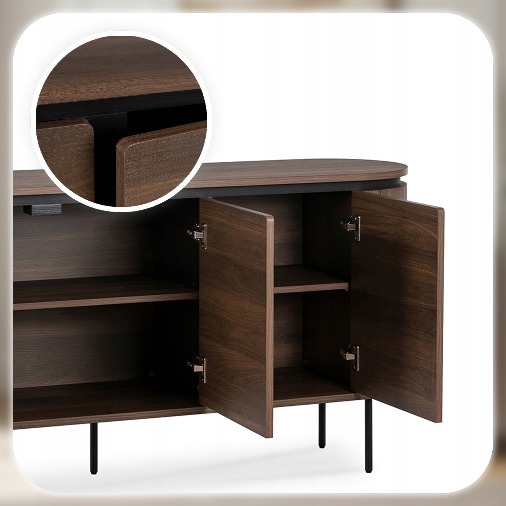 Korpus i półki komody wykonane są z wysokiej jakości płyty o naturalnym wykończeniu w kolorze orzechowym.